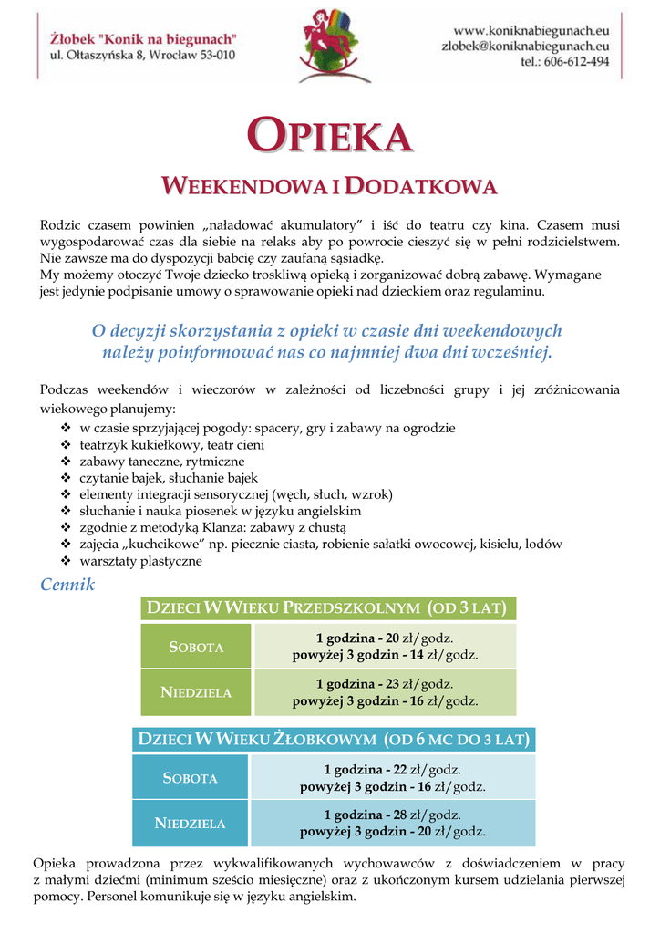 OPIEKA WEEKENDOWA I DODATKOWA Rodzic czasem powinien „naładować akumulatory” i iść do teatru czy kina. Czasem musi wygospodarować czas dla siebie na relaks aby po powrocie cieszyć się w pełni rodzicielstwem. Nie zawsze ma do dyspozycji babcię czy zaufaną sąsiadkę. My możemy otoczyć Twoje dziecko troskliwą opieką i zorganizować dobrą zabawę. Wymagane jest jedynie podpisanie umowy o sprawowanie opieki nad dzieckiem oraz regulaminu. O decyzji skorzystania z opieki w czasie dni weekendowych należy poinformować nas co najmniej dwa dni wcześniej. Podczas weekendów i wieczorów w zależności od liczebności grupy i jej zróżnicowania wiekowego planujemy: w czasie sprzyjającej pogody: spacery, gry i zabawy na ogrodzie teatrzyk kukiełkowy, teatr cieni zabawy taneczne, rytmiczne czytanie bajek, słuchanie bajek elementy integracji sensorycznej (węch, słuch, wzrok) słuchanie i nauka piosenek w języku angielskim zgodnie z metodyką Klanza: zabawy z chustą zajęcia „kuchcikowe” np. piecznie ciasta, robienie sałatki owocowej, kisielu, lodów warsztaty plastyczne Cennik DZIECI W WIEKU PRZEDSZKOLNYM (OD 3 LAT) SOBOTA 1 godzina - 20 zł/godz. powyżej 3 godzin - 14 zł/godz. NIEDZIELA 1 godzina - 23 zł/godz. powyżej 3 godzin - 16 zł/godz. DZIECI W WIEKU ŻŁOBKOWYM (OD 6 MC DO 3 LAT) SOBOTA 1 godzina - 22 zł/godz. powyżej 3 godzin - 16 zł/godz. NIEDZIELA 1 godzina - 28 zł/godz. powyżej 3 godzin - 20 zł/godz. Opieka prowadzona przez wykwalifikowanych wychowawców z doświadczeniem w pracy z małymi dziećmi (minimum sześcio miesięczne) oraz z ukończonym kursem udzielania pierwszej pomocy. Personel komunikuje się w języku angielskim.