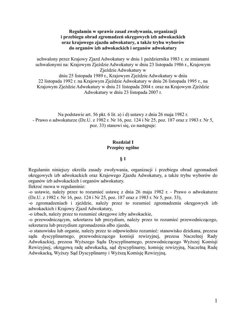 Regulamin w sprawie zasad zwoływania, organizacji i przebiegu obrad zgromadzeń okręgowych izb adwokackich oraz krajowego zjazdu adwokatury, a także trybu wyborów do organów izb adwokackich i organów adwokatury uchwalony przez Krajowy Zjazd Adwokatury w dniu 1 października 1983 r. ze zmianami uchwalonymi na: Krajowym Zjeździe Adwokatury w dniu 23 listopada 1986 r., Krajowym Zjeździe Adwokatury w dniu 25 listopada 1989 r., Krajowym Zjeździe Adwokatury w dniu 22 listopada 1992 r. na Krajowym Zjeździe Adwokatury w dniu 26 listopada 1995 r., na Krajowym Zjeździe Adwokatury w dniu 21 listopada 2004 r. oraz na Krajowym Zjeździe Adwokatury w dniu 23 listopada 2007 r. Na podstawie art. 56 pkt. 6 lit. a) i d) ustawy z dnia 26 maja 1982 r. - Prawo o adwokaturze (Dz.U. z 1982 r. Nr 16, poz. 124 i Nr 25, poz. 187 oraz z 1983 r. Nr 5, poz. 33) stanowi się, co następuje: Rozdział I Przepisy ogólne §1 Regulamin niniejszy określa zasady zwoływania, organizacji i przebiegu obrad zgromadzeń okręgowych izb adwokackich oraz Krajowego Zjazdu Adwokatury, a także trybu wyborów do organów izb adwokackich i organów adwokatury. Ilekroć mowa w regulaminie: -o ustawie, należy przez to rozumieć ustawę z dnia 26 maja 1982 r. - Prawo o adwokaturze (Dz.U. z 1982 r. Nr 16, poz. 124 i Nr 25, poz. 187 oraz z 1983 r. Nr 5, poz. 33), -o zgromadzeniach i zjeździe, należy przez to rozumieć zgromadzenia okręgowych izb adwokackich i Krajowy Zjazd Adwokatury, -o izbach, należy przez to rozumieć okręgowe izby adwokackie, -o przewodniczącym, sekretarzu lub prezydium, należy przez to rozumieć przewodniczącego, sekretarza lub prezydium zgromadzenia albo zjazdu, -o stanowisku lub organie, należy przez to odpowiednio rozumieć: stanowisko dziekana, prezesa sądu dyscyplinarnego, przewodniczącego komisji rewizyjnej, prezesa Naczelnej Rady Adwokackiej, prezesa Wyższego Sądu Dyscyplinarnego, przewodniczącego Wyższej Komisji Rewizyjnej, okręgową radę adwokacką, sąd dyscyplinarny, komisję rewizyjną, Naczelną Radę Adwokacką, Wyższy Sąd Dyscyplinarny i Wyższą Komisję Rewizyjną. 1 Rozdział II Zgromadzenia i zjazd §3 1.Zgromadzenia odbywają się w siedzibach okręgowych rad adwokackich. 2.Zjazd odbywa się w Warszawie, a w uzasadnionych wypadkach może być zwołany w innym mieście będącym siedzibą okręgowej rady adwokackiej. §4 1.Zgromadzenia i zjazd obradują i podejmują uchwały na sesjach plenarnych. 2.Organy te mogą powoływać komisje tematyczne, które przedstawiają propozycje uchwał sesji plenarnej. §5 1.Okręgowa rada adwokacka zwołuje zgromadzenie, zawiadamiając o tym Naczelną Radę Adwokacką co najmniej na 14 dni przed terminem jego zwołania. 2.Naczelna Rada Adwokacka zwołuje zjazd, zawiadamiając o tym izby co najmniej na 14 dni przed terminem jego zwołania. §6 1.Zgromadzenia zwyczajne odbywają się każdego roku. 2.Zgromadzenia nadzwyczajne odbywają się w ciągu 6 tygodni od zgłoszenia żądania. 3.Zjazd odbywa się w ciągu miesiąca od daty dokonania wyborów delegatów we wszystkich izbach. Naczelna Rada Adwokacka oznacza termin przeprowadzenia wyborów delegatów w izbach. 4.Nadzwyczajny Zjazd odbywa się w ciągu miesiąca od zgłoszenia żądania, a prawo do uczestniczenia w zjeździe zachowują delegaci wybrani na poprzedzający zwyczajny Krajowy Zjazd Adwokatury. §7 1.Zawiadomienie o terminie, miejscu i porządku obrad - z pouczeniem o obowiązku uczestnictwa - należy przesłać każdemu uprawnionemu do udziału w zgromadzeniu lub zjeździe co najmniej na 14 dni naprzód. Termin ten może być skrócony do 7 dni w przypadku Zjazdu lub Zgromadzenia zwołanego w trybie nadzwyczajnym. 2.Sprawozdanie z działalności organów izby, wnioski komisji rewizyjnej, preliminarz budżetowy z wnioskowaną wysokością składki rocznej oraz projekt określenia potrzeb co do rozmieszczenia zespołów adwokackich, adwokatów i aplikantów adwokackich doręcza się zespołom adwokackim co najmniej w 1 egzemplarzu oraz każdemu z delegatów określonych w art. 39 pkt 1 ustawy i Naczelnej Radzie Adwokackiej w terminie określonym w ustępie poprzedzającym. 3.Sprawozdanie z działalności organów adwokatury, wnioski Wyższej Komisji Rewizyjnej w sprawie zamknięć rachunkowych i udzielenia Naczelnej Radzie Adwokackiej absolutorium 2 przesyła się każdemu delegatowi na Zjazd oraz członkom Naczelnej Rady Adwokackiej, dziekanom izb, prezesowi Wyższego Sądu Dyscyplinarnego i przewodniczącemu Wyższej Komisji Rewizyjnej. 4.Obwieszczenie o zwołaniu zgromadzenia i zjazdu należy wywiesić w lokalu okręgowej rady adwokackiej i w pokojach adwokackich znajdujących się w budynkach sądowych. 5.Osobom uprawnionym przesyła się pisma (ust. 1-3) listem poleconym pod ich adresem domowym; adwokatom wykonującym zawód w zespole adwokackim przesyła się pisma do ich zespołu. §8 Prawo do udziału w obradach zgromadzenia przysługuje: 1)wszystkim członkom izby wykonującym zawód w zespole lub indywidualnie albo wspólnie z innym adwokatem; 2)delegatom adwokatów, o których mowa w art. 39 pkt 1 ustawy; 3)członkom okręgowych rad adwokackich, prezesowi sądu dyscyplinarnego i przewodniczącemu komisji rewizyjnej; 4)przedstawicielom Naczelnej Rady Adwokackiej, Wyższego Sądu Dyscyplinarnego i Wyższej Komisji Rewizyjnej. §9 1.Prawo do udziału w obradach zjazdu przysługuje: a.delegatom na zjazd; b.członkom Naczelnej Rady Adwokackiej oraz dziekanom okręgowych izb adwokackich; c.prezesowi Wyższego Sądu Administracyjnego i przewodniczącemu Wyższej Komisji Rewizyjnej. 2.Mandaty delegatów na zjazd wygasają w dniu dokonania wyboru nowych delegatów na następny zwyczajny Krajowy Zjazd Adwokatury. § 10 1.W zgromadzeniu lub zjeździe mogą uczestniczyć zaproszeni przedstawiciele władz, instytucji i organizacji lub inne osoby. 2.Zaproszenia takie wysyła odpowiednio prezydium okręgowej rady adwokackiej lub Naczelnej Rady Adwokackiej. § 11 1.Obecno