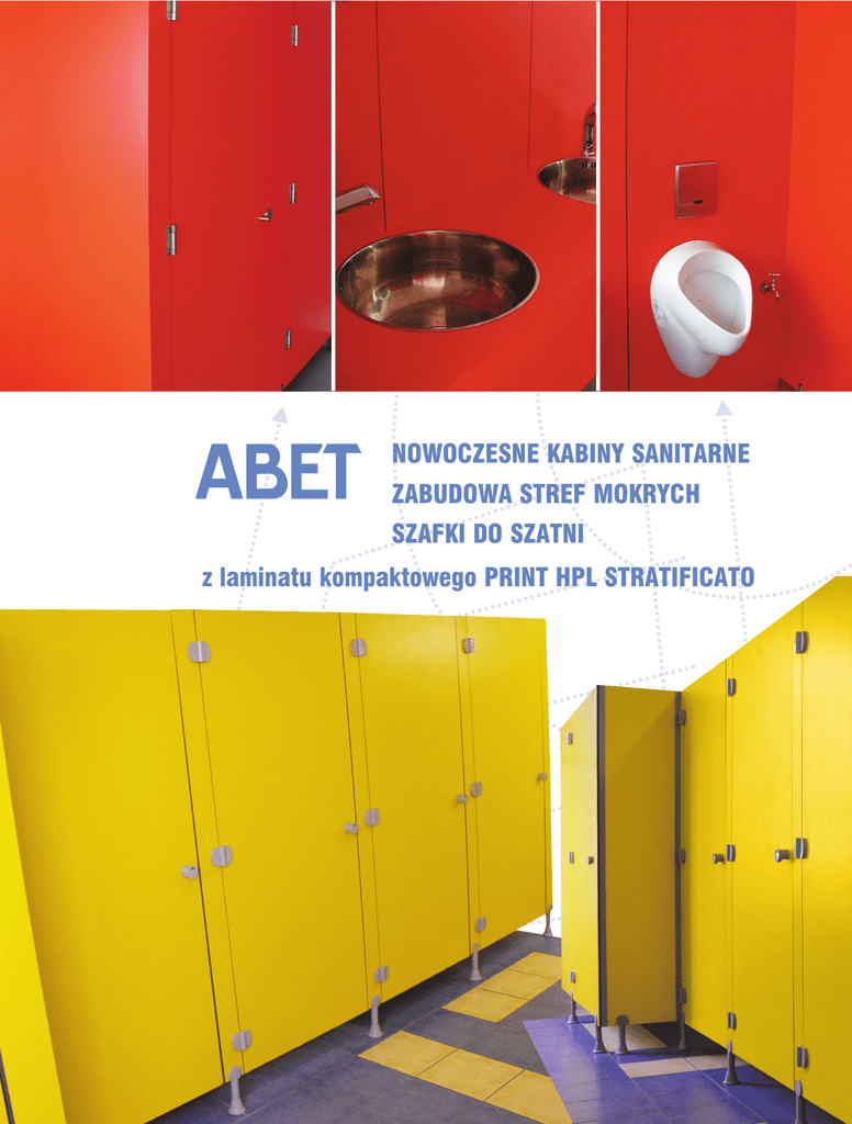 NOWOCZESNE KABINY SANITARNE ZABUDOWA STREF MOKRYCH SZAFKI DO SZATNI z laminatu kompaktowego PRINT HPL STRATIFICATO Print HPL Stratificato to kompaktowy laminat produkowany przez włoską firmę ABET LAMINATI. Charakteryzuje się łatwością utrzymania w czystości i higienie oraz – w odróżnieniu od np. laminowanych płyt wiórowych - wysoką odpornością na uszkodzenia mechaniczne, a także działanie wody i wilgoci. Jest idealnym materiałem do zabudowy tzw. „stref mokrych”. Do montażu służą oferowane z laminatem akcesoria: zawiasy, zamki, stopy, łączniki, itp. Standardowa kolorystyka płyt obejmuje dziewięć kolorów, inne dostępne są na zamówienie. Bogate wzornictwo laminatów pozwala projektantom na przeobrażanie prozaicznych pomieszczeń sanitarnych we wnętrza nie tylko estetyczne, ale bywa, że i wysmakowane. Do wyboru są dwa rodzaje akcesoriów: aluminiowe powlekane nylonem (w czterech kolorach) oraz ze stali nierdzewnej. Standardowe kolory płyt: 813 475 130 445 860 801 406 478 431 Dostępność różnych formatów płyt pozwala na dowolne kształtowanie zabudowy. Mogą to być pełne kabiny toaletowe o różnej wysokości lub tylko proste przegrody prysznicowe, rozbudowane w razie potrzeby o przedsionek i ławeczkę. Laminat może być wykorzystany także jako okładzina ściany, szczególnie w przypadku konieczności zasłonięcia podtynkowych urządzeń sanitarnych. Zabudowę pomieszczenia można uzupełnić o blaty pod umywalki z laminatu Print HPL Stratificato. Zabudowa jest szybka i łatwa, a montaż można przeprowadzić po zakończeniu wszystkich prac budowlanych i instalacyjnych. Laminat można obrabiać na miejscu montażu, co pozwala bez kłopotów niwelować ewentualne błędy wymiarowania. Gotowe kabiny są estetyczne, a ich trwałość pozwala na wieloletnią, bezobsługową wręcz eksploatację. Doskonale zdają egzamin w obiektach użyteczności publicznej, szkołach, szpitalach, halach sportowych, na basenach, w zapleczach socjalnych, toaletach miejskich itp. Dzięki walorom użytkowym i estetycznym Print HPL Stratificato jest wykorzystywany także do produkcji różnego typu szafek szatniowych (basenowych i ubraniowych). Zgodnie z europejskimi normami bezpieczeństwa i higieny wszystkie elementy szafek są wyoblone, bez żadnych ostrych krawędzi i wykonane w sposób eliminujący strefy gromadzenia się brudu. Taka konstrukcja daje możliwość kompletnego ich oczyszczenia przy użyciu wody i detergentów. Na życzenie mogą być wyposażone w aluminiową ławeczkę mocowaną do części frontowej. Szafki montowane są w modułach jedno-, dwu- lub trójkolumnowych. Każda kolumna posiada dwa przedziały na ubrania. W zestawie dostarczane są: wieszak, płytka z numerem oraz zamek motylkowy z zestawem dwóch kluczyków. Możliwe jest również zamknięcie na kłódkę bądź na zamek elektroniczny. Sp. z o.o. ul. Sochaczewska 32, 01-327 Warszawa tel. (22) 666 10 40, (22) 666 05 85, fax (22) 666 03 40 www.abet-spzoo.com.pl Przedstawiciele regionalni Centrum/Wschód: Warszawa, tel. jak wyżej, tel. kom 0-601 85 88 83 Północ: Gdynia tel./fax (58) 662 24 80, tel. kom 0-607 14 12 60 Południe: Gliwice, tel./fax (32) 230 96 92, tel. kom 0-601 30 27 10 Zachód: Poznań, tel./fax (61) 875 89 36, tel. kom 0-601 30 27 15
