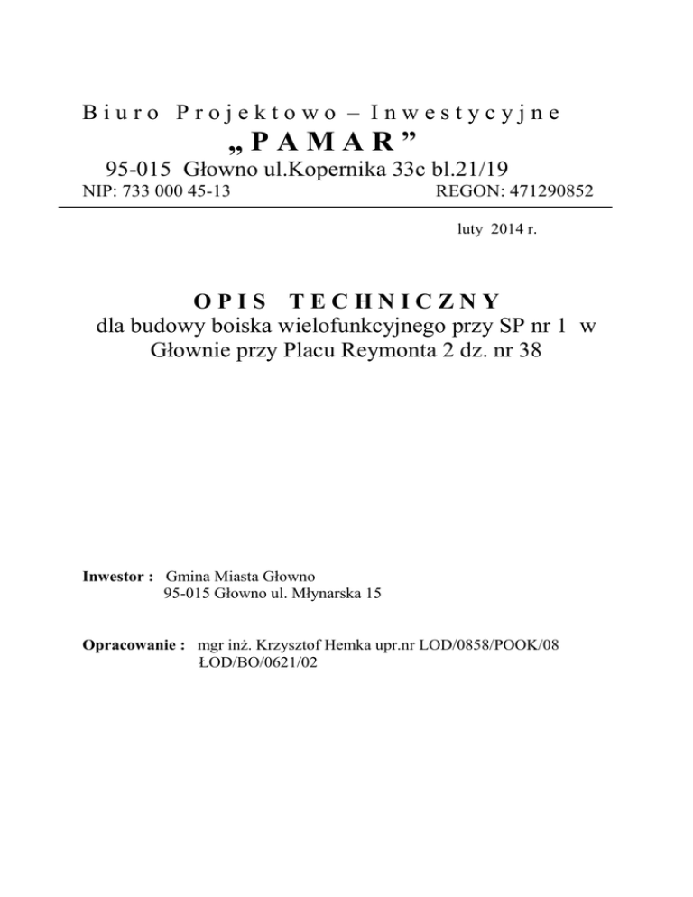 Biuro Projektowo – Inwestycyjne „PAMAR” 95-015 Głowno ul.Kopernika 33c bl.21/19 NIP: 733 000 45-13 REGON: 471290852 luty 2014 r. OPIS TECHNICZNY dla budowy boiska wielofunkcyjnego przy SP nr 1 w Głownie przy Placu Reymonta 2 dz. nr 38 Inwestor : Gmina Miasta Głowno 95-015 Głowno ul. Młynarska 15 Opracowanie : mgr inż. Krzysztof Hemka upr.nr LOD/0858/POOK/08 ŁOD/BO/0621/02 Spis zawartości : Dokumenty formalno - prawne Opis budowlany Mapa do celów lokalizacyjnych Część rysunkowa OPIS BUDOWLANY boiska wielofunkcyjnego przy SP nr 1 w Głownie przy Placu Reymonta 2 dz. nr 38 INWESTOR : Gmina Miasta Głowno 95-015 Głowno ul. Młynarska 15 OPRACOWANIE : mgr inż. Krzysztof Hemka upr.nr LOD/0858/POOK/08 ŁOD/BO/0621/02 luty 2014 1. Dane ogólne Projekt obejmuje wykonanie zespołu sportowego składającego się z : - boiska do piłki nożnej z nawierzchnią z trawy syntetycznej z piłkochwytami, - boiska uniwersalnego zawierającego boisko do koszykówki, boisko do siatkówki, boisko do kometki, boisko do tenisa ziemnego z nawierzchnią z poliuretanu, - rzutni do rzutu kulą z kołem rzutu z poliuretanu i polem rzutni w postaci nawierzchni z mieszaniną żwirku z piaskiem z liniami wyznaczonymi obrzeżem trawnikowym 6/20 wystającym 3cm ponad nawierzchnię, - skoczni w dal z rozbiegiem stanowiącym część bieżni, - bieżni do biegów długich z bieżnią czterotorową dookoła boisk, - bieżni do biegów krótkich zawartej w części na bieżni do biegów długich, Całość zespołu usytuowana w istniejących granicach działki szkoły i ogrodzona ogrodzeniem szkolnym. Dostęp do działki zjazdem z Placu Reymonta. Miejsca postojowe dla samochodów w obrębie terenu szkoły. Boiska zlokalizowano w tylnej części działki. W części tej aktualnie zlokalizowane jest boisko do piłki nożnej. Na całej szerokości lokalizowanej inwestycji spadek terenu ok. 250cm, natomiast na długości ok. 100cm. Przed urządzeniem boisk teren zostanie poddany niwelacji z założeniem jednokierunkowego spadku poprzecznego nawierzchni kompleksu sportowego ok. 0,7% oraz poziomej lokalizacji w kierunku podłużnym. Takie rozwiązanie w porozumieniu z inwestorem uznano za najbardziej optymalne z uwagi na koszty prac i terminy ich formalnego zatwierdzenia. Wykonano odkrywki gruntu w obrębie planowanej inwestycji( z uwagi na ograniczenia czasowe nie wykonano geologicznych badań gruntowych) Grunt nieprzepuszczalny w postaci gliny plastycznej. Jednokierunkowy spadek poprzeczny pozwala na założenie drenażu „francuskiego” w postaci sączków z pospółki ułożonej w rowkach drenarskich wykonanych w poprzek boiska w rozstawie co 500cm. Sączki należy wykonanć zgodnie z rysunkiem. Rozsączanie z sączków powierzchniowe poprzez skarpę końcową. Inwestor powinien rozważyć rozwiązanie opcjonalne polegające na założeniu dodatkowych rur drenarskich w projektowanych sączkach. Montaż rur drenarskich, kolektorów zbiorczych, studzienek i zagospodarowanie zbierającej się wody wymaga oddzielnego opracowania i pozwolenia na budowę. Boiska z nawierzchnią przepuszczającą wodę. Odprowadzenie wód deszczowych powierzchniowe poprzez odpowiednie ukształtowanie spadku płyty boisk oraz rozsączenie powierzchniowe z drenażu. Skarpy umocnione płytami betonowymi ażurowymi gr. 10cm na całej wysokości skarpy. Opracowanie niniejsze jest opisem budowlanym realizacji robót i stanowi podstawę do zgłoszenia wykonania robót w Starostwie Powiatowym w Zgierzu. 1.1. Dane gruntowe Brak opracowań geologicznych dla przedmiotowej działki. Poziom posadowienia płyty boisk poniżej warstwy humusu. Pod humusem znajduje się grunt nieprzepuszczalny w postaci gliny plastycznej(odkrywki). Naturalny spadek terenu ok.6 % w kierunku zachodnim. Opracowanie po uzgodnieniach z inwestorem nie zawiera wykonania drenażu z rur drenarskich pod powierzchnią zespołu sportowego. Pod płytą obiektów zaprojektowano drenaż „francuski” w postaci sączków z piasku. Z uwagi na występowanie warstw nieprzepuszczalnych pod boiskami inwestor powinien rozważyć zastosowanie drenażu odsączającego z rur drenarskich.. Proste warunki gruntowe. Projektowane obiekty zaliczono do pierwszej kategorii geotechnicznej. 1.2. Dane techniczne przyjętych rozwiązań Teren lokalizacji obiektów sportowych należy oczyścić z warstwy humusu i ewentualnych głębiej zalegających gruntów organicznych. Usunięcie kolidującego drzewostanu obejmie osobne zezwolenie i nie jest ujęte rzeczowo w niniejszym opracowaniu. Grunty luźne i organiczne zalegające poniżej poziomu posadowienia płyt boiska należy poddać wymianie na piasek z warstwowym ubijaniem. Grunt należy zagęścić do min. Is=1,00. Z uwagi na duży spadek poprzeczny terenu po usunięciu humusu należy wykonać niwelację terenu względem osi podłużnej boisk. W połowie boisk należy usunąć nadmiar gruntu rodzimego, natomiast w drugiej połowie brakujący grunt uzupełnić piaskiem kopanym z zagęszczaniem do min. Is= 1,00. Na tak przygotowanym gruncie należy wykonać rowkowanie zgodnie z dokumentacją i drenaż „francuski” z piasku płukanego. Drenaż zakończony na skarpie. Skarpy wykonane z gruntu rodzimego, a skarpa od strony zachodniej z piasku. Skarpy stabilizowane geowłókniną, wyłożone na całej wysokości płytami betonowymi, ażurowymi gr. 10cm z otworami wypełnionymi ziemią urodzajną i obsiane trawą. Przed wykonaniem warstw konstrukcji podbudowy płyt boisk należy ułożyć matę wzmacniającą z geowłókniny. - boisko do piłki nożnej Boisko do gry w piłkę nożną 32,10m x 62m(pole gry 26m x 56m) pokryte trawą syntetyczną o wysokości włókna min. 60mm, wypełnionej piaskiem kwarcowym frakcji 0,2-0,8mm (min. zawartość krzemionki 85%) i granulatem gumowym SBR z recyklingu w kolorze czarnym frakcji 0.5-2,5mm. Wymagane parametry trawy : - rodzaj włókna 100% polietylen , 100% włókien monofilowych, - wysokość całkowita nawi