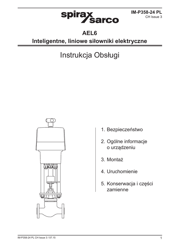 IM-P358-24 PL CH Issue 3 AEL6 Inteligentne, liniowe siłowniki elektryczne Instrukcja Obsługi 1.Bezpieczeństwo 2.Ogólne informacje o urządzeniu 3.Montaż 4.Uruchomienie 5.Konserwacja i części zamienne IM-P358-24 PL CH Issue 3 / 07.15 1 1. Bezpieczeństwo Gwarancją bezpiecznej eksploatacji urządzenia jest jego prawidłow y montaż, uruchomienie, obsługa i konserwacja, które to czynności powinny być wykonywane przez należycie przeszkolony personel (patrz rozdział 1.13), zgodnie z niniejszą instrukcją. Ponadto należy przestrzegać ogólnych zasad montażu i bezpieczeństwa dotyczących rurociągów i instalacji, oraz stosować odpowiednie narzędzia i środki bezpieczeństwa. Patrz oddzielna instrukcja obsługi do zaworu regulacyjnego. Nieprawidłowy transport i użytkowanie siłownika może mieć następujące skutki: - zagrożenie życia i zdrowia osób trzecich, - uszkodzenie siłownika i innych dóbr należących do użytkownika, - nieprawidłowa praca siłownika. 1.1 Uwagi dotyczące okablowania Przy projektowaniu siłownika podjęto wszelkie starania w celu zapewnienia bezpieczeństwa użytkownikowi, pod warunkiem zachowania następujących środków ostrożności: i) Personel zajmujący się obsługą urządzenia musi posiadać odpowiednie kwalifikacje do pracy z urządzeniami pod niebezpiecznym napięciem. ii) Urządzenie należy prawidłowo zainstalować. Wykonanie instalacji niezgodnie z zaleceniami niniejszej Instrukcji może mieć negatywny wpływ na bezpieczeństwo. iii) Należy odłączyć siłownik od zasilania sieciowego przed otwarciem urządzenia. iv) Siłownik zaprojektowano jako urządzenie kategorii II, wymagające podłączenia do zabezpieczenia nadprądowego oraz izolacji głównej instalacji budynku. v) Okablowanie należy wykonać zgodnie z normą IEC 60364 lub równoważną. vi) Bezpieczniki nie mogą być montowane na przewodzie uziemienia ochronnego. Odłączenie lub usunięcie innych urządzeń nie może mieć wpływu na prawidłowe działanie instalacji uziemiającej. vii) Instalacja elektryczna budynku musi zawierać urządzenie odłączające (wyłącznik lub wyłącznik automatyczny). Wyłącznik musi znajdować się blisko siłownika, w zasięgu operatora. - Na wszystkich biegunach musi znajdować się 3 mm przerwa stykowa. - Musi być oznaczony jako urządzenie wyłączające siłownik. - Nie może powodować rozłączenia uziemienia. - Nie może być włączony w przewód zasilania sieciowego. - Wymagania dotyczące urządzeń odłączających są określone w normach IEC 60947-1 oraz IEC 60947-3 lub równoważnych. viii) Siłownik musi być umiejscowiony tak, aby nie utrudniać obsługi urządzenia odłączającego. 2 IM-P358-24 PL CH Issue 3 / 07.15 1.2 Wymagania dotyczące bezpieczeństwa i kompatybilność elektromagnetyczna Omawiany produkt posiada oznaczenie CE. Spełnia wymagania dyrektywy 73/23/EWG zmienionej przez dyrektywę 93/68/EWG w sprawie harmonizacji przepisów państw członkowskich w odniesieniu do urządzeń elektrycznych zaprojektowanych do użycia w ograniczonym zakresie napięć (dyrektywa niskonapięciowa LVD) poprzez spełnienie normy dotyczącej bezpieczeństwa urządzeń elektrycznych do pomiarów, sterowania i użytku laboratoryjnego. Urządzenie spełnia wymagania dyrektywy 89/336/EWG zmienionej przez dyrektywy 92/31/EWG oraz 93/68/EWG w sprawie zbliżenia przepisów państw członkowskich dotyczących zgodności elektromagnetycznej w drodze spełnienia ogólnej normy emisji w środowisku przemysłowym oraz ogólnej normy odporności w środowisku przemysłowym. Omawiane urządzenie może być narażone na zakłócenia powyżej granic odporności w środowisku przemysłowym, jeżeli: - Urządzenie lub jego okablowanie znajduje się w pobliżu nadajnika radiowego. - Zasilanie sieciowe jest źródłem nadmiernych szumów elektrycznych. - Telefony komórkowe i krótkofalówki mogą powodować zakłócenia w przypadku użycia w odległości do około jednego metra od urządzenia lub jego okablowania. Rzeczywista wymagana odległość będzie zależna od mocy nadajnika. - Należy zainstalować układy zabezpieczające linię zasilającą (prądu zmiennego), jeżeli prawdopodobne jest wystąpienie zakłóceń na zasilaniu sieciowym. - Układy zabezpieczające mogą łączyć ochronniki filtracyjne, przeciwzakłóceniowe, przepięciowe i impulsowe. W celu uzyskania kopii deklaracji zgodności prosimy o kontakt ze Spirax Sarco. 1.3 Użytkowane zgodnie z przeznaczeniem Kierując się informacjami podanymi w instrukcji obsługi, na tabliczce znamionowej urządzenia oraz w karcie katalogowej, upewnij się, że dane urządzenie jest przeznaczone do zamierzonego zastosowania. i) Sprawdź, czy materiał urządzenia jest odpowiedni dla zamierzonego zastosowania, oraz czy ciśnienie i temperatura w miejscu zastosowania nie przekroczą minimalnych i maksymalnych wartości dopuszczalnych dla urządzenia. Jeżeli parametry dopuszczalne urządzenia są niższe niż instalacji, w której urządzenie ma być zamontowane, lub awaria urządzenia mogłaby doprowadzić do niebezpiecznego wzrostu ciśnienia lub temperatury, trzeba dodatkowo zastosować odpowiednie urządzenie zabezpieczające. ii) Wyznacz odpowiednie miejsce montażu urządzenia. iii) Urządzenia Spirax Sarco nie zostały zaprojektowane w sposób gwarantujący odporność na skrajne naprężenia, jakie mogą być wywoływane przez instalacje, w których są montowane. Osoba wykonująca montaż urządzenia w instalacji jest odpowiedzialna za ocenę ryzyka powstania takich naprężeń, a także podjęcie stosownych środków zaradczych dla ich zminimalizowania. IM-P358-24 PL CH Issue 3 / 07.15 3 1.4 Dostęp Przed rozpoczęciem pracy z urządzeniem zapewnij bezpieczny dostęp do niego, a w razie potrzeby również podest roboczy (odpowiednio zabezpieczony). W razie konieczności, zapewnij odpowiednie urządzenie podnośnikowe. 1.5 Oświetlenie Zapewnij odpowiednie oświetle