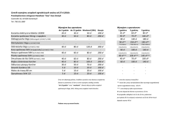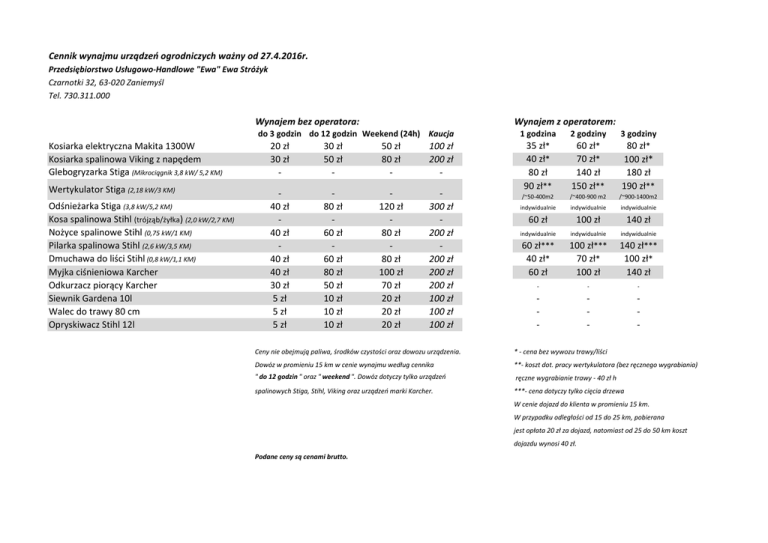 Cennik wynajmu urządzeo ogrodniczych ważny od 27.4.2016r. Przedsiębiorstwo Usługowo-Handlowe "Ewa" Ewa Stróżyk Czarnotki 32, 63-020 Zaniemyśl Tel. 730.311.000 Wynajem bez operatora: Wynajem z operatorem: do 3 godzin do 12 godzin Weekend (24h) Kaucja Kosiarka elektryczna Makita 1300W Kosiarka spalinowa Viking z napędem Glebogryzarka Stiga (Mikrociągnik 3,8 kW/ 5,2 KM) 20 zł 30 zł - 30 zł 50 zł - 50 zł 80 zł - 100 zł 200 zł - Wertykulator Stiga (2,18 kW/3 KM) 40 zł 40 zł 40 zł 40 zł 30 zł 5 zł 5 zł 5 zł 80 zł 60 zł 60 zł 80 zł 50 zł 10 zł 10 zł 10 zł 120 zł 80 zł 80 zł 100 zł 70 zł 20 zł 20 zł 20 zł 300 zł 200 zł 200 zł 200 zł 200 zł 100 zł 100 zł 100 zł Odśnieżarka Stiga (3,8 kW/5,2 KM) Kosa spalinowa Stihl (trójząb/żyłka) (2,0 kW/2,7 KM) Nożyce spalinowe Stihl (0,75 kW/1 KM) Pilarka spalinowa Stihl (2,6 kW/3,5 KM) Dmuchawa do liści Stihl (0,8 kW/1,1 KM) Myjka ciśnieniowa Karcher Odkurzacz piorący Karcher Siewnik Gardena 10l Walec do trawy 80 cm Opryskiwacz Stihl 12l 1 godzina 35 zł* 40 zł* 2 godziny 60 zł* 70 zł* 3 godziny 80 zł* 80 zł 90 zł** 140 zł 150 zł** 100 zł* 180 zł 190 zł** /~50-400m2 /~400-900 m2 /~900-1400m2 indywidualnie indywidualnie indywidualnie 60 zł 100 zł 140 zł indywidualnie indywidualnie indywidualnie 60 zł*** 40 zł* 60 zł 100 zł*** 70 zł* 100 zł 140 zł*** 100 zł* 140 zł - - - - - - Ceny nie obejmują paliwa, środków czystości oraz dowozu urządzenia. * - cena bez wywozu trawy/liści Dowóz w promieniu 15 km w cenie wynajmu według cennika **- koszt dot. pracy wertykulatora (bez ręcznego wygrabiania) " do 12 godzin " oraz " weekend ". Dowóz dotyczy tylko urządzeo ręczne wygrabianie trawy - 40 zł h spalinowych Stiga, Stihl, Viking oraz urządzeo marki Karcher. ***- cena dotyczy tylko cięcia drzewa W cenie dojazd do klienta w promieniu 15 km. W przypadku odległości od 15 do 25 km, pobierana jest opłata 20 zł za dojazd, natomiast od 25 do 50 km koszt dojazdu wynosi 40 zł. Podane ceny są cenami brutto.