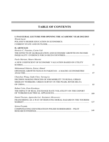 TABLE OF CONTENTS I. INAUGURAL LECTURE FOR OPENING THE ACADEMIC YEAR 2012/2013 Witold Jurek POLAND’S HIGHER EDUCATION IN ECONOMICS: CURRENT STATE AND OUTLOOK................................................................................ 5 II. ARTICLES Horácio C. Faustino, Carim Vali THE EFFECTS OF GLOBALIZATION AND ECONOMIC GROWTH ON INCOME INEQUALITY: EVIDENCE FOR 24 OECD COUNTRIES.............................................. 13 Paolo Mariani, Mauro Mussini A NEW COEFFICIENT OF ECONOMIC VALUATION BASED ON UTILITY SCORES............................................................................................................................ . 33 Muhammad Zakaria, Eatzaz Ahmed OPENNESS–GROWTH NEXUS IN PAKISTAN: A MACRO–ECONOMETRIC ANALYSIS.......................................................................................................................... 47 Chunchao Wang, Guifu Chen, Yarong Lu DECISION MAKING PROCESS OF JOB MOBILITY TO RURAL-URBAN MIGRANT WORKERS: URBAN SURVEY IN THE PEARL RIVER DELTA OF CHINA........................................................................................... ............................... 85 Rahmi Cetin, Etem Karakaya THE IMPACT OF REAL EXCHANGE RATE VOLATILITY ON THE EXPORT OF TURKISH ELECTRICAL APPLIANCES................................................................... 109 Daniel Puciato, Agnieszka Łoś, Kazimierz Mrozowicz FRANCHISING AS A WAY OF REDUCING MORAL HAZARD IN THE TOURISM MARKET……………………………………………………………………………........ 127 Sylwia Przytuła COMPENSATING EXPATRIATES IN POLISH SUBSIDIARIES – PILOT RESEARCH FINDINGS..................................................................................................... 149 III. REVIEWS AND NOTES K. Jajuga, M. Walesiak (eds.): TAKSONOMIA 19. KLASYFIKACJA I ANALIZA DANYCH – TEORIA I ZASTOSOWANIA [TAXONOMY 19. CLASSIFICATION AND DATA ANALYSIS – THEORY AND APPLICATIONS] (Józef Pociecha) ........... 173 Andrzej Rapacz (ed.): WYZWANIA WSPÓŁCZESNEJ POLITYKI TURYSTYCZNEJ. PROBLEMY POLITYKI TURYSTYCZNEJ [CURRENT TOURISM POLICY – CHALLENGES AND EXPECTATIONS] (Magdalena Kachniewska) ................................................................................................. 177 Andrzej Kaleta, Krystyna Moszkowicz (eds.): ZARZĄDZANIE STRATEGICZNE W PRAKTYCE I TEORII [STRATEGIC MANAGEMENT IN THEORY AND PRACTICE] (Krystyna Poznańska) ……………………………………………………… 181 IV. HABILITATION MONOGRAPHS……………………………………………….. 187