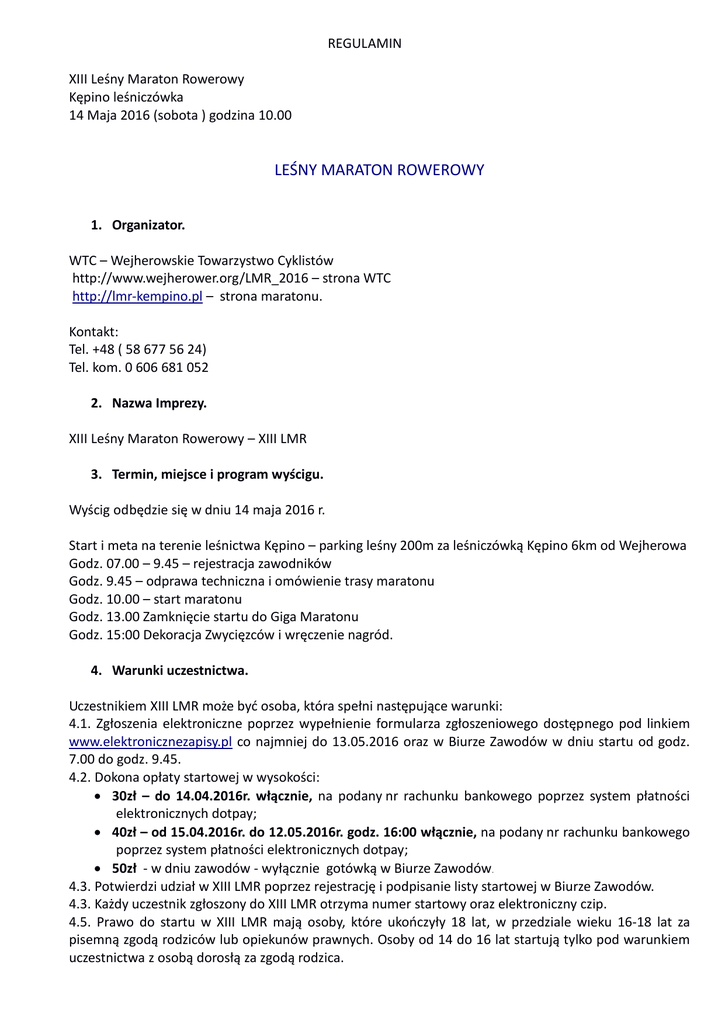 REGULAMIN XIII Leśny Maraton Rowerowy Kępino leśniczówka 14 Maja 2016 (sobota ) godzina 10.00 LEŚNY MARATON ROWEROWY 1. Organizator. WTC – Wejherowskie Towarzystwo Cyklistów http://www.wejherower.org/LMR_2016 – strona WTC http://lmr-kempino.pl – strona maratonu. Kontakt: Tel. +48 ( 58 677 56 24) Tel. kom. 0 606 681 052 2. Nazwa Imprezy. XIII Leśny Maraton Rowerowy – XIII LMR 3. Termin, miejsce i program wyścigu. Wyścig odbędzie się w dniu 14 maja 2016 r. Start i meta na terenie leśnictwa Kępino – parking leśny 200m za leśniczówką Kępino 6km od Wejherowa Godz. 07.00 – 9.45 – rejestracja zawodników Godz. 9.45 – odprawa techniczna i omówienie trasy maratonu Godz. 10.00 – start maratonu Godz. 13.00 Zamknięcie startu do Giga Maratonu Godz. 15:00 Dekoracja Zwycięzców i wręczenie nagród. 4. Warunki uczestnictwa. Uczestnikiem XIII LMR może być osoba, która spełni następujące warunki: 4.1. Zgłoszenia elektroniczne poprzez wypełnienie formularza zgłoszeniowego dostępnego pod linkiem www.elektronicznezapisy.pl co najmniej do 13.05.2016 oraz w Biurze Zawodów w dniu startu od godz. 7.00 do godz. 9.45. 4.2. Dokona opłaty startowej w wysokości: 30zł – do 14.04.2016r. włącznie, na podany nr rachunku bankowego poprzez system płatności elektronicznych dotpay; 40zł – od 15.04.2016r. do 12.05.2016r. godz. 16:00 włącznie, na podany nr rachunku bankowego poprzez system płatności elektronicznych dotpay; 50zł - w dniu zawodów - wyłącznie gotówką w Biurze Zawodów. 4.3. Potwierdzi udział w XIII LMR poprzez rejestrację i podpisanie listy startowej w Biurze Zawodów. 4.3. Każdy uczestnik zgłoszony do XIII LMR otrzyma numer startowy oraz elektroniczny czip. 4.5. Prawo do startu w XIII LMR mają osoby, które ukończyły 18 lat, w przedziale wieku 16-18 lat za pisemną zgodą rodziców lub opiekunów prawnych. Osoby od 14 do 16 lat startują tylko pod warunkiem uczestnictwa z osobą dorosłą za zgodą rodzica. 4.6. Każdy uczestnik startuje na własną odpowiedzialność (w przypadku zawodników niepełnoletnich na odpowiedzialność rodziców lub prawnych opiekunów). 4.7. Organizator zobowiązuje się dokonać zwrotu 50% wpisowego jeśli uczestnik zrezygnuje do dnia 13 maja ze startu i poinformuje o tym fakcie organizatorów przed zawodami wysyłając informację poczt elektroniczną na adres [email protected]. 4.8. Zaleca się aby każdy uczestnik zawodów jechał w kasku sztywnym, a niepełnoletni jest do tego zobowiązany. 5. Cel wyścigu. 5.1. Popularyzacja kolarstwa górskiego i turystyki rowerowej. 5.2. Sprawdzenie granic własnej wytrzymałości i odporności psychicznej. 5.3. Wyłonienie najlepszych zawodników maratonu. 5.4. Propagowanie zdrowego trybu życia, aktywnego wypoczynku i rekreacji. 5.5. Prezentacja walorów krajoznawczych i uroków Puszczy Darzlubskiej. 5.6. Integracja środowiska miłośników rowerów górskich. 6. Trasa wyścigu i sposób przeprowadzenia zawodów. 6.1. Trasa będzie oznakowana w miejscach skrętów, prowadzi wyłącznie w terenie leśnym. Cała trasa przebiega przez lasy Puszczy Darzlubskiej. 6.2. Zwycięzcami poszczególnych kategorii wiekowych wymienionych w regulaminie zostaną zawodnicy, którzy pokonają trasę w najkrótszym czasie. 6.3. Start do maratonu odbędzie się ze startu wspólnego, wszystkich kategorii tak do Mega jak i Giga Maratonu. 6.4. Wyboru dystansu dokonuje uczestnik w trakcie jazdy. Dystans Mega 48 km, dystans Giga 72 km. 6.5. Wyjazd na trzecią pętlę (Giga Maraton) będzie limitowany czasem uzyskanym na dwóch pierwszych pętlach. Limit wynosi 3 godziny. Po przekroczeniu tego czasu wjazd na trzecią pętle będzie zamknięty a wszyscy zawodnicy zostaną sklasyfikowani na dystansie Mega. 6.6. Na zamknięciu pętli zlokalizowany będzie punkt z wodą. 6.7. Brak lub uszkodzenie numeru startowego lub czipa uniemożliwiające odczytanie przez sędziów, będzie zagrożone nie sklasyfikowaniem. 6.8. Urządzenie rejestrujące (czip) zostanie zdemontowane na mecie przez obsługę LMR. 6.9. Podczas rozgrywania XIII LMR organizator w porozumieniu z sędzią głównym zawodów zastrzega sobie prawo do wycofania uczestnika, którego stan zdrowia będzie uniemożliwiał kontynuowanie wyścigu. 6.10. Zawodnicy podczas wyścigu zobowiązani są do przestrzegania niniejszego regulaminu oraz do zachowania podstawowych zasad kultury i fair play. 7. Kary. Komisja Sędziowska w porozumieniu z Organizatorem może zasądzić następujące kary: 1. Upomnienie. 2. Kara czasowa. 3. Dyskwalifikacja. 8. Klasyfikacja. 8.1. Klasyfikacja będzie przeprowadzona w kategoriach wiekowych oraz z podziałem na płeć. 8.2. Klasyfikowani oddzielnie będą również uczestnicy w rozbiciu na Mega i Giga Maraton 8.3. Zwycięzcą w kategorii wiekowych zostanie uczestnik, który w najkrótszym czasie dotrze do mety. 8.4. Puchar zawodów otrzyma zwycięzca Giga Maratonu, który uzyska najlepszy czas. 8.5. Zawody zaliczane są do Super Klasyfikacji MTB. Wszystkie szczegóły, regulamin SKMTB oraz rankingi znajdują się na stronie www.skmtb.pl 9. Nagrody i świadczenia. 9.1. W każdej kategorii wiekowej trzy pierwsze miejsca zostaną nagrodzone trofeami sportowymi oraz nagrodami rzeczowymi ufundowanymi przez sponsorów. 9.2. W ramach wpisowego organizatorzy zapewniają: - numer startowy na rower, - elektroniczny czip podlegający zwrotowi na mecie, - wodę i posiłek regeneracyjny na mecie wyścigu, - ubezpieczenie od skutków nieszczęśliwych wypadków, - opiekę medyczną podczas zawodów, - niesamowite emocje sportowe podczas wyścigu, - nagrody rzeczowe, które zostaną rozlosowane po dekoracji zwycięzców, spośród wszystkich obecnych uczestników zawodów. 10. Kategorie wiekowe z podziałem na płeć. Elita: wiek do 30 lat, Master: wiek 31 lat i starsi, Jeżeli będą mniej niż cztery osoby w danej kategorii wiekowej to komisja sędziowska podejmie decyzję o połączeniu kategorii wiekowych: elita i 