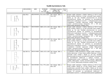 Szafki kartotekowe Szk OZNACZENIE KOD WYMIARY w mm. wys. x szer. x gł. WYMIARY wewnętrzne szuflad w mm wys. x szer. x gł. WERSJA STANDARDOWA 244 (frontu 280) x 330 x 585 Szk 101st SZK 01010102 715 x 415 x 630 Szk 201st SZK 01020202 1000 x 415 x 630 244 (frontu 280) x WAGA w kg OPIS 31 Korpus szafki wykonany z blachy stalowej gr. 0,8-1,5 mm, fronty szuflad z blachy gr. 1,0 mm, pozostałe części szuflad z blachy gr. 0,6 mm. Szuflada przystosowana do teczek zawieszkowych (format A4 poziomo) na prowadnicach kulkowych o podwójnym wysuwie i z zabezpieczeniem przed wypadaniem. Centralne ryglowanie szuflad. Maksymalny wymiar przechowywanego dokumentu 275 x 328 mm. Maksymalne obciążenie szuflady 50 kg. Korpus szafki wykonany z blachy stalowej gr. 0,8-1,5 mm, fronty szuflad z blachy gr. 1,0 mm, pozostałe części szuflad z blachy gr. 0,6 mm. Szuflada przystosowana do teczek zawieszkowych (format A4 poziomo) na prowadnicach kulkowych o podwójnym wysuwie i z zabezpieczeniem przed wypadaniem. Centralne ryglowanie szuflad. Maksymalny wymiar przechowywanego dokumentu 275 x 328 mm. Maksymalne obciążenie szuflady 50 kg. Korpus szafki wykonany z blachy stalowej gr. 0,8-1,5 mm, fronty szuflad z blachy gr. 1,0 mm, pozostałe części szuflad z blachy gr. 0,6 mm. Szuflada przystosowana do teczek zawieszkowych (format A4 poziomo) na prowadnicach kulkowych o podwójnym wysuwie i z zabezpieczeniem przed wypadaniem. Centralne ryglowanie szuflad. Maksymalny wymiar przechowywanego dokumentu 275 x 328 mm. Maksymalne obciążenie szuflady 50 kg. 5-szufladowa szafka kartotekowa. Korpus szafki wykonany z blachy stalowej gr. 1,0 mm, fronty szuflad z blachy gr. 1,0 mm, pozostałe części szuflad z blachy gr. 0,8 mm. Szuflada przystosowana do teczek zawieszkowych (format A4 poziomo) na prowadnicach kulkowych o pełnym wysuwie, z zabezpieczeniem przed wypadaniem. Centralne ryglowanie szuflad. Maksymalny wymiar przechowywanego dokumentu 275 x 328 mm. Maksymalne obciążenie szuflady 50 kg. 40 330 x 585 Szk 301st SZK 01030302 1285 x 415 x 630 244 (frontu 280) x 53 330 x 585 Szk 301/5 st SZK 01140402 1568 x 415 x 630 244 (frontu 280) x 71 330 x 585 Szk 102 st SZK 02010802 715 x 775 x 630 244 (frontu 280) x 690 x 585 53 Korpus szafki wykonany z blachy stalowej gr. 0,8-1,5 mm, fronty szuflad z blachy gr. 1,0 mm, wieniec dolny z blachy ocynkowanej, pozostałe części szuflad z blachy gr. 0,6 mm. Szuflada przystosowana na dwa rzędy teczek zawieszkowych (format A4 poziomo) na prowadnicach kulkowych o podwójnym wysuwie i z zabezpieczeniem przed wypadaniem. Szk 202 st SZK 02020902 1000 x 775 x 630 244 (frontu 280) x 73 690 x 585 Szk 302 st SZK 02031002 1285 x 775 x 630 244 (frontu 280) x 89 690 x 585 Szk 304 st SZK 03031102 1285 x 545 x 630 187 (frontu 223) x 77 460 x 585 Szk 304/2 st SZK 03063402 605 x 545 x 630 187 (frontu 223) x 460 x 585 36 Szk 304/3 st SZK 03073502 830 x 545 x 630 187 (frontu 223) x 460 x 585 49 2 Centralne ryglowanie szuflad. Maksymalne obciążenie szuflady 50 kg. Korpus szafki wykonany z blachy stalowej gr. 0,8-1,5 mm, fronty szuflad z blachy gr. 1,0 mm, wieniec dolny z blachy ocynkowanej, pozostałe części szuflad z blachy gr. 0,6 mm. Szuflada przystosowana na dwa rzędy teczek zawieszkowych (format A4 poziomo) na prowadnicach kulkowych o podwójnym wysuwie i z zabezpieczeniem przed wypadaniem. Centralne ryglowanie szuflad. Maksymalne obciążenie szuflady 50 kg. Korpus szafki wykonany z blachy stalowej gr. 0,8-1,5 mm, fronty szuflad z blachy gr. 1,0 mm, wieniec dolny z blachy ocynkowanej, pozostałe części szuflad z blachy gr. 0,6 mm. Szuflada przystosowana na dwa rzędy teczek zawieszkowych (format A4 poziomo) na prowadnicach kulkowych o podwójnym wysuwie, z zabezpieczeniem przed wypadaniem. Centralne ryglowanie szuflad. Maksymalne obciążenie szuflady 50 kg. Korpus szafki wykonany z blachy stalowej gr. 0,8-1,5 mm, fronty szuflad z blachy gr. 1,0 mm, wieniec dolny z blachy ocynkowanej, pozostałe części szuflad z blachy gr. 0,6 mm. Szuflada przystosowana na dwa rzędy kartotek o formacie A5 poziomo na prowadnicach kulkowych o podwójnym wysuwie, z zabezpieczeniem przed wypadaniem. Centralne ryglowanie szuflad. Maksymalny wymiar przechowywanego dokumentu 215 x 225 mm. Maksymalne obciążenie szuflady 50 kg. 2-szufladowa szafka kartotekowa na format A5. Korpus szafki wykonany z blachy stalowej gr. 1,0 mm, fronty szuflad z blachy gr. 1,0 mm, wieniec dolny z blachy ocynkowanej. Szuflada przystosowana na dwa rzędy kartotek o formacie A5 poziomo na prowadnicach kulkowych o pełnym wysuwie, z zabezpieczeniem przed wypadaniem. Centralne ryglowanie szuflad. Maksymalny wymiar przechowywanego dokumentu 215 x 225 mm. Maksymalne obciążenie szuflady 50 kg. 3-szufladowa szafka kartotekowa na format A5. Korpus szafki wykonany z blachy stalowej gr. 1,0 mm, fronty szuflad z blachy gr. 1,0 mm, wieniec dolny z blachy ocynkowanej. Szuflada przystosowana na dwa rzędy kartotek o formacie A5 poziomo na prowadnicach kulkowych o pełnym wysuwie, z zabezpieczeniem przed wypadaniem. Centralne ryglowanie szuflad. Maksymalny wymiar przechowywanego dokumentu 215 x 225 mm. Maksymalne obciążenie szuflady 50 kg. Szk 304/4 st SZK 03083602 1060 x 545 x 630 187 (frontu 223) x 65 460 x 585 Szk 305 st SZK 02031302 1285 x 775 x 630 100 (frontu 223) x 98 690 x 585 Szk 103 st SZK 02011402 715 x 775 x 630 100 (frontu 137) x 690 x 585 72 Szk 203 st SZK 02021502 1000 x 775 x 630 100 (frontu 137) x 103 690 x 585 Szk 303 st SZK 02031602 1285 x 775 x 630 100 (frontu 137) x 690 x 585 WERSJA LUX 3 122 4-szufladowa szafka kartotekowa na format A5. Korpus szafki wykonany z blachy stalowej gr. 1,0mm, fronty szuflad z blachy gr. 1,0mm, wieniec dolny z blachy ocynkowanej. Szuflada przystosowana na dwa rzędy kartotek o formacie A5 poziomo na prowadnicach kulkowych o pełnym wysuwie, z zabezpieczeniem przed wypadaniem. Centralne ryglowanie szuflad. Max wymiar przechowywanego dokumentu 215x225 mm. Maksymalne obciążenie szuflady 