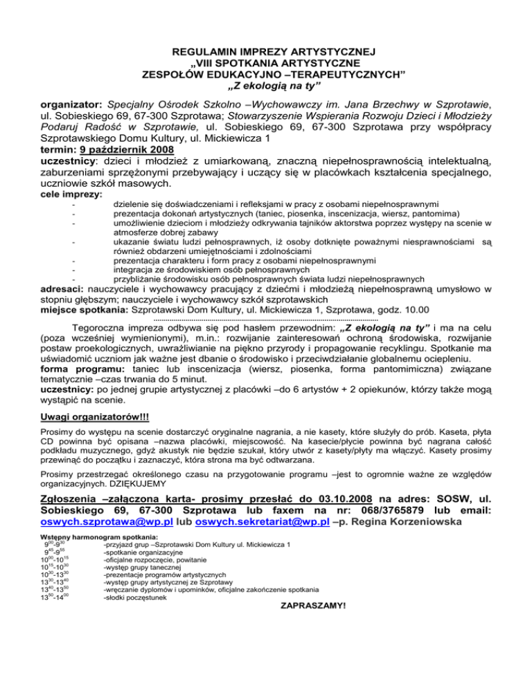 REGULAMIN IMPREZY ARTYSTYCZNEJ „VIII SPOTKANIA ARTYSTYCZNE ZESPOŁÓW EDUKACYJNO –TERAPEUTYCZNYCH” „Z ekologią na ty” organizator: Specjalny Ośrodek Szkolno –Wychowawczy im. Jana Brzechwy w Szprotawie, ul. Sobieskiego 69, 67-300 Szprotawa; Stowarzyszenie Wspierania Rozwoju Dzieci i MłodzieŜy Podaruj Radość w Szprotawie, ul. Sobieskiego 69, 67-300 Szprotawa przy współpracy Szprotawskiego Domu Kultury, ul. Mickiewicza 1 termin: 9 październik 2008 uczestnicy: dzieci i młodzieŜ z umiarkowaną, znaczną niepełnosprawnością intelektualną, zaburzeniami sprzęŜonymi przebywający i uczący się w placówkach kształcenia specjalnego, uczniowie szkół masowych. cele imprezy: - dzielenie się doświadczeniami i refleksjami w pracy z osobami niepełnosprawnymi prezentacja dokonań artystycznych (taniec, piosenka, inscenizacja, wiersz, pantomima) umoŜliwienie dzieciom i młodzieŜy odkrywania tajników aktorstwa poprzez występy na scenie w atmosferze dobrej zabawy ukazanie światu ludzi pełnosprawnych, iŜ osoby dotknięte powaŜnymi niesprawnościami są równieŜ obdarzeni umiejętnościami i zdolnościami prezentacja charakteru i form pracy z osobami niepełnosprawnymi integracja ze środowiskiem osób pełnosprawnych przybliŜanie środowisku osób pełnosprawnych świata ludzi niepełnosprawnych adresaci: nauczyciele i wychowawcy pracujący z dziećmi i młodzieŜą niepełnosprawną umysłowo w stopniu głębszym; nauczyciele i wychowawcy szkół szprotawskich miejsce spotkania: Szprotawski Dom Kultury, ul. Mickiewicza 1, Szprotawa, godz. 10.00 ................................................................................................................. Tegoroczna impreza odbywa się pod hasłem przewodnim: „Z ekologią na ty” i ma na celu (poza wcześniej wymienionymi), m.in.: rozwijanie zainteresowań ochroną środowiska, rozwijanie postaw proekologicznych, uwraŜliwianie na piękno przyrody i propagowanie recyklingu. Spotkanie ma uświadomić uczniom jak waŜne jest dbanie o środowisko i przeciwdziałanie globalnemu ociepleniu. forma programu: taniec lub inscenizacja (wiersz, piosenka, forma pantomimiczna) związane tematycznie –czas trwania do 5 minut. uczestnicy: po jednej grupie artystycznej z placówki –do 6 artystów + 2 opiekunów, którzy takŜe mogą wystąpić na scenie. Uwagi organizatorów!!! Prosimy do występu na scenie dostarczyć oryginalne nagrania, a nie kasety, które słuŜyły do prób. Kaseta, płyta CD powinna być opisana –nazwa placówki, miejscowość. Na kasecie/płycie powinna być nagrana całość podkładu muzycznego, gdyŜ akustyk nie będzie szukał, który utwór z kasety/płyty ma włączyć. Kasety prosimy przewinąć do początku i zaznaczyć, która strona ma być odtwarzana. Prosimy przestrzegać określonego czasu na przygotowanie programu –jest to ogromnie waŜne ze względów organizacyjnych. DZIĘKUJEMY Zgłoszenia –załączona karta- prosimy przesłać do 03.10.2008 na adres: SOSW, ul. Sobieskiego 69, 67-300 Szprotawa lub faxem na nr: 068/3765879 lub email: [email protected] lub [email protected] –p. Regina Korzeniowska Wstępny harmonogram spotkania: 900-930 -przyjazd grup –Szprotawski Dom Kultury ul. Mickiewicza 1 945-955 -spotkanie organizacyjne 1000-1015 -oficjalne rozpoczęcie, powitanie 1015-1030 -występ grupy tanecznej 30 30 10 -13 -prezentacje programów artystycznych 1330-1340 -występ grupy artystycznej ze Szprotawy 1340-1350 -wręczanie dyplomów i upominków, oficjalne zakończenie spotkania 1350-1400 -słodki poczęstunek ZAPRASZAMY!