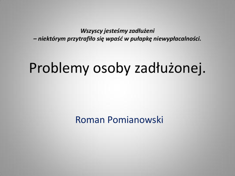 Wszyscy jesteśmy zadłużeni – niektórym przytrafiło się wpaśd w pułapkę niewypłacalności. Problemy osoby zadłużonej. Roman Pomianowski Wszyscy jesteśmy zadłużeni … • Niewypłacalnośd: – Aspekt finansowy • 2 mln 80 tys. Polaków /rodzin polskich/; • Łącznie ponad 32,5 mld zł; • Średnio ponad 15.300zł na głowę dłużnika. – Aspekt psychologiczny: • Stres „Dwa dominujące odczucia, które towarzyszą zadłużaniu się, to wstyd i strach. prof. Z. Zaleśkiewicza z WSPS. • Niewypłacalność – patologiczny hazard. Wszyscy jesteśmy zadłużeni … • Po co, jak to się dzieje, że ludzie zadłużają się ? • Zaciąganie zobowiązao jest działaniem celowym, zwiększa nasze możliwości działania tzw. kontrolę. • Intencje najczęściej są racjonalne i dobre, efekt koocowy bywa nieprzewidywalny. • Co robią ludzie gdy zaczynają mied problemy z wypłacalnością, bieżącą obsługa zobowiązao: – Burza mózgów … Co dzieje się kiedy nie dają rady? A. Czują się zagubieni, zdezorientowani, nie wiedzą co z sobą zrobid, boją się. Są raczej pasywni, bierni, problem zgłaszają b. późno, kiedy zaległości narosły i są już mocno przeterminowane. Martwią się co będzie dalej. Są raczej smutni, znerwicowani, nawet depresyjni, płaczliwi. Nie wykazują żadnej inicjatywy, czekają, że ktoś za nich rozwiąże problem, spodziewają się „cudu”. B. Uciekają przed problemem zadłużenia – unikają wierzycieli i windykatorów, nie odbierają pism, telefonów, znikają z terenu, ukrywają się. Uciekają w chorobę albo nadużywanie alkoholu. C. Zgłaszają problem – oczekują gotowych rad i propozycji. Starają się posłusznie słuchad i wypełniad przedstawione im propozycje. Pełni pokory, raczej zawstydzeni, zgadzają się na wszystko /Tak – Tak/. Bywa, że szybko zapominają o swych zobowiązaniach, wymagają „ręcznego sterowania” i bieżącej kontroli. Co dzieje się kiedy nie dają rady? D. Bywają aroganccy, nawet bezczelni, pełni złości przerzucają odpowiedzialnośd za swoje zadłużenie na innych lub szczególne okoliczności życiowe. Mają poczucie krzywdy, pełni pretensji żądają pomocy /najczęściej materialnej/, bywają agresywni, hałaśliwi oraz roszczeniowi. Skłonni do wszczynania konfliktów i pisania skarg. E. Racjonalnie podejmujący problem, poszukujący pomocy – rady, wsparcia w porozumieniu się z wierzycielami. Rozumieją ograniczenia, mają świadomośd, że będzie to długotrwały proces wymagający cierpliwości i zmierzenia się, negocjowania z wierzycielami. • Dlaczego tak się dzieje • Stres? • A może coś innego - WB Starają się jakoś sobie poradzid: Problem Pomysły rozwiązania H1, H2, H3 Rozwiązanie problemu Weryfikacja H1, H2, H3 trening zaradności 6 A co jeśli problem jest nierozwiązywalny? Problem nierozwiązywalny Pomysły rozwiązania H1, H2, H3 … Wyczerpanie > bezradność Weryfikacja H1, H2, H3 … trening bezradności 7 bezradnośd skojarzenia: słabośd nieudolnośd niemożnośd poradzenia sobie, zagubienie porażka zależnośd biernośd apatia 8 bezradnośd jakie wzbudza w nas uczucia: - cudza bezradnośd: litośd, współczucie, może wyrozumiałośd ale i złośd - własna – obawę, lęk, wstyd … 9 bezradnośd Kategorie: Jako chwilowa reakcja na okolicznośd przewyższające nasze zdolności radzenia sobie – doświadczanie bezradności Jako względnie trwały stan sposób funkcjonowania – życiowa bezradnośd 10 Wszyscy jesteśmy zadłużeni … W czym tkwi istota wyuczonej bezradności w objawiają się jej symptomy: • Deficyty poznawcze – trudności z koncentracją uwagi, pamięcią, kojarzeniem faktów, ciekawością, pomysłowością „pustka w głowie” • Deficyty emocjonalne – lęk, żal ale i złośd, przygnębienie, smutek, poczucie beznadziejności /501 samobójstw z powodów ekonomicznych w 2009 roku/ • Deficyty motywacyjne – labilnośd /”słomiany zapał”/, zobojętnienie, biernośd, apatia Wszyscy jesteśmy zadłużeni … W czym tkwi istota wyuczonej bezradności w objawiają się jej symptomy: Osoby bezradne: • przestają rozwijad się, uczyd nawet na własnych błędach, • ich zachowanie staje się schematyczne, jakby zautomatyzowane, 0 – 1, • kierują nim zbiory sztywnych, często zupełnie nieefektywnych, nawet destruktywnych nawyków – kompulsywne zadłużanie się. Wszyscy jesteśmy zadłużeni … • Co z tym począd – profilaktyce, – wczesnym reagowaniu, – wychodzeniu ze spirali zadłużenia, • Czy jest lekarstwo na wyuczoną bezradnośd • SUKCES • Tylko co to oznacza dla osoby zadłużonej / niewypłacalnej? /burza mózgów/ Wszyscy jesteśmy zadłużeni … • Czy można z bezradności dłużniczej wyjśd samodzielnie, w pojedynkę? • Jak reaguje otoczenie – najbliższe i dalsze, społ.? • Co wobec tego? • Dłużnik potrzebuje pomocy: – Profesjonalnej – doradztwa prawnego, finansowego, psychologicznego – Samopomocy - DA / Debtors Anonymous/. Program Wsparcia Zadłużonych i doświadczających skutków niewypłacalności najbliższych. • A. Grupa edukacyjna – /otwarta, rotacyjna/ cykl 8 - 10 spotkao poświęconych zagadnieniom kluczowym z perspektywy wychodzenia z zadłużenia. Przekazywana i porządkowana jest wiedza na temat istoty, mechanizmów, konsekwencji niewypłacalności, tak w płaszczyźnie psychologicznej jak i prawnej oraz finansowej. Podejmowane są zagadnienia powiązane z zadłużeniem i niewypłacalnością, np. przemocy ekonomicznej, uzależnieo, hazardu. Istotną częścią bloku edukacyjnego są zagadnienia dot. praw obywatelskich i konsumenckich, procedur urzędowych, możliwości uzyskiwania pomocy, np. prawnej, itd. • Zajęcia grupy edukacyjnej raz w tygodniu, po 2 h. Program Wsparcia Zadłużonych i doświadczających skutków niewypłacalności najbliższych. • B. Grupa warsztatowa – trening kluczowych kompetencji radze