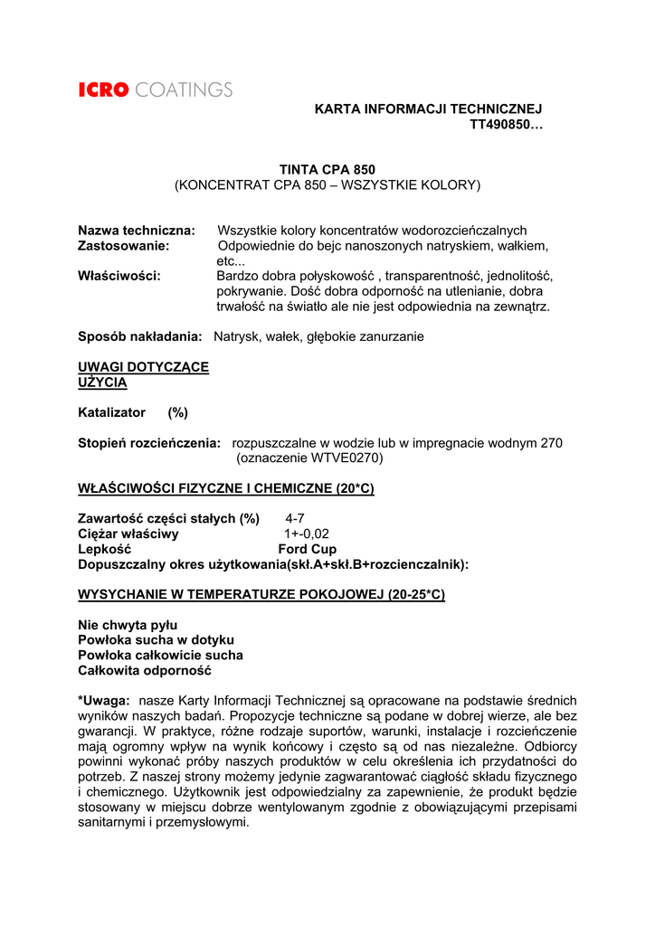 ICRO COATINGS KARTA INFORMACJI TECHNICZNEJ TT490850… TINTA CPA 850 (KONCENTRAT CPA 850 – WSZYSTKIE KOLORY) Nazwa techniczna: Zastosowanie: Właściwości: Wszystkie kolory koncentratów wodorozcieńczalnych Odpowiednie do bejc nanoszonych natryskiem, wałkiem, etc... Bardzo dobra połyskowość , transparentność, jednolitość, pokrywanie. Dość dobra odporność na utlenianie, dobra trwałość na światło ale nie jest odpowiednia na zewnątrz. Sposób nakładania: Natrysk, wałek, głębokie zanurzanie UWAGI DOTYCZĄCE UŻYCIA Katalizator (%) Stopień rozcieńczenia: rozpuszczalne w wodzie lub w impregnacie wodnym 270 (oznaczenie WTVE0270) WŁAŚCIWOŚCI FIZYCZNE I CHEMICZNE (20*C) Zawartość części stałych (%) 4-7 Ciężar właściwy 1+-0,02 Lepkość Ford Cup Dopuszczalny okres użytkowania(skł.A+skł.B+rozcienczalnik): WYSYCHANIE W TEMPERATURZE POKOJOWEJ (20-25*C) Nie chwyta pyłu Powłoka sucha w dotyku Powłoka całkowicie sucha Całkowita odporność *Uwaga: nasze Karty Informacji Technicznej są opracowane na podstawie średnich wyników naszych badań. Propozycje techniczne są podane w dobrej wierze, ale bez gwarancji. W praktyce, różne rodzaje suportów, warunki, instalacje i rozcieńczenie mają ogromny wpływ na wynik końcowy i często są od nas niezależne. Odbiorcy powinni wykonać próby naszych produktów w celu określenia ich przydatności do potrzeb. Z naszej strony możemy jedynie zagwarantować ciągłość składu fizycznego i chemicznego. Użytkownik jest odpowiedzialny za zapewnienie, że produkt będzie stosowany w miejscu dobrze wentylowanym zgodnie z obowiązującymi przepisami sanitarnymi i przemysłowymi.