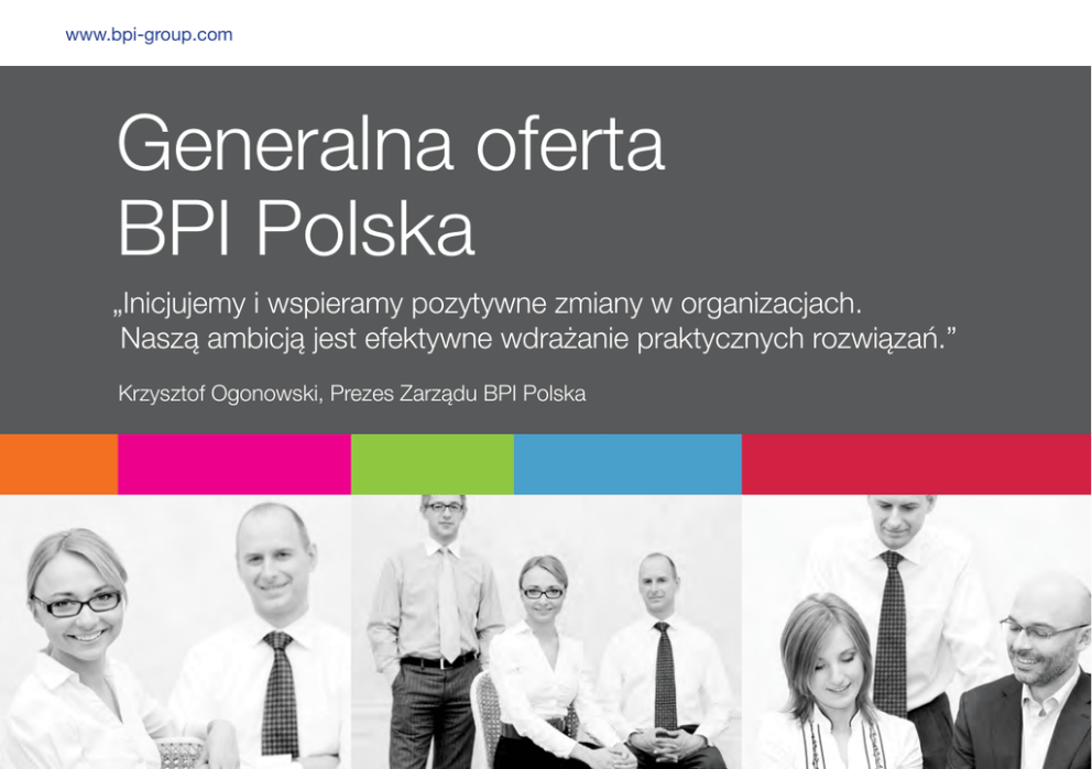 www.bpi-group.com Generalna oferta BPI Polska „Inicjujemy i wspieramy pozytywne zmiany w organizacjach. Naszą ambicją jest efektywne wdrażanie praktycznych rozwiązań.” Krzysztof Ogonowski, Prezes Zarządu BPI Polska www.bpi-group.com Generalna oferta BPI Polska Pozwólcie Państwo, że się przedstawimy… 0.1 www.bpi-group.com Pozwólcie Państwo, że się przedstawimy… BPI jest międzynarodową grupą doradczą, której kluczowe kompetencje koncentrują się wokół wdrażania zmian, restrukturyzacji i rozwoju kapitału ludzkiego. Nasza Grupa w 40 krajach zatrudnia ponad 1500 konsultantów. międzynarodowa grupa doradcza W Polsce, jako BPI Polska, jesteśmy obecni od 1991 roku. Główne obszary naszych działań to wspieranie pozytywnych zmian w organizacjach oraz restrukturyzacja i transformacja przedsiębiorstw. W naszym warszawskim biurze pracuje 25 konsultantów. 0.1 zmiana restrukturyzacja transformacja www.bpi-group.com Generalna oferta BPI Polska Co nas wyróżnia? 0.2 www.bpi-group.com Co nas wyróżnia? W dzisiejszym świecie, wdrożenie jest kluczem do sukcesu. Naszym celem jest zawsze efektywne wdrożenie praktycznych rozwiązań. nastawienie na efektywne wdrożenie Jesteśmy nastawieni na osiąganie korzyści biznesowych, nie interesuje nas wyłączne kreowanie rozwiązań idealnych. Generowane przez nas rozwiązania są praktyczne dla Klienta. Zawsze powstają przy zaangażowaniu menedżerów, którzy są potem odpowiedzialni za ich wdrożenie. 0.2 rozwiązania praktyczne dla Klienta www.bpi-group.com Generalna oferta BPI Polska Jak działamy? 0.3 www.bpi-group.com Jak działamy? Posiadamy wieloletnie doświadczenie w przeprowadzaniu pozytywnych zmian w organizacjach. wieloletnie doświadczenie Korzystając z najlepszych światowych wzorców wypracowaliśmy własny model wdrażania zmian, zakładający znaczący udział pracowników w tym procesie. Nasi Klienci osiągają zakładane cele przy minimalnych kosztach społecznych, zachowując podstawowe wartości przedsiębiorstwa, zwiększają tym samym swoje szanse na sukces w przyszłości, stają się liderami dobrej zmiany. 0.3 zakładane cele przy minimalnych kosztach www.bpi-group.com Generalna oferta BPI Polska Na czym polega nasza oferta? 0.4 www.bpi-group.com Na czym polega nasza oferta? Nasza oferta sprowadza się do wypracowania efektywnych rozwiązań dla naszych Klientów w ramach poniższych obszarów. wypracowania efektywnych rozwiązań Inspirujemy, inicjujemy, organizujemy i wspieramy wdrożenie wypracowanych rozwiązań: • podnoszenie efektywności • realizacja celów zespołowych • skuteczność indywidualna • restrukturyzacja zatrudnienia 0.4 inspirujemy, inicjujemy, organizujemy • komunikacja i integracja www.bpi-group.com 0.4 Na czym polega nasza oferta? PODNOSZENIE EFEKTYWNOŚCI REALIZACJA CELÓW ZESPOŁOWYCH SKUTECZNOŚĆ INDYWIDUALNA RESTRUKTURYZACJA ZATRUDNIENIA KOMUNIKACJA I INTEGRACJA Podnoszenie efektywności można rozumieć na różne sposoby. Różne są też potrzeby naszych Klientów. Z naszych wieloletnich doświadczeń w tym zakresie zbudowaliśmy swoisty katalog rozwiązań: 1.audyt organizacji 2.mobilizacja kadry wokół strategii 3.reorganizacja zespołu, wskazanie nowych ról 4.zarządzanie wynikami pracy: od kaskadowania celów do systemu ocen i premii 5.zmiany ZUZP, ewolucja systemu wynagrodzeń 6.wdrażanie systemów i narzędzi ciągłego doskonalenia wyników 7.optymalna etatyzacja 8.przygotowanie i realizacja PDO www.bpi-group.com 0.4 Na czym polega nasza oferta? PODNOSZENIE EFEKTYWNOŚCI REALIZACJA CELÓW ZESPOŁOWYCH SKUTECZNOŚĆ INDYWIDUALNA RESTRUKTURYZACJA ZATRUDNIENIA KOMUNIKACJA I INTEGRACJA Realizacja celów zespołowych, czyli wypracowanie dla danej organizacji systemu zbiorowej efektywności i wsparcie jego wdrożenia: 1.kaskadowanie strategii celem zespołowym 2.tworzenie organizacji zorientowanej na cele 3.wdrożenie zarządzania programami i portfelem projektów www.bpi-group.com 0.4 Na czym polega nasza oferta? PODNOSZENIE EFEKTYWNOŚCI REALIZACJA CELÓW ZESPOŁOWYCH SKUTECZNOŚĆ INDYWIDUALNA RESTRUKTURYZACJA ZATRUDNIENIA KOMUNIKACJA I INTEGRACJA Skuteczność indywidualna, czyli programy budowania i wspierania liderów: 1.ocena potencjału i kompetencji, opracowanie planu rozwoju 2.opracowanie polityki rozwoju kompetencji 3.coaching biznesowy 4.Corporate University – programy dla kadry o wysokim potencjale 5. szkolenia dla podstawowej kadry kierowniczej, typu mistrzowie i brygadziści 6.100 dni menedżera 7.coaching projektowy przy realizacji projektu – wsparcie dla Sponsora projektu i szefa projektu 8.„PROSCI Change Management” – szkolenia w zakresie zarządzania zmianą/ liderzy zmiany 9.indywidualne prawo pracy www.bpi-group.com 0.4 Na czym polega nasza oferta? PODNOSZENIE EFEKTYWNOŚCI REALIZACJA CELÓW ZESPOŁOWYCH SKUTECZNOŚĆ INDYWIDUALNA RESTRUKTURYZACJA ZATRUDNIENIA KOMUNIKACJA I INTEGRACJA Restrukturyzacja zatrudnienia: 1.ocena potencjału restrukturyzacji jako ścieżki wzrostu efektywności 2.określenie warunków wykonalności i wdrożenia 3.opracowanie strategii procesu 4.wdrożenie procesu restrukturyzacji 5.modelowanie efektów ekonomicznych, jako proces równoległy do samego wdrożenia 6.dialog społeczny 7.wdrożenie programu mobilności wewnętrznej 8.outplacement www.bpi-group.com 0.4 Na czym polega nasza oferta? PODNOSZENIE EFEKTYWNOŚCI REALIZACJA CELÓW ZESPOŁOWYCH SKUTECZNOŚĆ INDYWIDUALNA RESTRUKTURYZACJA ZATRUDNIENIA KOMUNIKACJA I INTEGRACJA Komunikacja i integracja. Wierzymy, że komunikacja jest jednym z kluczowych elementów efektywnego zarządzania. Interesują nas tylko efektywne wdrożenia, nie prowadzimy ich bez dobrze przygotowanej i realizowanej komunikacji: 1.strategia komunikacyjna Firmy 2.komunikacja wewnętrzna 3.komunikacja zewnętrzna 4.komunikacja społeczna 5.kultura korporacyjna www.bpi-group.com Nasi klienci 0.5 AGORA, ALMA, ALTADIS, ALSTOM POWER TURBO-SYSTEMS, ANGEL TRAINS, ANIMEX, AU