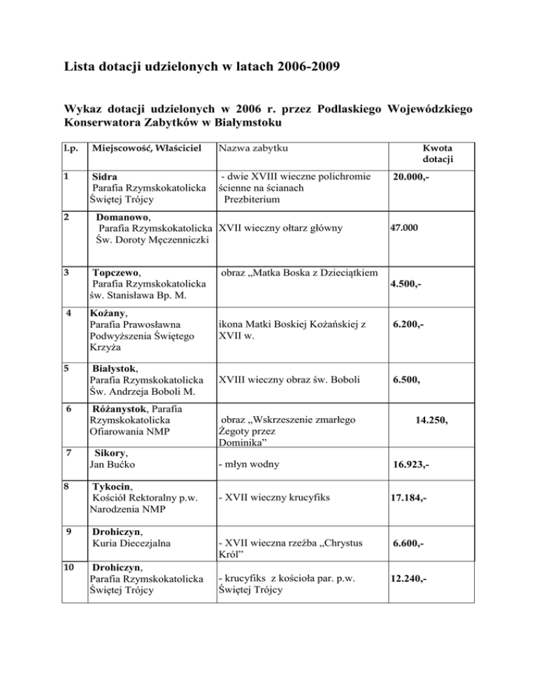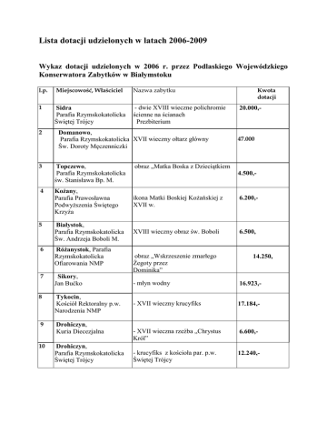 Lista dotacji udzielonych w latach 2006-2009 Wykaz dotacji udzielonych w 2006 r. przez Podlaskiego Wojewódzkiego Konserwatora Zabytków w Białymstoku l.p. Miejscowość, Właściciel Nazwa zabytku 1 Sidra Parafia Rzymskokatolicka Świętej Trójcy - dwie XVIII wieczne polichromie ścienne na ścianach Prezbiterium 2 3 4 5 6 7 8 9 10 Domanowo, Parafia Rzymskokatolicka XVII wieczny ołtarz główny Św. Doroty Męczenniczki Topczewo, Parafia Rzymskokatolicka św. Stanisława Bp. M. Kwota dotacji 20.000,- 47.000 obraz „Matka Boska z Dzieciątkiem 4.500,- Kożany, Parafia Prawosławna Podwyższenia Świętego Krzyża ikona Matki Boskiej Kożańskiej z XVII w. 6.200,- Białystok, Parafia Rzymskokatolicka Św. Andrzeja Boboli M. XVIII wieczny obraz św. Boboli 6.500, Różanystok, Parafia Rzymskokatolicka Ofiarowania NMP obraz „Wskrzeszenie zmarłego Żegoty przez Dominika” 14.250, Sikory, Jan Bućko - młyn wodny 16.923,- Tykocin, Kościół Rektoralny p.w. Narodzenia NMP - XVII wieczny krucyfiks 17.184,- - XVII wieczna rzeźba „Chrystus Król” 6.600,- - krucyfiks z kościoła par. p.w. Świętej Trójcy 12.240,- Drohiczyn, Kuria Diecezjalna Drohiczyn, Parafia Rzymskokatolicka Świętej Trójcy 11 Białystok, - rzeźba św. Antoniego Padewskiego 7.480,Stowarzyszenie z Dzieciątkiem Jezus Samopomocowe RADA SENIORÓW dz. Antoniuk 12 Supraśl, Parafia Rzymskokatolicka Świętej Trójcy - obraz „Święta Trójca” z ołtarza głównego w kościele par. p.w. Świętej Trójcy 13 Choroszcz, Parafia Rzymskokatolicka Św. Jana Chrzciciela i św. Szczepana M. - Obraz „Matka Św. Szczepana M. Boska z Dzieciątkiem” z kościoła par. 10.000,p.w. Św. Jana Chrzciciela i św. Szczepana M. 14 Miłkowice Maćki, Parafia - XVII wieczny krucyfiks z kościoła Rzymskokatolicka Św. par. p.w. Św. Rocha Rocha 6.616,- 15.980,- 15 Bielsk Podlaski, Parafia Rzymskokatolicka Narodzenia NMP i św. Mikołaja - feretron z obrazami Matki Boskiej 11.000,Różańcowej i św. Mikołaja z poł. XIX w. z kościoła par. p.w. Narodzenia NMP i św. Mikołaja 16 Brańsk, Parafia Prawosławna ŚŚ App Piotra i Pawła w Maleszach kiwot z ikoną św. Archanioła Michała 3.227,z wyposażenia cerkwi filialnej p.w. Św. Szymona Słupnika w Brańsku 17 Kośna, Parafia Prawosławna św. Mikołaja Cudotwórcy ikona „Św. Eufemia Męczennica” z cerkwi par. p.w. Św. Mikołaja Cudotwórcy 3.000,- Perlejewo, Parafią Rzymskokatolicką Przemienienia Pańskiego obraz św. Kazimierza z ołtarza bocznego w kościele par. p.w. Przemienienia Pańskiego 6.800,- 19 Ostrożany, Parafia Rzymskokatolicka Narodzenia NMP Sanktuarium Maryjne obraz „Immaculata - Matka Boska Niepokalanie Poczęta” z kościoła 8.000,par. p.w. Narodzenia NMP w Ostrożanach 20 Pasynki Parafia Prawosławna p.w. Narodzenia Św. Jana Chrzciciela - kiwot Św. Tekli z wystroju cerkwi 11.000,parafialnej p.w. Narodzenia św. Jana Chrzciciela w Pasynkach 18 Ciechanowiec, Parafia Rzymskokatolicka Trójcy Przenajświętszej - obraz olejny „Pokłon Trzech Króli” 22 Dąbrówka Kościelna, Parafia Rzymskokatolicka św. Anny - chrzcielnica 7.000,- 23 Łomża, Opactwo Mniszek Benedyktynek obraz ŚŚ Benedykt i Scholastyka obraz Ofiarowanie Izaaka 6.080,3.395,- 24 Wąsosz, Parafia Rzymskokatolicka Przemienienia Pańskiego obraz „Zdjęcie z Krzyża” 12.000,- 25 - obraz św. Franciszka z ramą Perlejewo, Parafia Rzymskokatolicka Przemienienia Pańskiego 26 Drohiczyn, Parafia Rzymskokatolicka Św. Trójcy KATEDRA 21 27 6.880,- obraz św. Antoniego Razem 12.800,- 17.345,- 300.000,- Wykaz dotacji udzielonych w 2007 r. przez Podlaskiego Wojewódzkiego Konserwatora Zabytków w Białymstoku l.p. Miejscowość, Właściciel Nazwa zabytku Kwota dotacji 1 PASYNKI Parafia Prawosławna Narodzenia Św. Jana Chrzciciela Kiwot Św. Barbary 4 ćw. XIX w. , Nr rej. B-125,poz.1 18.700,00 zł 2 KOŚNA Parafia Prawosławna Św. Mikołaja Cudotwórcy Ikona - ŚŚ Bazyli W., Grzegorz Teolog, Jan Złotousty pocz. XX w. / 1888 r./ Nr rej.B-120poz.6 3.600,00 zł 3 MIŁKOWICE MAĆKI Parafia Rzymskokatolicka Św. Rocha Rzeźba – Anioł 1 poł. XVIII w. Nr rej. B-300,poz.22 5.752,50 zł 4 BIAŁOWIEŻA Parafia Prawosławna Św. Mikołaja Cudotwórcy Ikona – Pokrow k. XIX w., Nr rej.B-66poz.9 19.600,00 zł 5 RÓŻANYSTOK Parafia Rzymskokatolicka Ofiarowania NMP Obraz – Anioł Stróż 2 poł. XVIII w., Nr rej. B-62/2/34 19.834,00 zł 6 SIEMIANÓWKA Parafia Prawosławna Św. Jerzego Obraz MB Częstochowska k. XVIII , Nr rej. B-148,poz.1 4.788,00 zł 7 SIDRA Parafia Rzymskokatolicka Św. Trójcy 21.000,00 zł 8 BIAŁYSTOK Kuria Metropolitalna Polichromie w typie ołtarzy bocznych, XVIII w. : - p.w. Matki Boskiej , Nr poz.B-83 Niepokalanie Poczętej, - p.w. Św. Jana Polichromie: Nepomucena - Wizyty trzech aniołów - p.w. Walentego u Abrahama z 1761 r., - p.w. Św. Antoniego Padewskiego autorstwa Antoniego Herliczki - kominek, Nr rej. B-149/26/6 i B-149/26/9 - kominek 16.650,00 zł 5.700,00 zł 9 KLESZCZELE Parafia Prawosławna Zaśnięcia NMP 10 PUCHŁY Ikona Parafia Prawosławna Opieki – Boże Narodzenie MB /w metalowej koszulce/ poł. XIII w. Nr rej. B-144 11 DROHICZYN Kuria Diecezjalna Rzeźba - Św. Rozalia 1 poł. XVIII w. /pochodząca z kościoła par. w Miłkowicach,Nr rej.B-102poz.17 Maćkach/ 9.600,00 zł 12 KRYPNO Parafia Rzymskokatolicka Narodzenia NMP Ołtarz główny Matki Boskiej Pocieszenia, ok. 1885 r., Nr rej.B-397, poz.1 81.780,00zł 13 BIAŁYSTOK Parafia Rzymskokatolicka Św. Rocha Mury oporowe i krużganki przy kościele Św. Rocha, 1927-1945 wg proj. O.Sosnowskiego, Nr rej.A-352 165.963,00 zł 14 BIAŁYSTOK Niepubliczne Przedszkole Nr 2 Zgromadzenia Sióstr Miłosierdzia Św. Wincentego a Paulo Renowacja drzwi wewnętrznych w d. Klasztorze SS Miłosierdzia Sióstr Wincentego a Paulo Nr rej. A-92 9.000 15 SŁUCZ Parafia Rzymskokatolicka Narodzenia NMP Kościół par., 1911 r., Nr rej.A-97 40.011,30 zł 16 CIECHANOWIEC Ikony: Parafia Prawosławna - MB z Dziec