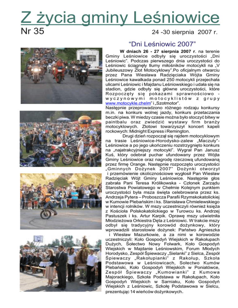 Z ¿ycia gminy Leœniowice Nr 35 24 -30 sierpnia 2007 r. “Dni Leœniowic 2007” W dniach 26 - 27 sierpnia 2007 r. na terenie Gminy Leœniowice odby³y siê uroczystoœci „Dni Leœniowic”. Podczas pierwszego dnia uroczystoœci do Leœniowic œci¹gnê³y t³umy mi³oœników motocykli na „V Jubileuszowy Zlot Motocyklowy”.Po oficjalnym otwarciu przez Pana Wies³awa Radziêciaka Wójta Gminy Leœniowice kawalkada ponad 250 motocykli przejecha³a ulicami Leœniowic i Majdanu Leœniowskiego i uda³a siê na stadion, gdzie odby³y siê g³ówne uroczystoœci, które Rozpoczê³y siê pokazami sprawnoœciowo wyczynowymi motocyklistów z grupy www.motocykle.chelm” i „Szotmotor”. Nastêpnie przeprowadzono ró¿nego rodzaju konkursy m.in. na konkurs wolnej jazdy, konkurs przetaczania beczki piwa. W miedzy czasie mo¿na by³o stoczyæ bitwy w paintbalu oraz zwiedziæ wystawy firm bran¿y motocyklowych. Zlotowi towarzyszy³ koncert kapeli rockowych: Midnight Express i Remington. Drugi dzieñ rozpocz¹³ siê rajdem motocyklowym na trasie Leœniowice-Horodysko-zalew „Maczu³y”Leœniowice a po jego ukoñczeniu rozstrzygniêto konkurs na „najatrakcyjniejszy motocykl”. Wygra³ Pan Janusz Kuœ, który odebra³ puchar ufundowany przez Wójta Gminy Leœniowice oraz nagrodê rzeczow¹ ufundowan¹ przez firmê Orange. Nastêpnie rozpoczêto uroczystoœci „Gminnych Do¿ynek 2007” Do¿ynki otworzy³ i przemówienie okolicznoœciowe wyg³osi³ Pan Wies³aw Radziêciak Wójt Gminy Leœniowice. Nastêpnie g³os zabra³a Pani Teresa Królikowska - Cz³onek Zarz¹du Starostwa Powiatowego w Che³mie Kolejnym punktem uroczystoœci by³a msza œwiêta celebrowana przez ks. Andrzeja Pytera – Proboszcza Parafii Rzymskokatolickiej w Kumowie Plebañskim i ks. Stanis³awa Chmielewskiego w intencji rolników. W mszy uczestniczyli równie¿ ksiê¿a z Koœcio³a Polskokatolickiego w Turowcu ks. Andrzej Pastuszek i ks. Artur Karpik. Oprawê mszy uœwietni³a M³odzie¿owa Orkiestra Dêta z Leœniowic. W trakcie mszy odby³ siê tradycyjny korowód do¿ynkowy, który wprowadzili starostowie do¿ynek: Pañstwo Agnieszka i Wies³aw Mazurkowie, a za nimi w korowodzie uczestniczyli: Ko³o Gospodyñ Wiejskich w Rako³upach Du¿ych, So³ectwo Nowy Folwark, Ko³o Gospodyñ Wiejskich w Majdanie Leœniowskim, Forum M³odych Horodysko, Zespó³ Œpiewaczy „Sielanki” z Sielca, Zespó³ Œpiewaczy „Rako³upianki” z Rako³up, Szko³a Podstawowa w Leœniowicach, So³ectwo Kumów Plebañski, Ko³o Gospodyñ Wiejskich w Poniatówce, Zespó³ Œpiewaczy „Kumowianki” z Kumowa Majorackiego, Szko³a Podstawa w Rako³upach, Ko³o Gospodyñ Wiejskich w Sarniaku, Ko³o Gospodyñ Wiejskich z Leœniowic, Szko³ê Podstawowa w Sielcu, prezentuj¹c 14 wieñców do¿ynkowych. Po zakoñczeniu Mszy Œwiêtej rozpoczê³a siê czêœæ artystyczna w wykonaniu: m³odzie¿y ze Szko³y Podstawowej w Rako³upach, M³odzie¿owej Orkiestry Dêtej z Leœniowic, zespo³ów œpiewaczych „Kumowianki”, „Sielanki”, „Rako³upianki”, kabaretu „Rolnik st¹d” oraz Kapeli Podwórkowej z Leœniowic. Czeœæ artystyczn¹ zakoñczy³ goœæ specjalny zespó³ disco polo „Mirage”. W czasie „Gminnych Do¿ynek 2007” odby³o siê wiele konkursów. W pierwszym konkursie na „Naj³adniejszy wieniec do¿ynkowy” komisja przyzna³a 14 równorzêdnych pierwszych miejsc dla wszystkich twórców wieñców i wytypowa³a wieniec uwity przez Forum M³odych Horodysko do reprezentowania gminy w do¿ynkach powiatowych.W konkursie na „Najsmaczniejsz¹ potrawê staropolsk¹” komisja ocenia³a 11 potraw zwracaj¹c uwagê na ich smak, u¿ycie lokalnych surowców i tradycyjnych metod ich wytwarzania. Pierwsze miejsce przyznano Panu Robertowi Szornalowi z Horodyska za s³oninê staropolsk¹, drugie miejsce przypad³o Pani Bo¿enie Czerniej z Rako³up Du¿ych za potrawê kaczka z kasz¹ i w¹tróbk¹, a trzecie miejsce otrzyma³a Pani Czes³awa Dolecka z Sarniaka za babkê kartoflan¹.W konkursie na „Najsmaczniejszy chleb wiejski” komisja oceni³a chleby dostarczone przez Panie: Poznañsk¹ Halinê z Sarniaka, Gaik Jadwigê z Kumowa Plebañskiego, Zawiœlak Kazimierê z Leœniowic, Zieliñsk¹ Jolantê z Horodyska, Mariê £opuszyñsk¹ i Ma³gorzatê Cio³ek z Leœniowic, Franciszkê Bydychaj z Sielca, El¿bietê kieliszek z Majdanu Leœniowskiego, przyznaj¹c siedem równorzêdnych pierwszych miejsc. Jednoczeœnie komisja wytypowa³a Pani¹ Jolantê Zieliñsk¹ z Horodyska do upieczenia chleba i reprezentowania gminy w do¿ynkach powiatowych. W konkursie na „Najsmaczniejszy wypiek ciasta dro¿d¿owego” zg³osi³o siê dziesiêæ pañ. Pierwsze miejsce zajê³a Pani Krystyna Popielnicka z Majdanu Leœniowskiego, drugie miejsce zajê³a Pani Wanda Skrzypa z Leœniowic a trzecie W³adys³awa Taras z Sielca. W konkursie na „Najsmaczniejszy wypiek piernika” wygra³a Pani Edyta Cio³ek z Leœniowic. Druga by³a Pani Ma³gorzata Korzan z Kumowa Majorackiego a trzecie miejsce przypad³o Pani Jolancie Paszkowskiej równie¿ z Kumowa Majorackiego.Podczas Do¿ynek zaprezentowano wystawê p³odów rolnych przygotowan¹ przez Wojewódzki Oœrodek Doradztwa Rolniczego Oddzia³a w Rejowcu, wystawê zwierz¹t, sprzêtu rolniczego oraz prace artystyczne twórców ludowych z terenu gminy. Og³oszono równie¿ wyniki konkursów: „Moje Gospodarstwo Estetyczne i bezpieczne" w dwóch kategoriach: zagroda wiejska i posesja wiejska oraz „Hodowca roku 2007 – byd³o mleczne”. W pierwszym konkursie - zagroda wiejska wœród 14 zagród w³aœcicieli gospodarstw rolnych z terenu gminy zwyciê¿y³a Pani Barbara Ferenc z miejscowoœci Teresin, drugie miejsce przypad³o Panu Eugeniuszowi Antoniukowi z miejscowoœci Sarniak a trzecie miejsce Pani Wies³awie G³az z Alojzowa.W konkursie na naj³adniejsz¹ posesjê wiejsk¹ zg³oszono 10 posesji z terenu gminy. Zwyciê¿y³a Pani Lilianna Chudoba z Teresina, drugie miejsce przypad³o Pani W
