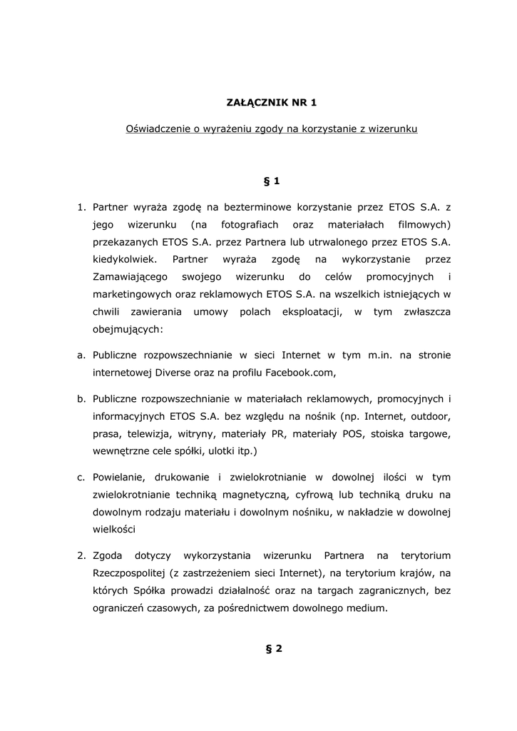 ZAŁĄCZNIK NR 1 Oświadczenie o wyrażeniu zgody na korzystanie z wizerunku §1 1. Partner wyraża zgodę na bezterminowe korzystanie przez ETOS S.A. z jego wizerunku (na fotografiach oraz materiałach filmowych) przekazanych ETOS S.A. przez Partnera lub utrwalonego przez ETOS S.A. kiedykolwiek. Zamawiającego Partner wyraża swojego zgodę wizerunku do na wykorzystanie celów przez promocyjnych i marketingowych oraz reklamowych ETOS S.A. na wszelkich istniejących w chwili zawierania umowy polach eksploatacji, w tym zwłaszcza obejmujących: a. Publiczne rozpowszechnianie w sieci Internet w tym m.in. na stronie internetowej Diverse oraz na profilu Facebook.com, b. Publiczne rozpowszechnianie w materiałach reklamowych, promocyjnych i informacyjnych ETOS S.A. bez względu na nośnik (np. Internet, outdoor, prasa, telewizja, witryny, materiały PR, materiały POS, stoiska targowe, wewnętrzne cele spółki, ulotki itp.) c. Powielanie, drukowanie i zwielokrotnianie w dowolnej ilości w tym zwielokrotnianie techniką magnetyczną, cyfrową lub techniką druku na dowolnym rodzaju materiału i dowolnym nośniku, w nakładzie w dowolnej wielkości 2. Zgoda dotyczy wykorzystania wizerunku Partnera na terytorium Rzeczpospolitej (z zastrzeżeniem sieci Internet), na terytorium krajów, na których Spółka prowadzi działalność oraz na targach zagranicznych, bez ograniczeń czasowych, za pośrednictwem dowolnego medium. §2 1. Partner przenosi na ETOS S.A. całość autorskich praw majątkowych do zdjęć oraz materiałów video przekazanych ETOS S.A, kiedykolwiek. Przeniesienie autorskich praw majątkowych do zdjęć obejmuje w szczególności następujące pola eksploatacji: a. W zakresie utrwalania i zwielokrotniania dzieła – kopiowania egzemplarzy dzieła; b. W zakresie edycji, aranżacji oraz łączenia dzieła z innymi utworami. c. W zakresie obrotu oryginałem albo nośnikami, na których dzieło utrwalono: wprowadzanie do obrotu, użyczenie lub najem oryginału lub kopii. d. Udzielania licencji na wykorzystanie dzieła, e. Wykorzystanie w Internecie, f. Wykorzystanie w sklepach firmowych, punktach sprzedaży g. Spotkaniach biznesowych 2. Partner upoważnia ETOS S.A. do: a. Zezwalania na wykonywanie zależnych praw autorskich do projektu, w tym dokonywania modyfikacji, b. Łączenia dzieła z innymi materiałami.