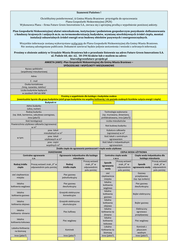 Szanowni Państwo ! Chcielibyśmy poinformować, iż Gmina Miasta Braniewo przystąpiła do opracowania Planu Gospodarki Niskoemisyjnej (PGN) Wykonawca Planu – firma Future Green Innovations S.A., zwraca się z uprzejmą prośbą o wypełnienie poniższej ankiety. Plan Gospodarki Niskoemisyjnej ułatwi mieszkańcom, instytucjom i podmiotom gospodarczym pozyskanie dofinansowania z funduszy krajowych i unijnych m.in. na termomodernizację budynków, wymianę nieefektywnych źródeł ciepła, montaż instalacji odnawialnych źródeł energii oraz budowę obiektów pasywnych i energooszczędnych. Wszystkie informacje zostaną wykorzystane wyłącznie do Planu Gospodarki Niskoemisyjnej dla Gminy Miasta Braniewo. Nie zostaną udostępniane publicznie. Dokument zawierać będzie jedynie zestawienia i wnioski z zebranych informacji. Prosimy o złożenie ankiety w Urzędzie Miasta Braniewa lub o przesłanie listownie na adres Future Green Innovations S.A. ul. Podole 60, skr. 62, 30-394 Kraków lub e-mailem na adres: [email protected] ANKIETA (AW5) -Plan Gospodarki Niskoemisyjnej dla Gminy Miasta Braniewo – SPÓŁDZIELNIE I WSPÓLNOTY MIESZKANIOWE Nazwa spółdzielni (wspólnoty) mieszkaniowej Adres E - mail Osoba kontaktowa /imię, nazwisko, telefon/ Liczba budynków będących w zasobach SM lub WM Prosimy o wypełnienie dla każdego z budynków osobno (ewentualnie łącznie dla grupy budynków jeżeli grupa budynków ma wspólna kotłownię i nie posiada osobnych liczników zużycia energii i ciepła) Budynek nr Adres budynku (ulica, numer) Rodzaj budynku Technologia wykonania (np. blok, kamienica, zabudowa szeregowa, (np. murowana, drewniana, inna (jaka?)) prefabrykowana, inna (jaka?)) Ilość kondygnacji Liczba mieszkańców Powierzchnia użytkowa całkowita (ogrzewana) Rok budowy budynku w m² pow. lokali Kubatura całkowita mieszkalnych w m² (ogrzewana) w m³ pow. lokali Ilość lokali z centralnym w tym: użytkowych w m² ogrzewaniem pow. części Ilość lokali z indywidualnym wspólnych m² ogrzewaniem Źródło ciepła do ogrzewania pomieszczeń i ciepła woda użytkowa OGRZEWANIE CIEPŁA WODA UŻYTKOWA Centralne ogrzewanie Ogrzewanie indywidualne dla każdego Centralna ciepła woda Ciepła woda indywidualna dla c.o. mieszkania c.w.u każdego mieszkania Proszę wstawić Proszę wstawić Proszę wstawić Sposób Rodzaj źródła Proszę wstawić znak „X” w Rodzaj znak „X” w znak „X” w Sposób znak „X” w ogrzewania ciepła odpowiednim polu poniżej źródła ciepła odpowiednim odpowiednim ogrzewania wody odpowiednim wody polu poniżej polu poniżej polu poniżej sieć Gazowy sieć ciepłownicza Piec gazowy ciepłownicza przepływowy miejska jednofunkcyjny miejska (np. typ Junkers) lokalna lokalna Piec gazowy Piec gazowy kotłownia kotłownia węglowa dwufunkcyjny dwufunkcyjny węglowa lokalna lokalna Grzejniki elektryczne kotłownia Bojler elektryczny kotłownia gazowa konwekcyjne gazowa lokalna lokalna Grzejniki elektryczne kotłownia Bojler gazowy kotłownia olejowa akumulacyjne olejowa lokalna Elektryczny lokalna Piec kaflowy kotłownia na ogrzewacz kotłownia -drewno drewno przepływowy lokalna lokalna Piec węglowy kotłownia Piec węglowy kotłownia koksowa koksowa Lokalna Kominek z Lokalna Kotłownia Kominek Kotłownia na płaszczem na biomasę biomasę wodnym Inne (jakie?) Inne (jakie?) Inne (jakie?) Inne (jakie?) Zużycie paliw ( rocznie) – cały rok 2012 r. Węgiel (w t/rok) Olej opałowy (w l/rok) Węgiel (w t/rok) Olej opałowy (w l/rok) Drewno ( w m³/rok) Pellet /Brykiet (w t/rok) Gaz ziemny (w m³/rok) Gaz płynny LPG (w l/rok) Inne (jakie ?) Gaz płynny LPG (w l/rok) Inne (jakie ?) Zużycie rocznie Koszt roczny (zł) Zużycie paliw ( rocznie) – cały rok 2015 r. Drewno ( w m³/rok) Pellet /Brykiet (w t/rok) Gaz ziemny (w m³/rok) Zużycie rocznie Koszt roczny (zł) Zużycie energii elektrycznej i ciepła sieciowego ( rocznie) – cały rok 2012 r. Zużycie Koszt w zł ( rocznie) Energia elektryczna Ciepło sieciowe kwh GJ Zużycie energii elektrycznej i ciepła sieciowego ( rocznie) – cały rok 2015 r. Zużycie Koszt w zł ( rocznie) Energia elektryczna Ciepło sieciowe kwh GJ Odnawialne źródła energii ( rocznie) – cały rok 2012 r. Liczba ( w sztukach) Moc dostępna w KW ( łącznie) Ilość wyprodukowanej energii Pompa ciepła Kolektory słoneczne Inne ( jakie ?) Koszt eksploatacji w zł (rocznie) kwh GJ Odnawialne źródła energii ( rocznie) – cały rok 2015 r. Liczba ( w sztukach) Moc dostępna w KW ( łącznie) Ilość wyprodukowanej energii Pompa ciepła Kolektory słoneczne Inne ( jakie ?) Koszt eksploatacji w zł (rocznie) kwh GJ Prace termomodernizacyjne wykonane i planowane Wykonane Rodzaj prac Proszę wstawić znak „X” w odpowiednim polu poniżej Data wykonania pracy (dokładna lub orientacyjna) Planowane Proszę wstawić znak „X” w odpowiednim polu poniżej Data planowanej pracy (dokładna lub orientacyjna) Koszt poniesiony lub Źródła finansowania planowany (np. środki własne, do dotacje, itp.) poniesienia w zł Wymiana okien Ocieplenie ścian zewnętrznych Ocieplenie stropu piwnicy Ocieplenie poddasza / dachu Wymiana drzwi Wymiana źródła ciepła Modernizacja instalacji c.o. Modernizacja instalacji c.w.u. Montaż pompy ciepła Montaż kolektorów słonecznych Inne ( jakie ?) Udział w działaniach Gminy Miasta Braniewo na rzecz redukcji CO2 (np. poprzez wymianę pieców, montaż kolektorów słonecznych itp.) Nie jestem Jestem zainteresowany działaniami na rzecz redukcji CO2 0% 15% 30% 50% 70% w swoim budynku przy zaangażowaniu własnych środków zainteresowany finansowych na poziomie: Planowane działania mogące wpłynąć na zwiększenie zużycia energii, paliw i ciepła. Czy planowane są w latach 2017-2022 działania mogące wpłynąć na zwiększenie zużycia energii elektrycznej, paliw lub ciepła (np. rozbudowa obiektu, zmiana sposobu użytkowania itp.) Wypełniając niniejszą ankietę wyrażam zgod
