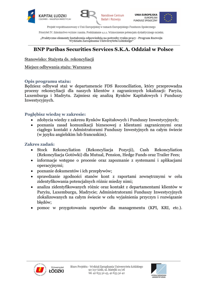 BNP Paribas Securities Services S.K.A. Oddział w Polsce Stanowisko: Stażysta ds. rekoncyliacji Miejsce odbywania stażu: Warszawa Opis programu stażu: Będziesz odbywał staż w departamencie FDS Reconciliation, który przeprowadza procesy rekoncyliacji dla naszych klientów z zagranicznych lokalizacji: Paryża, Luxemburga i Madrytu. Zajmiesz się analizą Rynków Kapitałowych i Funduszy Inwestycyjnych. Pogłębisz wiedzę w zakresie: zdobycia wiedzy z zakresu Rynków Kapitałowych i Funduszy Inwestycyjnych; poznania zasad komunikacji biznesowej z klientami zagranicznymi oraz ciągłego kontakt z Admistratorami Funduszy Inwestyjnych na całym świecie (w języku angielskim lub francuskim). Zakres zadań: Stock Rekoncyliation (Rekoncyliacja Pozycji), Cash Rekoncyliation (Rekoncyliacja Gotówki) dla Mutual, Pension, Hedge Funds oraz Trailer Fees; informacje wstępne o procesie oraz zapoznanie z systemami i aplikacjami operacyjnymi; poznanie dokumentów i ich przepływów; sprawdzanie zgodności stanów kont z raportami zewnętrznymi w celu zidentyfikowania potencjalnych różnic miedzy nimi; analiza zidentyfikowanych różnic oraz kontakt z departamentami klientów w Paryżu, Luxemburgu, Madrycie; Administratorami Funduszy Inwestycyjnych zlokalizowanych na całym świecie w celu wyjaśnienia przyczyn i rozwiązanie błędów; pomoc w przygotowaniu raportów dla managementu (KPI, KRI, etc.).