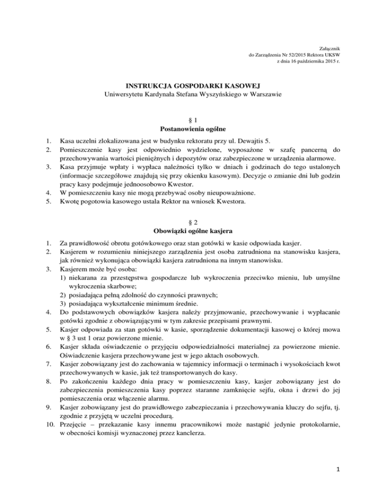 Załącznik do Zarządzenia Nr 52/2015 Rektora UKSW z dnia 16 października 2015 r. INSTRUKCJA GOSPODARKI KASOWEJ Uniwersytetu Kardynała Stefana Wyszyńskiego w Warszawie §1 Postanowienia ogólne 1. 2. 3. 4. 5. Kasa uczelni zlokalizowana jest w budynku rektoratu przy ul. Dewajtis 5. Pomieszczenie kasy jest odpowiednio wydzielone, wyposażone w szafę pancerną do przechowywania wartości pieniężnych i depozytów oraz zabezpieczone w urządzenia alarmowe. Kasa przyjmuje wpłaty i wypłaca należności tylko w dniach i godzinach do tego ustalonych (informacje szczegółowe znajdują się przy okienku kasowym). Decyzje o zmianie dni lub godzin pracy kasy podejmuje jednoosobowo Kwestor. W pomieszczeniu kasy nie mogą przebywać osoby nieupoważnione. Kwotę pogotowia kasowego ustala Rektor na wniosek Kwestora. §2 Obowiązki ogólne kasjera 1. 2. Za prawidłowość obrotu gotówkowego oraz stan gotówki w kasie odpowiada kasjer. Kasjerem w rozumieniu niniejszego zarządzenia jest osoba zatrudniona na stanowisku kasjera, jak również wykonująca obowiązki kasjera zatrudniona na innym stanowisku. 3. Kasjerem może być osoba: 1) niekarana za przestępstwa gospodarcze lub wykroczenia przeciwko mieniu, lub umyślne wykroczenia skarbowe; 2) posiadająca pełną zdolność do czynności prawnych; 3) posiadająca wykształcenie minimum średnie. 4. Do podstawowych obowiązków kasjera należy przyjmowanie, przechowywanie i wypłacanie gotówki zgodnie z obowiązującymi w tym zakresie przepisami prawnymi. 5. Kasjer odpowiada za stan gotówki w kasie, sporządzenie dokumentacji kasowej o której mowa w § 3 ust 1 oraz powierzone mienie. 6. Kasjer składa oświadczenie o przyjęciu odpowiedzialności materialnej za powierzone mienie. Oświadczenie kasjera przechowywane jest w jego aktach osobowych. 7. Kasjer zobowiązany jest do zachowania w tajemnicy informacji o terminach i wysokościach kwot przechowywanych w kasie, jak też transportowanych do kasy. 8. Po zakończeniu każdego dnia pracy w pomieszczeniu kasy, kasjer zobowiązany jest do zabezpieczenia pomieszczenia kasy poprzez staranne zamknięcie sejfu, okna i drzwi do jej pomieszczenia oraz włączenie alarmu. 9. Kasjer zobowiązany jest do prawidłowego zabezpieczania i przechowywania kluczy do sejfu, tj. zgodnie z przyjętą w uczelni procedurą. 10. Przejęcie – przekazanie kasy innemu pracownikowi może nastąpić jedynie protokolarnie, w obecności komisji wyznaczonej przez kanclerza. 1 §3 Dokumentowanie operacji kasowych 1. Wszystkie operacje kasowe wymagają udokumentowania odpowiednimi dowodami. Wpływy gotówkowe udokumentowane są dokumentem KP - kasa przyjmie, natomiast wypłaty gotówkowe dokumentami źródłowymi lub dowodami wypłat gotówkowych - KW. 2. Źródłowe dowody przed dokonaniem wypłaty muszą zostać sprawdzone pod względem merytorycznym i formalno – rachunkowym oraz zatwierdzone do wypłaty przez Kwestora i Kanclerza. 3. Przed wypłatą gotówki kasjer sprawdza, czy dowody kasowe są poprawne z formalnego punktu widzenia tzn. czy zostały podpisane przez osoby uprawnione do dokonywania tej czynności. 4. Gotówkę wypłaca się osobie wymienionej na rozchodowym dowodzie kasowym, na którym odbiorca gotówki kwituje podpisem jej odbiór. 5. Przy wypłacie gotówki kasjer zobowiązany jest stwierdzić tożsamość osoby, w tym celu może żądać okazania dowodu osobistego, legitymacji studenckiej lub innego dokumentu potwierdzającego jej tożsamość. 6. Jeżeli wypłata następuje na podstawie upoważnienia do odbioru gotówki, w dowodzie kasowym należy zaznaczyć, że dokonana ona została osobie do tego upoważnionej. Upoważnienie należy dołączyć do rozchodowego dowodu kasowego. Musi ono zawierać potwierdzenie własnoręczności podpisu osoby wystawiającej upoważnienie, w przypadku pracowników – przez Dział Kadr i Płac, w przypadku studentów – przez dziekanat wydziału lub w każdym innym przypadku przez notariusza. 7. Wpłaty gotówki mogą być dokonywane wyłącznie na podstawie ujednoliconych dowodów kasowych dla wpłat, podpisanych przez kasjera. Na dowodzie wpłaty podaje się także wpisaną słownie kwotę gotówki oraz datę i tytuł wpłaty. 8. Na dokumentach KP i KW nie można dokonywać żadnych korekt kwot. Błędy popełnione w tym zakresie wymagają anulowania wystawionych dowodów wpłat/wypłat i wystawienia kolejnych dowodów na udokumentowanie wpływów i wypłat gotówkowych. 9. Wszystkie dowody kasowe dotyczące wpłat i wypłat gotówki dokonywanych w danym dniu muszą być zaewidencjonowane w raporcie kasowym z danego dnia. Raport kasowy jest systemowo wypełniany w takiej kolejności, w jakiej następują wpłaty i wypłaty. Operacje wprowadza się do systemu informatycznego na bieżąco. 10. Po zakończeniu wpłat i wypłat w danym dniu, kasjer ma obowiązek sprawdzić stan gotówki w kasie i porównać z saldem w systemie informatycznym. W razie stwierdzenia rozbieżności kasjer podejmuje działania wyjaśniające, które musi zakończyć przed otwarciem kasy kolejnego dnia. 11. Podpisany przez kasjera oryginał raportu kasowego wraz z załącznikami jest przekazywany do wyznaczonego pracownika w Kwesturze w celu dokonania kontroli raportu, tj. sprawdzenia transakcji gotówkowych pod katem prawidłowości dokumentów które stanowiły podstawę operacji kasowych a także zgodności kwot wykazanych w raporcie kasowym z informacjami zawartymi w załącznikach. Po sprawdzeniu raport wraz z załącznikami jest przekazywany do Działu Księgowości celem ujęcia w ewidencji księgowej. Kopia raportu zostaje w kasie celem zarchiwizowania. 2 §4 Sposób postępowania w przypadku awarii systemu informatycznego 1. 2. W przypadku awarii systemu informatycznego w celu niezakłóconej obsługi interesantów w kasie stosuje się papierowe, ręcznie wypisane druki KP i KW. Poszczególne bloczki kwitów KP i KW posiadają numerację ciągłą. Wszystkie wystawione ręczni