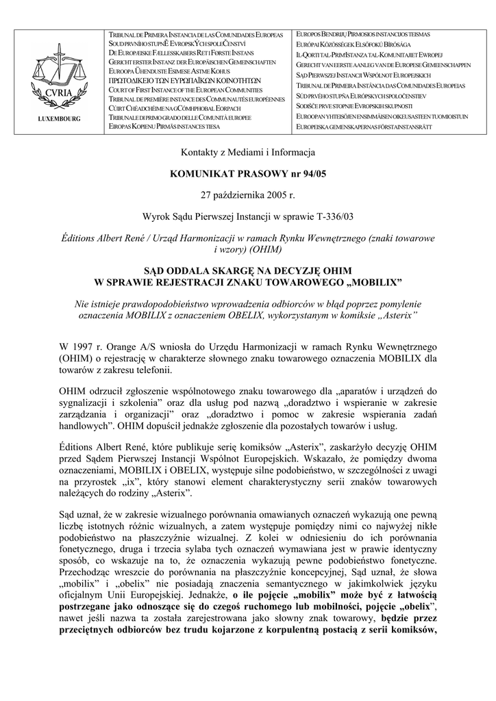 TRIBUNAL DE PRIMERA INSTANCIA DE LAS COMUNIDADES EUROPEAS SOUD PRVNÍHO STUPNĚ EVROPSKÝCH SPOLEČENSTVÍ DE EUROPÆISKE FÆLLESSKABERS RET I FØRSTE INSTANS GERICHT ERSTER INSTANZ DER EUROPÄISCHEN GEMEINSCHAFTEN EUROOPA ÜHENDUSTE ESIMESE ASTME KOHUS ΠΡΩΤΟ∆ΙΚΕΙΟ ΤΩΝ ΕΥΡΩΠΑΪΚΩΝ ΚΟΙΝΟΤΗΤΩΝ COURT OF FIRST INSTANCE OF THE EUROPEAN COMMUNITIES TRIBUNAL DE PREMIÈRE INSTANCE DES COMMUNAUTÉS EUROPÉENNES CÚIRT CHÉADCHÉIME NA GCÓMHPHOBAL EORPACH TRIBUNALE DI PRIMO GRADO DELLE COMUNITÀ EUROPEE EIROPAS KOPIENU PIRMĀS INSTANCES TIESA EUROPOS BENDRIJŲ PIRMOSIOS INSTANCIJOS TEISMAS EURÓPAI KÖZÖSSÉGEK ELSŐFOKÚ BÍRÓSÁGA IL-QORTI TAL-PRIM'ISTANZA TAL-KOMUNITAJIET EWROPEJ GERECHT VAN EERSTE AANLEG VAN DE EUROPESE GEMEENSCHAPPEN SĄD PIERWSZEJ INSTANCJI WSPÓLNOT EUROPEJSKICH TRIBUNAL DE PRIMEIRA INSTÂNCIA DAS COMUNIDADES EUROPEIAS SÚD PRVÉHO STUPŇA EURÓPSKYCH SPOLOČENSTIEV SODIŠČE PRVE STOPNJE EVROPSKIH SKUPNOSTI EUROOPAN YHTEISÖJEN ENSIMMÄISEN OIKEUSASTEEN TUOMIOISTUIN EUROPEISKA GEMENSKAPERNAS FÖRSTAINSTANSRÄTT Kontakty z Mediami i Informacja KOMUNIKAT PRASOWY nr 94/05 27 października 2005 r. Wyrok Sądu Pierwszej Instancji w sprawie T-336/03 Éditions Albert René / Urząd Harmonizacji w ramach Rynku Wewnętrznego (znaki towarowe i wzory) (OHIM) SĄD ODDALA SKARGĘ NA DECYZJĘ OHIM W SPRAWIE REJESTRACJI ZNAKU TOWAROWEGO „MOBILIX” Nie istnieje prawdopodobieństwo wprowadzenia odbiorców w błąd poprzez pomylenie oznaczenia MOBILIX z oznaczeniem OBELIX, wykorzystanym w komiksie „Asterix” W 1997 r. Orange A/S wniosła do Urzędu Harmonizacji w ramach Rynku Wewnętrznego (OHIM) o rejestrację w charakterze słownego znaku towarowego oznaczenia MOBILIX dla towarów z zakresu telefonii. OHIM odrzucił zgłoszenie wspólnotowego znaku towarowego dla „aparatów i urządzeń do sygnalizacji i szkolenia” oraz dla usług pod nazwą „doradztwo i wspieranie w zakresie zarządzania i organizacji” oraz „doradztwo i pomoc w zakresie wspierania zadań handlowych”. OHIM dopuścił jednakże zgłoszenie dla pozostałych towarów i usług. Éditions Albert René, które publikuje serię komiksów „Asterix”, zaskarżyło decyzję OHIM przed Sądem Pierwszej Instancji Wspólnot Europejskich. Wskazało, że pomiędzy dwoma oznaczeniami, MOBILIX i OBELIX, występuje silne podobieństwo, w szczególności z uwagi na przyrostek „ix”, który stanowi element charakterystyczny serii znaków towarowych należących do rodziny „Asterix”. Sąd uznał, że w zakresie wizualnego porównania omawianych oznaczeń wykazują one pewną liczbę istotnych różnic wizualnych, a zatem występuje pomiędzy nimi co najwyżej nikłe podobieństwo na płaszczyźnie wizualnej. Z kolei w odniesieniu do ich porównania fonetycznego, druga i trzecia sylaba tych oznaczeń wymawiana jest w prawie identyczny sposób, co wskazuje na to, że oznaczenia wykazują pewne podobieństwo fonetyczne. Przechodząc wreszcie do porównania na płaszczyźnie koncepcyjnej, Sąd uznał, że słowa „mobilix” i „obelix” nie posiadają znaczenia semantycznego w jakimkolwiek języku oficjalnym Unii Europejskiej. Jednakże, o ile pojęcie „mobilix” może być z łatwością postrzegane jako odnoszące się do czegoś ruchomego lub mobilności, pojęcie „obelix”, nawet jeśli nazwa ta została zarejestrowana jako słowny znak towarowy, będzie przez przeciętnych odbiorców bez trudu kojarzone z korpulentną postacią z serii komiksów, szeroko znaną w całej Unii Europejskiej. Tak więc to konkretne przedstawienie popularnej postaci czyni możliwość wprowadzenia odbiorców w błąd na płaszczyźnie koncepcyjnej wysoce mało prawdopodobną. Sąd stwierdza więc, że dzielące omawiane oznaczenia na płaszczyźnie koncepcyjnej różnice neutralizują w niniejszym przypadku podobieństwa fonetyczne, jak również ewentualne podobieństwa wizualne. Nie istnieje zatem prawdopodobieństwo wprowadzenia w błąd poprzez pomylenie obu oznaczeń. Na koniec Sąd dodał, że Éditions Albert René nie może powoływać się na jakiekolwiek prawo wyłączności do używania przyrostka „ix”. W konsekwencji Sąd oddalił skargę Éditions Albert René. UWAGA: Odwołanie od orzeczenia Sądu Pierwszej Instancji, ograniczone do kwestii prawnych, może zostać wniesione do Trybunału Sprawiedliwości Wspólnot Europejskich w terminie dwóch miesięcy od doręczenia orzeczenia. Dokument nieoficjalny, sporządzony na użytek mediów, który nie wiąże w żaden sposób Sądu Pierwszej Instancji. Dostępne wersje językowe : FR, DE, EN, IT, CS, PL, SK Pełny tekst wyroku znajduje się na stronie internetowej Trybunału http://curia.eu.int/jurisp/cgi-bin/form.pl?lang=pl Tekst jest z reguły dostępny od godz. 12.00 CET w dniu ogłoszenia. W celu uzyskania dodatkowych informacji, proszę skontaktować się z Ireneuszem Kolowcą Tel. (00352) 4303 2878 Faks (00352) 4303 2053