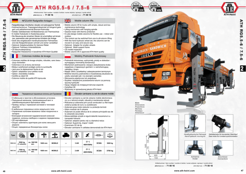 ATH RG5.5 - 6 / 7.5 - 6 Artikelnummer/itemnumber/numérod´article/numerartykułu/aртикул/numărarticol: 2 ATH RG5.5-6 - 71 00 16 ATHRG7.5-6 Mobilecolumnlifts NFZ/LKWRadgreifer-Anlagen •Radgreiferanlagemiteinfacher,robusterundwartungsarmerTechnik •Hubmechanismus:TrapezgewindespindelisthängendgelagertundselbsthemmendeBronze-Hubmutter •Antrieb:GetriebemotormitMotorbremseundThermoschutz •6mobileHubsäuleninKastenbauweise •DieSteuerungdereinzelnenSäulenistumschaltbaraufeinzelnes,paarweisesodergemeinsamesAnhebenderAnlage •DankdeseingebautemhandhydraulischenFahrwerkes sinddieRadgreifersäulenschnellundsicherverstellbar •Optional:AdapteraufsätzefürkleinereRäder •Optional:FahrbareUnterstellböcke •CE-Baumusterprüfung •Radgreifer-HebebühneinbewährterATH-HeinlQualität •Mobilecolumnliftfortruckswithsimple,robustandlowmaintenancetechnology •Liftingmechanismwithhangingspindle •Gearedmotorwiththermoprotection •6cube-designmobilecolumnsforflexibleuse–indoorand outdoor •Thecontrolcanbeswitchedfromonetoall-columnlifting •Withthehandhydraulicwheelset,thecolumnscanbe movedinaneasyandsecureway •Optional:Adapterforsmallerwheels •Optional:Mobilsupportframe •CE-modelinspection •MobilecolumnliftinapprovedATH-Heinlquality Colonnesmobilesdelevage MobilnyPodnośnikKolumnowy •Colonnesmobilesdelevagesimples,robustes,sansbeaucoupd’entretien •Colonnesàvisetécroudebronze •Moteurautofreinantprotégécontrelasurchauffe •Jackpourledéplacementfacileetsûr •Option:adaptateurpourpetitesroues •Option:chandellesmobiles •CertifiéaulabelCE •ColonnemobiledequalitéATHéprouvée •Podnośnikkolumnowy,wytrzymały,prostywobsłudzei wymagającyminimalnejkonserwacji •Mechanizmpodnoszenia:wiszącoułożyskowanaśruba napędowaztrapezowymgwintemizsamohamującą nakrętkązbrązu •Napęd:silnikzprzekładniąizabezpieczeniemtermicznym •Mobilnekolumnypodnośnikawkwadratowejobudowiedo użytkuwewnątrzjakinazewnątrzwarsztatu •Sterowaniepojedynczelubzespołowe •Szybkieibezpieczneprzestawianiekolumnzapomocą ręcznejhydrauliki •Opcja:Adapterdomniejszychkółorazwspornik •CertyfikatCE •WykonanywsprawdzonejjakościATH-Heinl •Стабильнаяипростаявобслуживанииустановка. •Подъемныймеханизм:трапециевидныйвинти самоблокирующиесябронзовыегайки •Привод:моторстормознойсистемойитепловой защитой •6мобильныхподъемныхколонмодульноготипа •Управлениеколонамивозможнотакжепоодиночнои попарно •Благодарявстроеннойгидравлическойколесной подвеске,колоннысвободноинадежнопередвигаемы. •CE-сертификация •Опция:комплектыадаптеровдляколесменьшего радиуса •Опция:передвижныеблокираторыколес kg max 2 Elevatorcamioanecusetdecoloanemobile ПередвижныеподъемныеколонныдляГрузовиков Type ATH-Heinl - 71 00 18 ATH RG5.5 - 6 / 7.5 - 6 ATH RG5.5 - 6 / 7.5 - 6 ATH-Heinl •Elevatorcamioanecusetdecoloanemobileelectromecaniccuotehnicăsimplă,robustășimentenanțaredusă •Ridicareașicoborareaprinșurubconducatorcufilettrapezoidalșipiulițadelucrucuautoblocare •Acționaregrupmotor-reductorcuprotecțietermică •Sitemmodularde6coloane •Acționaresepoateefectuadelacoloanaprincipalăsaude lacoloanelesecundare •Manevrabilitatesimplăsisigurădatoritămecanismulcu transpalethidraulic •Optional:adaptoripentruroțicudiametrulredus •Optional:Suporțitip„Capra”mobili •ExaminareCEdetip •ElevatorcamioaneîncalitateademonstratădeATH-Heinl x3 400V ? RG5.5-6 5500 kg (1 column) ca. 180/180 sec. 1600 mm MOBILE --- 3 kW RG7.5-6 7500 kg (1 column) ca. 180/180 sec. 1600 mm MOBILE --- 3 kW (3 ~) 400V/50Hz (3 ~) 400V/50Hz 3C32A 3600 kg 3C32A 3700 kg Artikelnummer/itemnumber/numérod´article/numerartykułu/aртикул/numărarticol: ATH RG5.5-6 46 www.ath-heinl.com - 71 00 16 ATHRG7.5-6 www.ath-heinl.com - 71 00 18 47