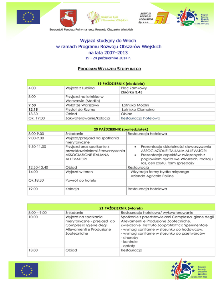 Europejski Fundusz Rolny na rzecz Rozwoju Obszarów Wiejskich Wyjazd studyjny do Włoch w ramach Programu Rozwoju Obszarów Wiejskich na lata 2007–2013 19 - 24 października 2014 r. PROGRAM WYJAZDU STUDYJNEGO 4:00 8.00 9.50 12.15 13.30 Ok. 19:00 19 PAŹDZIERNIK (niedziela) Plac Zamkowy Zbiórka 3.45 Przyjazd na lotnisko w Warszawie (Modlin) Wylot ze Warszawy Lotnisko Modlin Przylot do Rzymu Lotnisko Ciampino Obiad Obiad Zakwaterowanie/kolacja Restauracja hotelowa Wyjazd z Lublina Ok.18.30 20 PAŹDZIERNIK (poniedziałek) Śniadanie Restauracja hotelowa Wyjazd/przejazd na spotkania merytoryczne Przyjazd oraz spotkanie z Prezentacja działalności stowarzyszenia przedstawicielami Stowarzyszenia ASSOCIAZIONE ITALIANA ALLEVATORI ASSOCIAZIONE ITALIANA Prezentacja aspektów związanych z ALLEVATORI pogłowiem bydła we Włoszech, rodzaju ras, cen zbytu, form sprzedaży Obiad Restauracja Wyjazd w teren Wizytacja farmy bydła mięsnego Azienda Agricola Polline Powrót do hotelu 19.00 Kolacja 8.00-9.00 9.00-9.30 9.30-11.00 12.30-13.40 14.00 8.00 – 9.00 10.00 13.00 Restauracja hotelowa 21 PAŹDZIERNIK (wtorek) Śniadanie Restauracja hotelowa/ wykwaterowanie Wyjazd na spotkania Spotkanie z przedstawielami Complessa Igiene degli merytoryczne - przejazd do Allevamenti e Produzione Zootecniche. Complessa Igiene degli Zwiedzanie Instituto Zooprofilattico Sperimentale Allevamenti e Produzione - wymogi sanitarne w stosunku do hodowców, Zootecniche - wymogi sanitarne w stosunku do przetwórców - choroby - kontrole - opłaty Obiad Restauracja 16.00 Wyjazd w teren – wizytacja ubojnia Viterbo Spotkanie z przedstawicielami ubojni Viterbo Butcher Service 20.00 Zakwaterowanie/Kolacja Zakwaterowanie/ kolacja Restauracja hotelowa 7:00 – 8:00 8.30 22 PAŹDZIERNIK (środa) Śniadanie Restauracja hotelowa Wyjazd na spotkania Wizyta na farmie bawolów, producent mozzarelli merytoryczne-wizytacja di buffala www.lamaremmana.it 12.30 -13.30 14.30 Obiad Wyjazd na spotkania merytoryczne 16.30 Spotkanie z przedstawicielem Wizyta w ubojni/rzeżni w Braccagni ubojni/ rzeźni kolacja Restauracja hotelowa 20.00 Restauracja Spotkanie z dyrektorem Confederazione Italiana Agricoltori (stowarzyszenie rolników)oraz przedstawicielami hodowców w Grosseto 23 PAŹDZIERNIK (czwartek) Restauracja hotelowa 8.00=9.00 Śniadanie 10.00 – wyjazd na spotkania merytoryczne Spotkanie w Grosseto - spotkanie z dyrektorem Wydziału Rolnictwa (władze regionalne) -spotkanie z przedstawicielem służby weterynaryjnej ASL -spotkanie z przedstawicielem stowarzyszenia hodowców 13.00 Obiad Restauracja 15.30 20.00 Spotkanie z przedstawicielem Wizyta w hodowli rasy chianina w Cinigiano hodowli Azienda Magini Simona Kolacja Hotelowa restauracja 6.00-7.00 12:10 24 PAŹDZIERNIK (piątek) Śniadanie /Wykwaterowanie Wylot z Rzymu Lotnisko Ciampino 14.30 Przylot do Warszawy Ok. 20.30 Przyjazd do Lublina (w trakcie przejazdu obiad) Lotnisko Modlin
