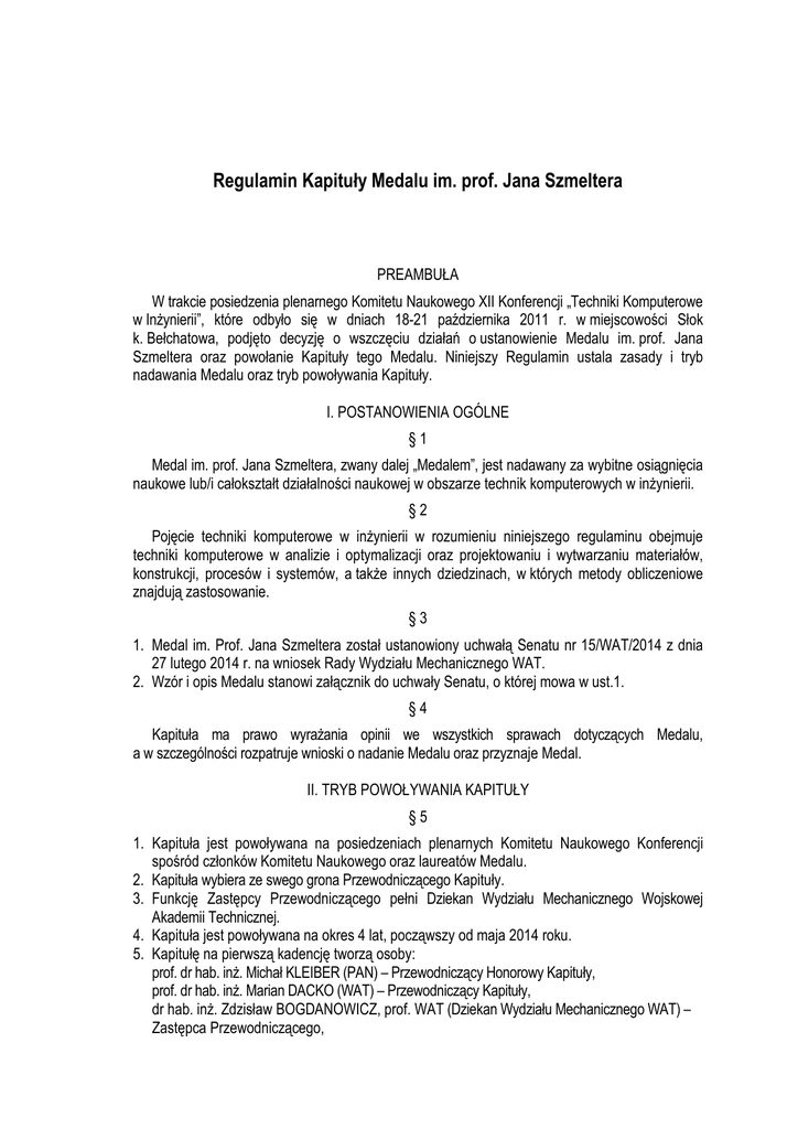 Regulamin Kapituły Medalu im. prof. Jana Szmeltera PREAMBUŁA W trakcie posiedzenia plenarnego Komitetu Naukowego XII Konferencji „Techniki Komputerowe w Inżynierii”, które odbyło się w dniach 18-21 października 2011 r. w miejscowości Słok k. Bełchatowa, podjęto decyzję o wszczęciu działań o ustanowienie Medalu im. prof. Jana Szmeltera oraz powołanie Kapituły tego Medalu. Niniejszy Regulamin ustala zasady i tryb nadawania Medalu oraz tryb powoływania Kapituły. I. POSTANOWIENIA OGÓLNE §1 Medal im. prof. Jana Szmeltera, zwany dalej „Medalem”, jest nadawany za wybitne osiągnięcia naukowe lub/i całokształt działalności naukowej w obszarze technik komputerowych w inżynierii. §2 Pojęcie techniki komputerowe w inżynierii w rozumieniu niniejszego regulaminu obejmuje techniki komputerowe w analizie i optymalizacji oraz projektowaniu i wytwarzaniu materiałów, konstrukcji, procesów i systemów, a także innych dziedzinach, w których metody obliczeniowe znajdują zastosowanie. §3 1. Medal im. Prof. Jana Szmeltera został ustanowiony uchwałą Senatu nr 15/WAT/2014 z dnia 27 lutego 2014 r. na wniosek Rady Wydziału Mechanicznego WAT. 2. Wzór i opis Medalu stanowi załącznik do uchwały Senatu, o której mowa w ust.1. §4 Kapituła ma prawo wyrażania opinii we wszystkich sprawach dotyczących Medalu, a w szczególności rozpatruje wnioski o nadanie Medalu oraz przyznaje Medal. II. TRYB POWOŁYWANIA KAPITUŁY §5 1. Kapituła jest powoływana na posiedzeniach plenarnych Komitetu Naukowego Konferencji spośród członków Komitetu Naukowego oraz laureatów Medalu. 2. Kapituła wybiera ze swego grona Przewodniczącego Kapituły. 3. Funkcję Zastępcy Przewodniczącego pełni Dziekan Wydziału Mechanicznego Wojskowej Akademii Technicznej. 4. Kapituła jest powoływana na okres 4 lat, począwszy od maja 2014 roku. 5. Kapitułę na pierwszą kadencję tworzą osoby: prof. dr hab. inż. Michał KLEIBER (PAN) – Przewodniczący Honorowy Kapituły, prof. dr hab. inż. Marian DACKO (WAT) – Przewodniczący Kapituły, dr hab. inż. Zdzisław BOGDANOWICZ, prof. WAT (Dziekan Wydziału Mechanicznego WAT) – Zastępca Przewodniczącego, oraz członkowie Kapituły prof. dr hab. inż. Jacek CHRÓŚCIELEWSKI (Politechnika Gdańska), prof. dr hab. inż. Stanisław DOBROCIŃSKI (Akademia Marynarki Wojennej), prof. dr hab. inż. Tomasz ŁODYGOWSKI (Politechnika Poznańska), prof. dr hab. inż. Tadeusz NIEZGODA (Wojskowa Akademia Techniczna), prof. dr hab. inż. Tadeusz NIEZGODZIŃSKI (Politechnika Łódzka), prof. dr hab. inż. Janusz ORKISZ (Politechnika Krakowska), prof. dr hab. inż. Eugeniusz RUSIŃSKI (Politechnika Wrocławska), prof. dr hab. inż. Eugeniusz ŚWITOŃSKI (Politechnika Śląska). 6. Przewodniczący Kapituły kieruje całością prac, ustala porządek dzienny posiedzeń i im przewodniczy. 7. W przypadku nieobecności Przewodniczącego Kapituły, jego obowiązki, o których mowa w ust. 6 przejmuje Zastępca Przewodniczącego Kapituły. 8. Kapituła powołuje spoza swojego grona Sekretarza Kapituły, który prowadzi dokumentację, opracowuje składane wnioski i przygotowuje uroczystości wręczenia medali. 9. Na Sekretarza Kapituły w pierwszej kadencji powołuje się mgr Jolantę MARYEWSKĄ z Katedry Mechaniki i Informatyki Stosowanej Wydziału Mechanicznego Wojskowej Akademii Technicznej. 10. Kapituła powołuje ponadto pięciu kandydatów rezerwowych, którzy zajmą miejsce w składzie Kapituły w sytuacji, gdy w trakcie trwania kadencji, z różnych przyczyn, zostanie zwolnione miejsce w jej składzie. 11. Skład osobowy Kapituły, nie wliczając Sekretarza, nie powinien przekroczyć 11 osób. §6 Głównym organizatorem Konferencji Techniki Komputerowe w Inżynierii, zwanej dalej „Konferencją” jest Katedra Mechaniki i Informatyki Stosowanej Wydziału Mechanicznego WAT. §7 Skład Komitetu Naukowego Konferencji wybierany jest w trakcie posiedzeń Rady Programowej Konferencji. Skład Rady Programowej określa na rok przed Konferencją Kierownik Katedry Mechaniki i Informatyki Stosowanej. III. ZASADY NADAWANIA MEDALU §8 1. Wnioski o nadanie Medalu mogą być składane z własnej inicjatywy przez członków Kapituły, laureatów Medalu oraz przez grupę minimum 5 członków Komitetu Naukowego Konferencji. 2. Pisemny wniosek o nadanie Medalu powinien zawierać dane i charakterystykę osoby oraz określenie zasług uzasadniających nadanie Medalu. 3. Wnioski należy składać do Sekretarza Kapituły do końca stycznia roku, w którym Medal ma być nadany. W uzasadnionych przypadkach powyższy termin może zostać wydłużony. §9 1. Kryteria merytoryczne nadania Medalu określa Kapituła. 2. Wnioski o nadanie Medalu rozpatrywane są w trakcie posiedzenia Kapituły. 3. Przewodniczący Kapituły zwołuje posiedzenie Kapituły najpóźniej do końca marca roku, w którym Medal ma być nadany. 4. Do ważności głosowania Kapituły nad nadaniem Medalu niezbędny jest udział w głosowaniu ponad 1/2 składu osobowego Kapituły. 5. W trakcie głosowania, wszystkie uchwały Kapituły zapadają bezwzględną większością głosów. 6. Dopuszcza się możliwość głosowania za pomocą środków bezpośredniego porozumiewania się na odległość oraz przez pełnomocnika. 7. W przypadku wyniknięcia kwestii spornych, nieobjętych niniejszym regulaminem, decydujący głos należy do Przewodniczącego. 8. Uchwały podjęte na posiedzeniu Kapituły w sprawie nadania Medalu są ostateczne. § 10 Protokół stwierdzający nadanie Medalu podpisują wszyscy członkowie Kapituły obecni na posiedzeniu. § 11 1. Medal nadawany jest osobom fizycznym. 2. W trakcie okresu zamkniętego kolejną edycją Konferencji Medale mogą być nadane co najwyżej 2 osobom w każdej z poniższych kategorii: − całokształt działalności – w kolorze złota; − bezpośrednie osiągnięcie – w kolorze srebra; − dokonania młodego (do 35 lat) pracownika nauki – w kolorze brązu