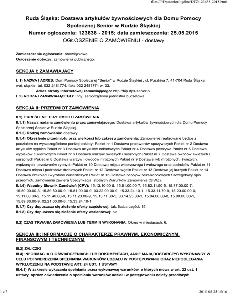 1z7 file://///Dpssenior/ogólne/DTZ/123638-2015.html Ruda Śląska: Dostawa artykułów żywnościowych dla Domu Pomocy Społecznej Senior w Rudzie Śląskiej Numer ogłoszenia: 123638 - 2015; data zamieszczenia: 25.05.2015 OGŁOSZENIE O ZAMÓWIENIU - dostawy Zamieszczanie ogłoszenia: obowiązkowe. Ogłoszenie dotyczy: zamówienia publicznego. SEKCJA I: ZAMAWIAJĄCY I. 1) NAZWA I ADRES: Dom Pomocy Społecznej "Senior" w Rudzie Śląskiej , ul. Puszkina 7, 41-704 Ruda Śląska, woj. śląskie, tel. 032 2481774, faks 032 2481774 w. 33. Adres strony internetowej zamawiającego: http://bip.dps-senior.pl I. 2) RODZAJ ZAMAWIAJĄCEGO: Inny: samorządowa jednostka budżetowa. SEKCJA II: PRZEDMIOT ZAMÓWIENIA II.1) OKREŚLENIE PRZEDMIOTU ZAMÓWIENIA II.1.1) Nazwa nadana zamówieniu przez zamawiającego: Dostawa artykułów żywnościowych dla Domu Pomocy Społecznej Senior w Rudzie Śląskiej. II.1.2) Rodzaj zamówienia: dostawy. II.1.4) Określenie przedmiotu oraz wielkości lub zakresu zamówienia: Zamówienie realizowane będzie z podziałem na wyszczególnione poniżej pakiety: Pakiet nr 1 Dostawa przetworów spożywczych Pakiet nr 2 Dostawa artykułów sypkich Pakiet nr 3 Dostawa artykułów nabiałowych Pakiet nr 4 Dostawa pieczywa Pakiet nr 5 Dostawa wypieków cukierniczych Pakiet nr 6 Dostawa warzyw świeżych i suszonych Pakiet nr 7 Dostawa owoców świeżych i suszonych Pakiet nr 8 Dostawa warzyw i owoców mrożonych Pakiet nr 9 Dostawa ryb mrożonych, świeżych, wędzonych i przetworów rybnych Pakiet nr 10 Dostawa mięsa wieprzowego i wołowego oraz podrobów Pakiet nr 11 Dostawa mięsa i podrobów drobiowych Pakiet nr 12 Dostawa wędlin Pakiet nr 13 Dostawa jaj kurzych Pakiet nr 14 Dostawa czekolad i wyrobów cukierniczych Pakiet nr 15 Dostawa napojów bezalkoholowych Szczegółowy opis przedmiotu zamówienia zawiera Specyfikacja Istotnych Warunków Zamówienia (SIWZ). II.1.6) Wspólny Słownik Zamówień (CPV): 15.13.10.00-5, 15.61.00.00-7, 15.82.11.50-5, 15.87.00.00-7, 15.50.00.00-3, 15.89.80.00-9, 15.81.00.00-9, 03.22.00.00-9, 15.33.24.10-1, 15.33.11.70-9, 15.20.00.00-0, 15.11.00.00-2, 15.11.40.00-0, 15.11.23.00-9, 15.13.11.30-5, 03.14.25.00-3, 15.84.00.00-8, 15.98.00.00-1, 15.89.80.00-9, 02.21.00.00-6, 15.33.24.10-1. II.1.7) Czy dopuszcza się złożenie oferty częściowej: tak, liczba części: 15. II.1.8) Czy dopuszcza się złożenie oferty wariantowej: nie. II.2) CZAS TRWANIA ZAMÓWIENIA LUB TERMIN WYKONANIA: Okres w miesiącach: 6. SEKCJA III: INFORMACJE O CHARAKTERZE PRAWNYM, EKONOMICZNYM, FINANSOWYM I TECHNICZNYM III.2) ZALICZKI III.4) INFORMACJA O OŚWIADCZENIACH LUB DOKUMENTACH, JAKIE MAJĄ DOSTARCZYĆ WYKONAWCY W CELU POTWIERDZENIA SPEŁNIANIA WARUNKÓW UDZIAŁU W POSTĘPOWANIU ORAZ NIEPODLEGANIA WYKLUCZENIU NA PODSTAWIE ART. 24 UST. 1 USTAWY III.4.1) W zakresie wykazania spełniania przez wykonawcę warunków, o których mowa w art. 22 ust. 1 ustawy, oprócz oświadczenia o spełnianiu warunków udziału w postępowaniu należy przedłożyć: 2015-05-25 15:16 2z7 file://///Dpssenior/ogólne/DTZ/123638-2015.html potwierdzenie posiadania uprawnień do wykonywania określonej działalności lub czynności, jeżeli przepisy prawa nakładają obowiązek ich posiadania, w szczególności koncesje, zezwolenia lub licencje; III.4.2) W zakresie potwierdzenia niepodlegania wykluczeniu na podstawie art. 24 ust. 1 ustawy, należy przedłożyć: oświadczenie o braku podstaw do wykluczenia; III.4.4) Dokumenty dotyczące przynależności do tej samej grupy kapitałowej lista podmiotów należących do tej samej grupy kapitałowej w rozumieniu ustawy z dnia 16 lutego 2007 r. o ochronie konkurencji i konsumentów albo informacji o tym, że nie należy do grupy kapitałowej; SEKCJA IV: PROCEDURA IV.1) TRYB UDZIELENIA ZAMÓWIENIA IV.1.1) Tryb udzielenia zamówienia: przetarg nieograniczony. IV.2) KRYTERIA OCENY OFERT IV.2.1) Kryteria oceny ofert: najniższa cena. IV.4) INFORMACJE ADMINISTRACYJNE IV.4.1) Adres strony internetowej, na której jest dostępna specyfikacja istotnych warunków zamówienia: http://bip.dps-senior.pl Specyfikację istotnych warunków zamówienia można uzyskać pod adresem: Dom Pomocy Społecznej SENIOR w Rudzie Śląskiej ul. Puszkina 7 Ruda Śląska 41-704 Dział Techniczno- Zaopatrzeniowy pok nr 4. IV.4.4) Termin składania wniosków o dopuszczenie do udziału w postępowaniu lub ofert: 02.06.2015 godzina 11:30, miejsce: Dom Pomocy Społecznej SENIOR w Rudzie Śląskiej ul. Puszkina 7 Ruda Śląska 41-704 pok nr 1. IV.4.5) Termin związania ofertą: okres w dniach: 30 (od ostatecznego terminu składania ofert). IV.4.17) Czy przewiduje się unieważnienie postępowania o udzielenie zamówienia, w przypadku nieprzyznania środków pochodzących z budżetu Unii Europejskiej oraz niepodlegających zwrotowi środków z pomocy udzielonej przez państwa członkowskie Europejskiego Porozumienia o Wolnym Handlu (EFTA), które miały być przeznaczone na sfinansowanie całości lub części zamówienia: nie ZAŁĄCZNIK I - INFORMACJE DOTYCZĄCE OFERT CZĘŚCIOWYCH CZĘŚĆ Nr: 1 NAZWA: DOSTAWA PRZETWORÓW SPOŻYWCZYCH. 1) Krótki opis ze wskazaniem wielkości lub zakresu zamówienia: Ananas kons. plastry-(masa netto bez zalewy) 300-1000g kg 10 Brzoskwinie kons.-(masa netto bez zalewy) 300-1000g kg 10 Chrzan tarty na kwasku cytrynowym 170-300g kg 20 Ćwikła z chrzanem 250-500g kg 10 Dżemy owocowe niskosłodzone z kawałkami owoców (różne smaki) 250-350g kg 70 Fasola czerwona, biała konserwowa-(masa netto bez zalewy) 200-500g kg 10 Fasola szparagowa konserwowa-(masa netto bez zalewy) 200-1000g kg 40 Groszek konserwowy- (masa netto bez zalewy) 200-500g kg 60 Ketchup łagodny(minimum 55% przecieru pomidorowego 250-1000g kg 90 Koncentrat pomidorowy30% 800-1000g kg 75 Koncentrat pomidorowy30% 180-250g kg 30 Koncentrat buraczany płynny min.12% soku z buraków 180-500g kg 7 Krem czekoladowy do smarowania z dodatkiem orzechów 180-400g kg 12 Kukurydza konserwowa- (mas