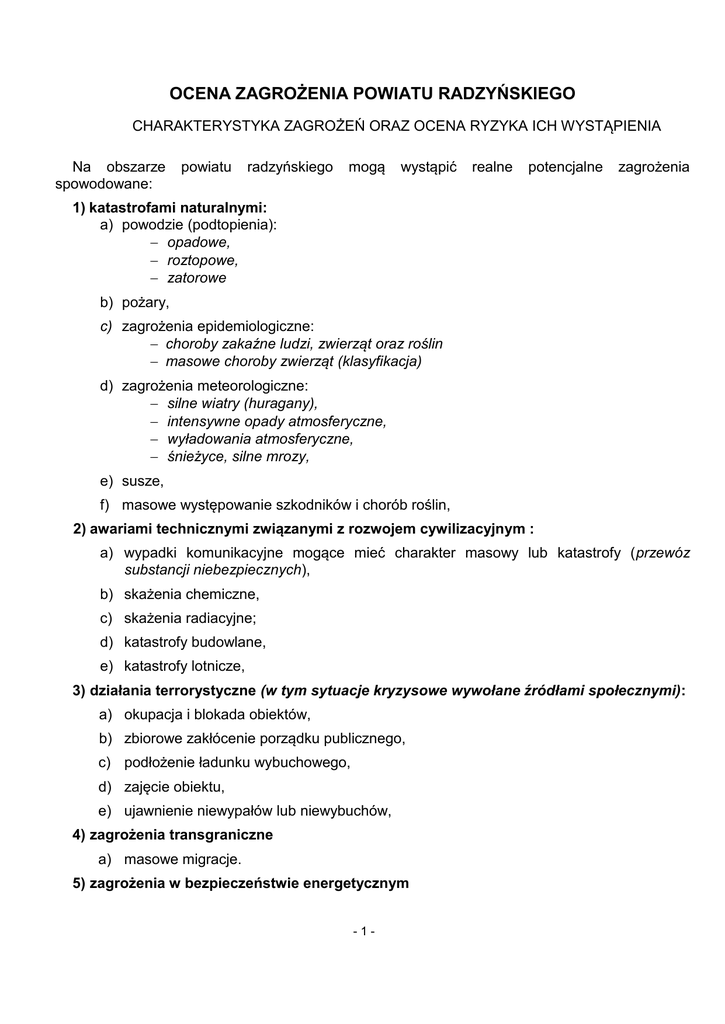 OCENA ZAGROŻENIA POWIATU RADZYŃSKIEGO CHARAKTERYSTYKA ZAGROŻEŃ ORAZ OCENA RYZYKA ICH WYSTĄPIENIA Na obszarze spowodowane: powiatu radzyńskiego mogą wystąpić realne potencjalne zagrożenia 1) katastrofami naturalnymi: a) powodzie (podtopienia): opadowe, roztopowe, zatorowe b) pożary, c) zagrożenia epidemiologiczne: choroby zakaźne ludzi, zwierząt oraz roślin masowe choroby zwierząt (klasyfikacja) d) zagrożenia meteorologiczne: silne wiatry (huragany), intensywne opady atmosferyczne, wyładowania atmosferyczne, śnieżyce, silne mrozy, e) susze, f) masowe występowanie szkodników i chorób roślin, 2) awariami technicznymi związanymi z rozwojem cywilizacyjnym : a) wypadki komunikacyjne mogące mieć charakter masowy lub katastrofy (przewóz substancji niebezpiecznych), b) skażenia chemiczne, c) skażenia radiacyjne; d) katastrofy budowlane, e) katastrofy lotnicze, 3) działania terrorystyczne (w tym sytuacje kryzysowe wywołane źródłami społecznymi): a) okupacja i blokada obiektów, b) zbiorowe zakłócenie porządku publicznego, c) podłożenie ładunku wybuchowego, d) zajęcie obiektu, e) ujawnienie niewypałów lub niewybuchów, 4) zagrożenia transgraniczne a) masowe migracje. 5) zagrożenia w bezpieczeństwie energetycznym -1- KATALOG ZAGROŻEŃ (rodzaj zagrożenia) MAPA RYZYKA, ZAGROŻENIA (możliwe skutki wystąpienia zagrożenia) PRAWDOPODOBIEŃSTW O WYSTĄPIENIA ZAGROŻENIA OBSZAR WYSTĘPOWANIA KATASTROFY NATURALNE Powodzie (podtopienia) a) opadowe Powodzie (podtopienia) opadowe występują najczęściej w maju, czerwcu, lipcu, sierpniu i wrześniu. Ich zasięg i gwałtowność przebiegu zależą od charakteru deszczu, czasu jego trwania, stopnia uwilgotnienia zlewni w momencie wystąpienia opadu, warunków fizycznogeograficznych zlewni (ukształtowanie i pokrycia terenu). Z uwagi na charakter deszczu powodzie te można podzielić na powodzie (podtopienia) wywołane deszczami: nawalnymi, frontalnymi i rozlewnymi. Powodzie (podtopienia) wywołane deszczami nawalnymi, bardzo gwałtownymi, lecz z reguły krótko trwającymi i posiadającymi niewielki zasięg terytorialny, mają zwykle charakter lokalny. Mogą powodować dotkliwe straty ze względu na bardzo szybki i trudny do przewidzenia przybór wody. W terenach górskich i podgórskich mogą występować już przy opadzie 30 mm trwającym w ciągu 2 godz., natomiast na nizinach wskutek opadu rzędu 60 – 80 mm. Opady nawalne tworzą się przede wszystkim nad zboczami o południowej ekspozycji, położonymi na skrajach obszarów wyniosłości terenowych, przylegających do terenów wybitnie uwilgotnionych. Powodzie spowodowane opadami frontalnymi posiadają podobny przebieg lecz znacznie większy zasięg terytorialny. Mogą wystąpić zarówno na terenach górskich jak i nizinnych. Powodzie wywołane deszczami rozlewnymi występują w terenach nizinnych oraz górskich, gdzie tworzenie się wezbrań pod wpływem długotrwałych deszczów sprzyja układ orograficzny. Zasięg terytorialny tych powodzi jest największy i może obejmować całe dorzecze. -2- 1. 2. 3. 4. 5. 6. Nie występują Bardzo rzadkie Rzadkie Możliwe Prawdopodobne Bardzo prawdopodobne Na teren całego powiatu radzyńskiego (szczególnie gminy: Borki i Czemierniki) Z analizy wielkości opadów będących przyczyną powodzi (podtopień) typu frontalnego i rozlewnego widać, iż wielkość deszczu spadłego w ciągu 2 – 4 dni może znacznie przekraczać normę miesięczną. b) roztopowe Powodzie (podtopienia) roztopowe, związane z gwałtownym topnieniem pokrywy śnieżnej, najczęściej występują w drugiej połowie lutego, w marcu oraz pierwszej dekadzie kwietnia. Warunki sprzyjające do powstania tego typu powodzi to ocieplenie z równoczesnym stąpieniem deszczu przy jeszcze zamarzniętym podłożu, co powoduje gwałtowny odpływ powierzchniowy. Zasięg terytorialny powodzi roztopowych jest duży. c) zatorowe Powodzie zatorowe podzielić można na zatorowo - lodowe i zatorowo - śryżowe. Zatorem lodowym nazywamy nagromadzenie lodu w określonym miejscu, które w rzece ogranicza przepływ wody. Natomiast zator śryżowy powoduje masa składającego się głównie ze śryżu lub połamanego lodu nagromadzona pod pokrywą lodową w obszarze niskich prędkości przepływu. Powodzie zatorowo – lodowe występują w czasie spływu lodów, na rzekach w miejscach do tego predysponowanych. Na nieuregulowanych odcinkach rzek spływająca kra zatrzymuje się w lokalnych przewężeniach, na łachach, wyspach, w miejscach nagłych zmian kierunku przepływu, w profilach mostowych czy w górnych odcinkach piętrzeń zaporowych (zbiornikowych), zwłaszcza gdy przed piętrzeniem nie jest właściwie uporządkowana czasza zbiornika. Dopływająca z góry kra zatyka wówczas koryto rzeki, hamując odpływ powoduje piętrzenie wód i wylewanie się ich w doliny. Ten typ powodzi występuje w Polsce zarówno w rzekach górskich, jak i nizinnych, najczęściej w drugiej połowie lutego i w marcu ale niekiedy i wcześniej np. w styczniu. Dotychczas -3- 1. 2. 3. 4. 5. 6. Nie występują Bardzo rzadkie Rzadkie Możliwe Prawdopodobne Bardzo prawdopodobne 1. 2. 3. 4. 5. 6. Nie występują Bardzo rzadkie Rzadkie Możliwe Prawdopodobne Bardzo prawdopodobne Na teren całego powiatu radzyńskiego (szczególnie gminy: Borki i Czemierniki) Na teren całego powiatu radzyńskiego (szczególnie gminy: Borki i Czemierniki) zagrożenie przez zatory lodowe udawało się prawie w każdym przypadku likwidować za pomocą lodołamaczy lub materiałów wybuchowych. Powodzie zatorowo – śryżowe mają miejsce przy znacznym obciążeniu przepływu lodem dennym i śryżem, co zmniejsza prędkość przepływu i powoduje podpiętrzenie wody w korycie. Zjawisko to występuje w określonych warunkach barycznych w czasie wyżu poprzedzonego układem niżowym nocą, przy bezchmurnym niebie i gwałtownych spadkach temperatury do – 10 °C, najczęściej w grudniu i styczniu. Występuj