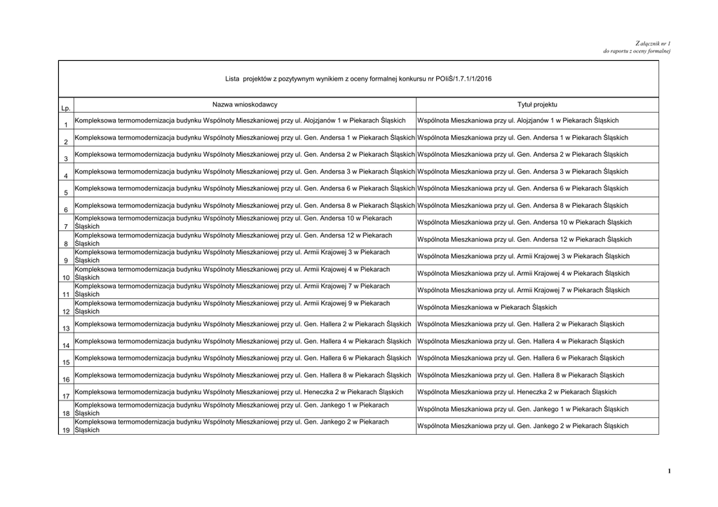 Z ałącznik nr 1 do raportu z oceny formalnej Lista projektów z pozytywnym wynikiem z oceny formalnej konkursu nr POIiŚ/1.7.1/1/2016 Lp. 1 2 3 4 5 6 Nazwa wnioskodawcy Kompleksowa termomodernizacja budynku Wspólnoty Mieszkaniowej przy ul. Alojzjanów 1 w Piekarach Śląskich Kompleksowa termomodernizacja budynku Wspólnoty Mieszkaniowej przy ul. Gen. Andersa 2 w Piekarach Śląskich Wspólnota Mieszkaniowa przy ul. Gen. Andersa 2 w Piekarach Śląskich Kompleksowa termomodernizacja budynku Wspólnoty Mieszkaniowej przy ul. Gen. Andersa 3 w Piekarach Śląskich Wspólnota Mieszkaniowa przy ul. Gen. Andersa 3 w Piekarach Śląskich Kompleksowa termomodernizacja budynku Wspólnoty Mieszkaniowej przy ul. Gen. Andersa 6 w Piekarach Śląskich Wspólnota Mieszkaniowa przy ul. Gen. Andersa 6 w Piekarach Śląskich Kompleksowa termomodernizacja budynku Wspólnoty Mieszkaniowej przy ul. Gen. Andersa 8 w Piekarach Śląskich Wspólnota Mieszkaniowa przy ul. Gen. Andersa 8 w Piekarach Śląskich Kompleksowa termomodernizacja budynku Wspólnoty Mieszkaniowej przy ul. Gen. Andersa 10 w Piekarach Śląskich Kompleksowa termomodernizacja budynku Wspólnoty Mieszkaniowej przy ul. Gen. Andersa 12 w Piekarach 8 Śląskich Kompleksowa termomodernizacja budynku Wspólnoty Mieszkaniowej przy ul. Armii Krajowej 3 w Piekarach 9 Śląskich Kompleksowa termomodernizacja budynku Wspólnoty Mieszkaniowej przy ul. Armii Krajowej 4 w Piekarach 10 Śląskich Kompleksowa termomodernizacja budynku Wspólnoty Mieszkaniowej przy ul. Armii Krajowej 7 w Piekarach 11 Śląskich Kompleksowa termomodernizacja budynku Wspólnoty Mieszkaniowej przy ul. Armii Krajowej 9 w Piekarach 12 Śląskich 14 15 16 17 Wspólnota Mieszkaniowa przy ul. Alojzjanów 1 w Piekarach Śląskich Kompleksowa termomodernizacja budynku Wspólnoty Mieszkaniowej przy ul. Gen. Andersa 1 w Piekarach Śląskich Wspólnota Mieszkaniowa przy ul. Gen. Andersa 1 w Piekarach Śląskich 7 13 Tytuł projektu Wspólnota Mieszkaniowa przy ul. Gen. Andersa 10 w Piekarach Śląskich Wspólnota Mieszkaniowa przy ul. Gen. Andersa 12 w Piekarach Śląskich Wspólnota Mieszkaniowa przy ul. Armii Krajowej 3 w Piekarach Śląskich Wspólnota Mieszkaniowa przy ul. Armii Krajowej 4 w Piekarach Śląskich Wspólnota Mieszkaniowa przy ul. Armii Krajowej 7 w Piekarach Śląskich Wspólnota Mieszkaniowa w Piekarach Śląskich Kompleksowa termomodernizacja budynku Wspólnoty Mieszkaniowej przy ul. Gen. Hallera 2 w Piekarach Śląskich Wspólnota Mieszkaniowa przy ul. Gen. Hallera 2 w Piekarach Śląskich Kompleksowa termomodernizacja budynku Wspólnoty Mieszkaniowej przy ul. Gen. Hallera 4 w Piekarach Śląskich Wspólnota Mieszkaniowa przy ul. Gen. Hallera 4 w Piekarach Śląskich Kompleksowa termomodernizacja budynku Wspólnoty Mieszkaniowej przy ul. Gen. Hallera 6 w Piekarach Śląskich Wspólnota Mieszkaniowa przy ul. Gen. Hallera 6 w Piekarach Śląskich Kompleksowa termomodernizacja budynku Wspólnoty Mieszkaniowej przy ul. Gen. Hallera 8 w Piekarach Śląskich Wspólnota Mieszkaniowa przy ul. Gen. Hallera 8 w Piekarach Śląskich Kompleksowa termomodernizacja budynku Wspólnoty Mieszkaniowej przy ul. Heneczka 2 w Piekarach Śląskich Kompleksowa termomodernizacja budynku Wspólnoty Mieszkaniowej przy ul. Gen. Jankego 1 w Piekarach 18 Śląskich Kompleksowa termomodernizacja budynku Wspólnoty Mieszkaniowej przy ul. Gen. Jankego 2 w Piekarach 19 Śląskich Wspólnota Mieszkaniowa przy ul. Heneczka 2 w Piekarach Śląskich Wspólnota Mieszkaniowa przy ul. Gen. Jankego 1 w Piekarach Śląskich Wspólnota Mieszkaniowa przy ul. Gen. Jankego 2 w Piekarach Śląskich 1 Z ałącznik nr 1 do raportu z oceny formalnej Lista projektów z pozytywnym wynikiem z oceny formalnej konkursu nr POIiŚ/1.7.1/1/2016 Lp. 20 21 22 23 24 25 26 27 28 29 Nazwa wnioskodawcy Kompleksowa termomodernizacja budynku Wspólnoty Mieszkaniowej przy ul. Gen. Jankego 4 w Piekarach Śląskich Kompleksowa termomodernizacja budynku Wspólnoty Mieszkaniowej przy ul. Gen. Kleeberga 1 w Piekarach Śląskich Kompleksowa termomodernizacja budynku Wspólnoty Mieszkaniowej przy ul. Gen. Kleeberga 2 w Piekarach Śląskich Kompleksowa termomodernizacja budynku Wspólnoty Mieszkaniowej przy ul. Gen. Kleeberga 3 w Piekarach Śląskich Kompleksowa termomodernizacja budynku Wspólnoty Mieszkaniowej przy ul. Gen. Kleeberga 4 w Piekarach Śląskich Kompleksowa termomodernizacja budynku Wspólnoty Mieszkaniowej przy ul. Gen. Kleeberga 5 w Piekarach Śląskich Kompleksowa termomodernizacja budynku Wspólnoty Mieszkaniowej przy ul. Gen. Kleeberga 7 w Piekarach Śląskich Kompleksowa termomodernizacja budynku Wspólnoty Mieszkaniowej przy ul. Gen. Kleeberga 9 w Piekarach Śląskich Tytuł projektu Wspólnota Mieszkaniowa przy ul. Gen. Jankego 4 w Piekarach Śląskich Wspólnota Mieszkaniowa przy ul. Gen. Kleeberga 1 w Piekarach Śląskich Wspólnota Mieszkaniowa przy ul. Gen. Kleeberga 2 w Piekarach Śląskich Wspólnota Mieszkaniowa przy ul. Gen. Kleeberga 3 w Piekarach Śląskich Wspólnota Mieszkaniowa przy ul. Gen. Kleeberga 4 w Piekarach Śląskich Wspólnota Mieszkaniowa przy ul. Gen. Kleeberga 5 w Piekarach Śląskich Wspólnota Mieszkaniowa przy ul. Gen. Kleeberga 7 w Piekarach Śląskich Wspólnota Mieszkaniowa przy ul. Gen. Kleeberga 9 w Piekarach Śląskich Kompleksowa termomodernizacja budynku Wspólnoty Mieszkaniowej przy ul. Kleeberga 11 w Piekarach Śląskich Wspólnota Mieszkaniowa przy ul. Kleeberga 11 w Piekarach Śląskich Kompleksowa termomodernizacja budynku Wspólnoty Mieszkaniowej przy ul. Ludygi 1 w Piekarach Śląskich Wspólnota Mieszkaniowa przy ul. Ludygi 1 w Piekarach Śląskich Wykonanie instalacji centralnego ogrzewania oraz ciełej wody użytkowej w budynku Wspólnoty Mieszkaniowej przy Wspólnota Mieszkaniowa przy ul. Ludygi 4 w Piekarach Śląskich 30 ul. Ludygi 4 w Piekarach Śląskich 31 32 33 34 35 36 37 38 Kompleksowa termomodernizacja budynku Wspólnoty Mieszkaniowej przy ul. Gen. Maczka 