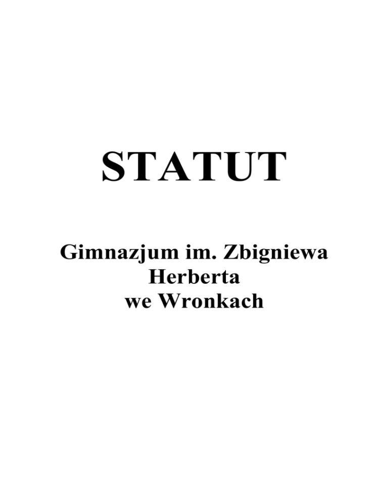 STATUT Gimnazjum im. Zbigniewa Herberta we Wronkach 2 ROZDZIAŁ I Informacje o szkole NAZWA SZKOŁY § 1. Nazwa szkoły zawiera określenie Typ szkoły: gimnazjum. Szkoła prowadzi również kształcenie w oddziałach specjalnych dla uczniów z upośledzeniem w stopniu lekkim. Wszystkie postanowienia Statutu odnoszą się również do w/w uczniów. Siedziba: Siedzibą gimnazjum jest budynek nr 5 położony we Wronkach na ulicy Polnej. § 2. Ustalona nazwa jest używana przez szkołę w brzmieniu, tj.: Gimnazjum im. Zbigniewa Herberta we Wronkach 1. Na pieczęci używana jest nazwa: Gimnazjum im. Zbigniewa Herberta 64-510 Wronki, ul. Polna 5, telefon 067 25-40-748, tel./fax. (067) 254 07 48 NIP 787-19-75-978 2. Szkoła używa pieczątki: 3. Świadectwa szkolne, zniżki kolejowe i inne dokumenty, stemplowane są pieczęciami: 4. Zasady stosowania i przechowywania pieczęci określają odrębne przepisy. 3 § 3. Gimnazjum nadaje imię organ prowadzący, na wspólny wniosek Rady Pedagogicznej oraz przedstawicieli rodziców i uczniów. Imię Gimnazjum powinno być związane z kierunkiem pracy wychowawczej tegoż gimnazjum. INNE INFORMACJE O GIMNAZJUM § 4. Organem prowadzącym gimnazjum jest Rada Miasta i Gminy Wronki. 1. Cykl kształcenia trwa 3 lata. 2. Zajęcia dydaktyczne odbywają się na 1 zmianę. 3. Czas rozpoczynania i kończenia zajęć dydaktycznych oraz przerw i ferii określa Minister Edukacji Narodowej w drodze rozporządzenia w sprawie organizacji roku szkolnego. 4 ROZDZIAŁ II CELE I ZADANIA GIMNAZJUM § 5. Gimnazjum realizuje cele i zadania określone w obowiązującej aktualnie ustawie o systemie oświaty oraz przepisach wykonawczych wydanych na jej podstawie. W procesie kształcenia i wychowywania szkoła kieruje się zasadami zawartymi w Konstytucji Rzeczpospolitej Polskiej, a także wskazaniami zawartymi w Powszechnej Deklaracji Praw Człowieka i w Konwencji o Prawach Dziecka: W szczególności szkoła realizuje następujące cele i zadania: 1. Umożliwia zdobycie wiedzy i umiejętności niezbędnych do uzyskania świadectwa ukończenia gimnazjum poprzez atrakcyjny i nowatorski proces nauczania i kontynuacji nauki na następnym etapie edukacyjnym. 2. Uznając za podstawę uniwersalne wartości etyczne, szkoła dąży do wszechstronnego rozwoju osobowości uczniów. 3. W swoich działaniach wychowawczych i dydaktycznych nauczyciele kierują się dobrem uczniów i pomagają im w rozpoznaniu wartości moralnych oraz tworzeniu odpowiedniej hierarchii wartości. 4. Szkoła podejmuje działania profilaktyczne, polegające na promocji zdrowia i przeciwdziałaniu zagrożeniom. 5. Kształtuje środowisko wychowawcze sprzyjające realizowaniu celów i zasad określonych w ustawie, stosownie do warunków gimnazjum i wieku ucznia poprzez: - zapewnienie odpowiedniej bazy dla uczniów gimnazjum, - systematyczne diagnozowanie i monitorowanie zachowań uczniów, - realizowanie programu wychowawczego gimnazjum, - realizowanie programu profilaktycznego szkoły, 6. Uznając prawo rodziców do religijnego wychowania dzieci, szkoła realizuje nauczanie religii na życzenie rodziców. 7. Gwarantuje uczniom poczucie tożsamości narodowej, etnicznej i językowej. 8. Sprawuje opiekę nad uczniami odpowiednio do ich potrzeb oraz możliwości szkoły poprzez: a) zorganizowanie zajęć świetlicowych, b) umożliwienie spożycia posiłków, c) prowadzenie zajęć wyrównawczych, d) prowadzenie zajęć z gimnastyki korekcyjnej, e) prowadzenie zajęć logopedycznych, f) organizację wewnątrzszkolnego systemu doradztwa oraz zajęć związanych z wyborem kierunku kształcenia, g) szkoła jest wyposażona w system monitoringu wizyjnego, który wpływa na poczucie bezpieczeństwa nauki, wychowania i opieki, a zapisy z kamer są wykorzystywane do rozwiązywania sytuacji wychowawczych. Zajęcia, o których mowa w punkcie c i e, prowadzone są na podstawie diagnozy dokonanej przez Poradnię Psychologiczno-Pedagogiczną i inne poradnie. 5 ROZDZIAŁ III ORGANY GIMNAZJUM § 6. 1. Organami gimnazjum są: 1) Dyrektor Gimnazjum, 2) Rada Pedagogiczna, 3) Rada Rodziców, 4) Samorząd Uczniowski. 2. Kompetencje poszczególnych organów funkcjonujących w gimnazjum: DYREKTOR GIMNAZJUM I. Dyrektor szkoły w szczególności: 1. Kieruje działalnością szkoły i reprezentuje ją na zewnątrz. 2. Sprawuje nadzór pedagogiczny. 3. Sprawuje opiekę nad uczniami oraz stwarza warunki harmonijnego rozwoju psychofizycznego poprzez aktywne działania prozdrowotne. 4. Przeprowadza kontrolę zarządczą. 5. Realizuje uchwały Rady Rodziców oraz Rady Pedagogicznej, podjęte w ramach ich kompetencji stanowiących. 6. Dysponuje środkami określonymi w planie finansowym szkoły zaopiniowanym przez radę szkoły i ponosi odpowiedzialność za ich prawidłowe wykorzystanie, a także może organizować administracyjną, finansową i gospodarczą obsługę szkoły. 7. Wykonuje inne zadania wynikające z przepisów szczególnych. 8. Współdziała ze szkołami wyższymi oraz zakładami kształcenia nauczycieli w organizacji praktyk pedagogicznych. 9. Odpowiada za właściwą organizację i przebieg egzaminów przeprowadzanych w szkole. Do obowiązków dyrektora szkoły należy ponadto : -opracowanie dokumentów programowo-organizacyjnych: 1. rocznego planu dydaktycznego, wychowawczego i opiekuńczego, 2. arkusza organizacyjnego szkoły, 3. tygodniowego rozkładu zajęć. Dyrektor odpowiada za: 1. poziom uzyskiwanych wyników nauczania i wychowania, 2. zgodność funkcjonowania szkoły z obowiązującym prawem i Statutem Szkoły, 3. bezpieczeństwo osób znajdujących się w obiekcie podczas zajęć organizowanych przez szkołę oraz za stan sanitarny i stan ochrony przeciwpożarowej obiektów szkolnych, 4. celowe wykorzystanie środków finansowych, 5. prowadzenie dokumentacji pracowniczej i uczniowskiej zgodnie z odrębnymi przepisami, 6. bezpieczeństwo pieczęci i druków ścisłego zarachowania. 6 Dyrektor szkoły jest zobowiązany