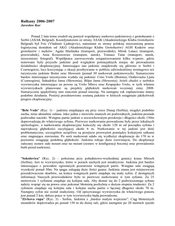 Bałkany 2006-2007 Jarosław Kur Ponad 2 lata temu zrodził się pomysł współpracy nurkowo-jaskiniowej z grotołazami z Serbii (ASAK Belgrad). Koordynatorem ze strony ASAK (Akademickiego Klubu Grotołazów Belgrad) był Fric (Vladimir Ljubojevic), natomiast ze strony polskiej nieocenioną pomoc logistyczną dostałem od AKG (Akademickiego Klubu Grotołazów) AGH Kraków oraz grotołazów i nurków: Agata Maślanka (transport, przewodnik), Mirek Latacz (transport, przewodnik), Ania Krzeszowiec (transport, nurek), Tomasz Tatar (transport, nurek, nieoceniony fotograf). Współpraca zaowocowała zorganizowaniem kilku wypraw, gdzie testowane były przyszłe jaskinie pod względem potencjalnych miejsc do prowadzenia działalności eksploracyjnej. Interesujące nas jaskinie znajdowały się głównie w Serbii i Czarnogórze, lecz korzystając z okazji przebywania w pobliŜu odwiedzaliśmy treningowo teŜ turystyczne jaskinie Bośni oraz Słowenii (ponad 30 nurkowań jaskiniowych). Sumarycznie bardzo interesujące turystycznie wydały się jaskinie: Crno Vrelo (Bośnia), Orahovacka Ljuta (Czarnogóra), Suhadolca Jama (Słowenia), Bilpa Jama (Słowenia). JeŜeli chodzi o serbskie wywierzyska interesujące na pewno są Vrelo Mlave oraz Krupajsko Vrelo, w tych właśnie wywierzyskach planowane są projekty głębokich nurkowań wczesnej zimy 2008. Sumarycznie spędziliśmy tam znacznie ponad miesiąc. Na następny rok zaplanowane mamy podobne działania. PoniŜej przedstawione zostaną jaskinie w których osiągnięto jakikolwiek progres eksploracyjny. "Bele Vode" (Ryc. 1) – jaskinia znajdująca się przy rzece Dunaj (Serbia), niegdyś podobno sucha, teraz aktualnie zalana. Jako jedna z niewielu znanych mi podwodnych, jaskinia posiada podwodne nacieki. Wstępne partie jaskini o soczewkowatym przekroju i długości około 150m doprowadzają do właściwego syfonu. Pierwsze nurkowania prowadzone były przez lokalnych speleologów, a nurkowania eksploracyjne kończyły się około 120 m od początku syfonu i największej głębokości oscylującej około 6 m. Nurkowanie w tej jaskini jest dość problematyczne, szczególnie uciąŜliwe są przejścia przewęŜeń pomiędzy kolejnymi salkami oraz stagnująca zawiesina. Po serii nurkowań udało się wydłuŜyć eksploracje do 170 m w poziomie osiągając podobną głębokość. Jaskinia rokuje duŜe rozwinięcie. Do eksploracji zalecany zestaw side mount oraz no mount (zestaw w konfiguracji bocznej oraz prowadzenie butli przed nurkiem). "Sokolovica" (Ryc. 2) – połoŜona przy południowo-wschodniej granicy krasu Miroch (Serbia). Jest to wywierzysko, które w porach suchych jest nieaktywne. Jaskinia jest bardzo interesująca z powodów ogromnych przestrzeni wstępnych partii. Wstępne sale osiągają wysokość ponad 30m. Na spągu zalegają duŜe ilości guana. Jaskinia znana jest miejscowym poszukiwaczom skarbów, na końcu wstępnych partii znajduje się mały syfon. Z dostępnych informacji Naszych przewodników było to pierwsze nurkowanie w tym syfonie. Za 25 metrowym 1 syfonem znajduje się kolejna sala. Aby dostać się do 2 podwieszonego syfonu naleŜy wspiąć się na prawo oraz pokonać błotnistą pochylnię o duŜym stopniu trudności. Za 2 syfonem znajduje się kolejna sala i kolejne suche partie o łącznej długości około 70 m. Następny syfon nie został znaleziony. Od opisywanego wywierzyska do właściwego ponoru jest ponad 2 km, dalsze prace w tym wywierzysku będą prowadzone. "Zivkova rupa" (Ryc. 3) - Serbia, Jaskinia z „bardzo małym wejściem”. Ciąg błotnistych meandrów doprowadza po ponad 150 m do duŜej sali, gdzie następnie po 20 metrach zjazdu osiągamy poziom syfonalny (3 syfony). Woda w syfonach o małej przejrzystości. Zaplanowane było tam nurkowanie TMX, niestety po osiągnięciu ponad 30m widoczność spadła do zera. Od sufitu zaczęły obrywać się odłamki kamieni i obserwowany był spływ błota po ścianach. Jaskinia ta to duŜy kolektor wodny zaczyna się trzema syfonami które mogą być ze sobą połączone. Podczas wynurzenia udało mi się przepłynąć około 15 m w poziomie bez kontaktu ze ścianą i rozpocząć penetrację innego komina. Bardzo wymagająca transportowo oraz nurkowo. „Jama” (Ryc. 4) - Jaskinia obecnie jeszcze nie posiada oficjalnej nazwy. Wywierzysko rzeki tworzące syfon znajdowało się w Wąwozie Mrtvica. W przewodnikach figuruje właśnie pod taką nazwą. Jaskinia z wymagającym transportem. Podczas jednego nurkowania została wyeksplorowana do 150 metrów od wyjścia. Maksymalnie osiągając 18m głębokości. Jaskinia dostępna jest tylko w porach wybitnie suchych, zazwyczaj wypływa z niej woda o ogromnych objętościach. Nurkowy ciąg syfonów to bocznie spłaszczona rura. Udało się pokonać pierwszy syfon około 130m długi. W około połowie drogi główny ciąg rozwidla się tworząc teŜ prawy. Wydaje się ze to prawa odnoga prowadzi największą część wody. Podczas jedynego tam nurkowania penetrowana była tylko lewa odnoga. Jaskinia bardzo atrakcyjna pomimo wymagającego kilkugodzinnego transportu. Woda charakteryzuje się duŜą przejrzystości. Ryc. 1 Uproszczony przekrój przez jaskinię Bele Vode. Ryc. 2 Schematyczny plan partii syfonalnych w jaskini Sokolovica. Ryc. 3 Przekrój uproszczony przez jaskinię Zivkova rupa. Ryc. 4 Uproszczony plan jaskini „Jama”.
