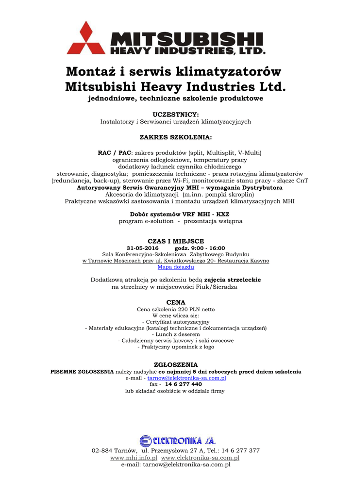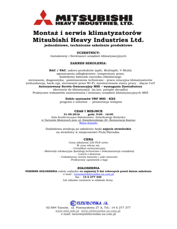 Montaż i serwis klimatyzatorów Mitsubishi Heavy Industries Ltd. jednodniowe, techniczne szkolenie produktowe UCZESTNICY: Instalatorzy i Serwisanci urządzeń klimatyzacyjnych ZAKRES SZKOLENIA: RAC / PAC: zakres produktów (split, Multisplit, V-Multi) ograniczenia odległościowe, temperatury pracy dodatkowy ładunek czynnika chłodniczego sterowanie, diagnostyka; pomieszczenia techniczne - praca rotacyjna klimatyzatorów (redundancja, back-up), sterowanie przez Wi-Fi, monitorowanie stanu pracy - złącze CnT Autoryzowany Serwis Gwarancyjny MHI – wymagania Dystrybutora Akcesoria do klimatyzacji (m.inn. pompki skroplin) Praktyczne wskazówki zastosowania i montażu urządzeń klimatyzacyjnych MHI Dobór systemów VRF MHI - KXZ program e-solution - prezentacja wstępna CZAS I MIEJSCE 31-05-2016 godz. 9:00 - 16:00 Sala Konferencyjno-Szkoleniowa Zabytkowego Budynku w Tarnowie Mościcach przy ul. Kwiatkowskiego 20- Restauracja Kasyno Mapa dojazdu Dodatkową atrakcją po szkoleniu będą zajęcia strzeleckie na strzelnicy w miejscowości Fiuk/Sieradza CENA Cena szkolenia 220 PLN netto W cenę wlicza się: - Certyfikat autoryzacyjny - Materiały edukacyjne (katalogi techniczne i dokumentacja urządzeń) - Lunch z deserem - Całodzienny serwis kawowy i soki owocowe - Praktyczny upominek z logo ZGŁOSZENIA PISEMNE ZGŁOSZENIA należy nadsyłać co najmniej 5 dni roboczych przed dniem szkolenia e-mail - [email protected] fax - 14 6 277 440 lub składać osobiście w oddziale firmy 02-884 Tarnów, ul. Przemysłowa 27 A, Tel.: 14 6 277 377 www.mhi.info.pl www.elektronika-sa.com.pl e-mail: [email protected]