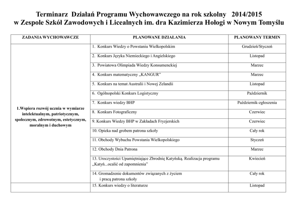 Terminarz Działań Programu Wychowawczego na rok szkolny 2014/2015 w Zespole Szkół Zawodowych i Licealnych im. dra Kazimierza Hołogi w Nowym Tomyślu ZADANIA WYCHOWAWCZE PLANOWANE DZIAŁANIA 1. Konkurs Wiedzy o Powstaniu Wielkopolskim Grudzień/Styczeń 2. Konkurs Języka Niemieckiego i Angielskiego Listopad 3. Powiatowa Olimpiada Wiedzy Konsumenckiej Marzec 4. Konkurs matematyczny „KANGUR” Marzec 5. Konkurs na temat Australii i Nowej Zelandii Listopad 6. Ogólnopolski Konkurs Logistyczny 1.Wspiera rozwój ucznia w wymiarze intelektualnym, patriotycznym, społecznym, zdrowotnym, estetycznym, moralnym i duchowym PLANOWANY TERMIN Październik 7. Konkurs wiedzy BHP Październik-zgłoszenia 8. Konkurs Fotograficzny Czerwiec 9. Konkurs Wiedzy BHP w Zakładach Fryzjerskich Czerwiec 10. Opieka nad grobem patrona szkoły Cały rok 11. Obchody Wybuchu Powstania Wielkopolskiego Styczeń 12. Obchody Dnia Patrona Marzec 13. Uroczystości Upamiętniające Zbrodnię Katyńską. Realizacja programu ,,Katyń...ocalić od zapomnienia” Kwiecień 14. Gromadzenie dokumentów związanych z życiem i pracą patrona szkoły 15. Konkurs wiedzy o literaturze Cały rok Listopad 16. Konkurs wiedzy „Patron” 17. Konkurs recytatorski z języka angielskiego 18. XV Olimpiada Teologii Katolickiej Styczeń/Luty Marzec Listopad/Grudzień 29. Działalność Szkolnego Chóru Cały rok 20. Szkolny konkurs ekonomiczny Listopad 21. Olimpiada Przedsiębiorczości Grudzień 22. Konkurs ,,Matematyka u Kopernika” 23. Konkurs ,,Szkolny mistrz czytelnictwa” 24. Konkurs ,,Czytanie łączy pokolenia '' w ramach realizacji projektu,, Biblioteka przyjazna uczniowi” 25. Wiosenny konkurs recytatorski Styczeń/Marzec Cały rok Październik/Styczeń Marzec 26. Konkurs OIP ,,Bezpieczne boisko” Listopad 27. Inicjatywy podjęte w roku szkolnym, nie ujęte w planie: Obchody 75 rocznicy powołania polskiego państwa podziemnego. 1. Spotkanie z przedstawicielem ZUS Cały rok Listopad 2. Spotkanie z przedstawicielami Urzędu Pracy Marzec 3. Spotkanie z pracownikami Banku BZ WBK Styczeń 4. Festiwal Przedsiębiorczości Listopad 5.Wycieczka edukacyjna do stacji diagnostycznej REDOS Listopad 6.Realizacja projektu,, Mechatronika łatwiejsza niż myślisz” 7. Zajęcia z pracownikami PPP w Nowym Tomyślu na temat „Sposobów Efektywnego Uczenia się” Październik 2.Organizuje proces nauczania umożliwiający efektywne zdobywanie wiedzy i umiejętności 8.Warsztaty w Muzeum Wikliniarstwa w Nowym Tomyślu Wrzesień 9.Laboratoria dla uczniów klasach I technikum Czerwiec 10.Laboratoria dla uczniów klas IV technikum mechatronicznego Wrzesień 11.Warztay dotyczące Powstania Wielkopolskiego Grudzień 12.Dni Logistyki- logistyka wojskowa 13.Warsztay na temat II Wojny Światowej 14.Konkurs tik-tak Październik Kwiecień/Maj Maj 15.Wyjazd na Targi Motoryzacyjne Kwiecień 16.Powiatowy Konkurs Wiedzy Motoryzacyjnej Kwiecień 17.Wyjazd do Poznania na Targi Poligrafii i Reklamy Maj 18.Wycieczka szkolna pt ,,Szlakiem zabytków Nowego Tomyśla” Czerwiec 19.Przeprowadzenie testów diagnostycznych w klasach pierwszych Wrzesień 20. Pielgrzymka do Częstochowy Kwiecień 21. „Mistrz Sudoku” II edycja szkolnego konkursu Październik 22. Międzynarodowy konkurs informatyczny „Bóbr” Listopad 23. Próbna matura z Operonem Listopad 24. Konkurs „Pokaż nam język” organizowany przez WSB w Poznaniu Marzec 25. Wdrażanie Wielkopolskiego Systemu Doradztwa Edukacyjno-Zawodowego w ramach projektu „Czas zawodowców” Cały rok 26. Praktyki zawodowe dla klas III technikum Maj 1.Wyjazd do Poznania na Salon Maturzystów 2.Udział w Targach Pracy zorganizowanych przez MCK, OHP, Urząd Pracy Październik 3.Wyjazd na Targi Fryzjersko-Kosmetyczne w Poznaniu Październik 4.,,Tydzień Przedsiębiorczości” 3.Zapewnia możliwości dokonania wyboru najlepszego kierunku kształcenia 5.”Lekcje Europejskie” przeprowadzone przez pracownika Punktu Informacyjnego Funduszy Europejskich 4.Przygotowuje uczniów do oceniania zewnątrzszkolnego Listopad Terminy ustalane są na bieżąco 6.Praktyki zawodowe dla uczniów technikum Marzec 7.Współpraca z poznańskimi uczelniami wyższymi: WSL, WSB, UA, PP Cały rok 8. Wycieczka do Uniwersytetu Artystycznego w Poznaniu Czerwiec 9. Współpraca z Katolickim Uniwersytetem Lubelskim Cały rok 1.Próbny egzamin potwierdzający kwalifikacje w zawodzie Luty 2.Próbny egzamin potwierdzający kwalifikacje w technikum Listopad 3. Próbne matury 5.Wspiera ucznia w przezwyciężaniu trudności szkolnych Wrzesień Listopad/ Styczeń 1. Fakultety z: języka polskiego, języków obcych, matematyki, biologii, historii, wos-u Cały rok 2. Zajęcia dydaktyczno-wyrównawcze z języków obcych, języka polskiego, matematyki Cały rok 3. Zajęcia z pedagogiem szkolnym Cały rok 4. Zajęcia z psychologiem W miarę potrzeb 1. Zawody sportowe według kalendarza ZPO 2. Szkolny Turniej Piłki Nożnej im. dra Kazimierza Hołogi 6. Promuje zdrowy styl życia Cały rok Październik/Maj 3. Tydzień Profilaktyki Zdrowotnej Kwiecień 4. Dzień Sportu Czerwiec 5. Mistrzostwa szkoły w siatkówce plażowej Maj 6. Mistrzostwa Powiatu w Lekkiej Atletyce Wrzesień 7. Sztafetowe biegi przełajowe Październik 8.Tenis stołowy- zawody drużynowe Październik 9. Piłka ręczna dziewcząt i chłopców Listopad 10.Unihokej dla dziewcząt i chłopców Listopad 11.Halowa piłka nożna chłopców Listopad 12.Koszykówka dziewcząt i chłopców Grudzień 13..Mistrzostwa powiatu w szachach Styczeń 14.Siatkówka dziewcząt i chłopców Luty 15.Wiosenne indywidualne biegi przełajowe Kwiecień 16.Siatkówka plażowa dziewcząt i chłopców Maj 17.”Bieg zwycięstwa” Maj 18. Zawody strzeleckie Maj/Czerwiec 19. Profilaktyka Raka Piersi,, Różowa wstążeczka’’ 20. Profilaktyka Raka Szyjki Macicy- „Wybierz życie – pierwszy krok” Październik Marzec 21. Realizacja programu profilaktycznego „ARS, czyli jak dbać o miłość” Cały rok 22