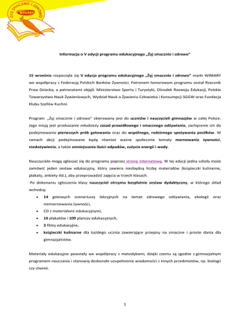 Informacja o V edycji programu edukacyjnego „Żyj smacznie i zdrowo” 15 września rozpoczęła się V edycja programu edukacyjnego „Żyj smacznie i zdrowo” marki WINIARY we współpracy z Federacją Polskich Banków Żywności. Patronem honorowym programu został Rzecznik Praw Dziecka, a patronatami objęli: Ministerstwo Sportu i Turystyki, Ośrodek Rozwoju Edukacji, Polskie Towarzystwo Nauk Żywieniowych, Wydział Nauk o Żywieniu Człowieka i Konsumpcji SGGW oraz Fundacja Klubu Szefów Kuchni. Program „Żyj smacznie i zdrowo” skierowany jest do uczniów i nauczycieli gimnazjów w całej Polsce. Jego misją jest przekazanie młodzieży zasad prawidłowego i smacznego odżywiania, zachęcenie ich do podejmowania pierwszych prób gotowania oraz do wspólnego, rodzinnego spożywania posiłków. W ramach akcji podejmowane będą również ważne społecznie tematy marnowania żywności, niedożywienia, a także zmniejszania ilości odpadów, zużycia energii i wody. Nauczyciele mogą zgłaszać się do programu poprzez stronę internetową. W tej edycji jedna szkoła może zamówić jeden zestaw edukacyjny, który zawiera niezbędną liczbę materiałów (książeczki kulinarne, plakaty, ankiety itd.), aby przeprowadzić zajęcia w trzech klasach. Po dokonaniu zgłoszenia klasy nauczyciel otrzyma bezpłatnie zestaw dydaktyczny, w którego skład wchodzą: 14 gotowych scenariuszy lekcyjnych na temat zdrowego odżywiania, ekologii oraz niemarnowania żywności, CD z materiałami edukacyjnymi, 16 plakatów i 109 planszy edukacyjnych, 3 filmy edukacyjne, książeczki kulinarne dla każdego ucznia zawierające przepisy na smaczne i proste dania dla gimnazjalistów. Materiały edukacyjne powstały we współpracy z metodykami, dzięki czemu są zgodne z gimnazjalnym programem nauczania i stanowią doskonałe uzupełnienie wiadomości z innych przedmiotów, np. biologii czy chemii. 1 Po przeprowadzeniu lekcji w oparciu o materiały edukacyjne dostarczone przez organizatora, nauczyciele wraz ze swoimi klasami mogą wziąć udział w konkursie w kategorii Wydarzenie Społeczne nawiązujące do celów programu. Nagrodą główną jest Klasa multimedialna – zestaw składający się z: tablicy multimedialnej, rzutnika, komputera, 30 tabletów oraz wycieczka do Warszawy dla zwycięskiej klasy połączona z warsztatami kulinarnymi. 29 kolejnych zwycięskich klas otrzyma dla swoich szkół nowoczesne tablice multimedialne, a kolejne 30 – laptopy. Szkoły, które wygrają Klasę multimedialną oraz tablice multimedialne, zostaną odwiedzone przez przedstawicieli programu „Żyj smacznie i zdrowo”, którzy wręczą uroczyście nagrody oraz przeprowadzą zajęcia dla uczniów. W IV edycji programu wzięło udział ponad 38% szkół gimnazjalnych w Polsce. Ponad 3 900 nauczycieli wyedukowało w dziedzinie zdrowego odżywiania ponad 126 000 uczniów z 4 500 klas. Mamy nadzieję, że nadchodząca edycja zakończy się jeszcze większym sukcesem! Wszelkie pytania prosimy kierować na adres [email protected] i pod numerem telefonu 22 544 05 16. 2