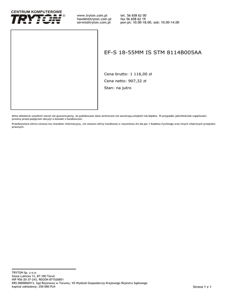www.tryton.com.pl [email protected] [email protected] tel. 56 658 62 00 fax 56 658 62 19 pon-pt: 10.00-18.00, sob: 10.00-14.00 EF-S 18-55MM IS STM 8114B005AA Cena brutto: 1 116,00 zł Cena netto: 907,32 zł Stan: na jutro Mimo dołożenia wszelkich starań nie gwarantujemy, że publikowane dane techniczne nie zawierają uchybień lub błędów. W przypadku jakichkolwiek wątpliwości prosimy przed podjęciem decyzji o kontakt z handlowcem. Przedstawiona oferta cenowa ma charakter informacyjny, nie stanowi oferty handlowej w rozumieniu Art.66 par.1 Kodeksu Cywilnego oraz innych właściwych przepisów prawnych. TRYTON Sp. z o.o. Szosa Lubicka 13, 87-100 Toruń NIP 956-20-37-243, REGON 871526851 KRS 0000006913, Sąd Rejonowy w Toruniu, VII Wydział Gospodarczy Krajowego Rejestru Sądowego kapitał zakładowy: 250 000 PLN Strona 1 z 1