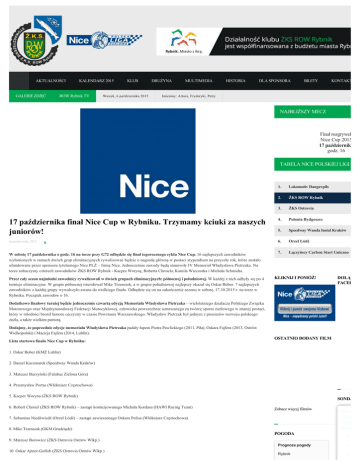 AKTUALNOŚCI GALERIE ZDJĘĆ KALENDARZ 2015 ROW Rybnik TV KLUB Wtorek, 6 października 2015 DRUŻYNA MULTIMEDIA HISTORIA DLA SPONSORA BILETY KONTAKT Imieniny: Artura, Fryderyki, Petry NAJBLIŻSZY MECZ Finał rozgrywek Nice Cup 2015 17 października godz. 16 TABELA NICE POLSKIEJ LIGI ŻUŻ 1. Lokomotiv Daugavpils 2. ŻKS ROW Rybnik 3. ŻKS Ostrovia 17 października finał Nice Cup w Rybniku. Trzymamy kciuki za naszych juniorów! 4. Polonia Bydgoszcz 5. Speedway Wanda Instal Kraków 6 października 2015 6. Orzeł Łódź 7. Łączyńscy Carbon Start Gniezno 0 W sobotę 17 października o godz. 16 na torze przy G72 odbędzie się finał tegorocznego cyklu Nice Cup. 16 najlepszych zawodników wyłonionych w ramach dwóch grup eliminacyjnych rywalizować będzie o nagrodę główną w postaci stypendium na przyszły rok, które zostało ufundowane przez sponsora tytularnego Nice PLŻ – firmę Nice. Jednocześnie zawody będą stanowiły IV Memoriał Władysława Pietrzaka. Na torze zobaczymy czterech zawodników ŻKS ROW Rybnik - Kacpra Worynę, Roberta Chmiela, Kamila Wieczorka i Michała Schmidta. Przez cały sezon najmłodsi zawodnicy rywalizowali w dwóch grupach eliminacyjnych: północnej i południowej. W każdej z nich odbyły się po 4 turnieje eliminacyjne. W grupie północnej triumfował Mike Trzensiok, a w grupie południowej najlepszy okazał się Oskar Bober. 7 najlepszych zawodników z każdej grupy wywalczyło awans do wielkiego finału. Odbędzie się on na zakończenie sezonu w sobotę, 17.10.2015 r. na torze w Rybniku. Początek zawodów o 16. KLIKNIJ I POMÓŻ! DOŁĄCZ D FACEBOOK Dodatkowo finałowy turniej będzie jednocześnie czwartą edycją Memoriału Władysława Pietrzaka – wieloletniego działacza Polskiego Związku Motorowego oraz Międzynarodowej Federacji Motocyklowej, człowieka powszechnie uznawanego za twórcę sportu żużlowego w znanej postaci, który w młodości bronił honoru ojczyzny w czasie Powstania Warszawskiego. Władysław Pietrzak był jednym z pionierów rozwoju polskiego żużla, a także wielkim patriotą. Dodajmy, że poprzednie edycje memoriału Władysława Pietrzaka padały łupem Piotra Pawlickiego (2011, Piła), Oskara Fajfera (2013, Ostrów Wielkopolski) i Macieja Fajfera (2014, Lublin). Lista startowa finału Nice Cup w Rybniku: OSTATNIO DODANY FILM 1. Oskar Bober (KMŻ Lublin) 2. Daniel Kaczmarek (Speedway Wanda Kraków) 3. Mateusz Burzyński (Falubaz Zielona Góra) 4. Przemysław Portas (Włókniarz Częstochowa) 5. Kacper Woryna (ŻKS ROW Rybnik) 6. Robert Chmiel (ŻKS ROW Rybnik) – zastąpi kontuzjowanego Michała Kordasa (HAWI Racing Team) SONDA Zobacz więcej filmów 7. Sebastian Niedźwiedź (Orzeł Łódź) – zastąpi zawieszonego Oskara Polisa (Włókniarz Częstochowa) 8. Mike Trzensiok (GKM Grudziądz) POGODA 9. Mateusz Borowicz (ŻKS Ostrovia Ostrów Wlkp.) 10. Oskar Ajtner-Gollob (ŻKS Ostrovia Ostrów Wlkp.) Który z za ROW Ryb Twoje oc sezonie 2 Troy Ba Prognoza pogody Damian Rybnik Sebasti 11. Marcin Nowak (GKM Grudziądz) Dakota 12. Norbert Krakowiak (ŻKS Ostrovia Ostrów Wlkp.) Chris H Max Fri 13. Bartosz Hassa (Stal Gorzów Wlkp.) Rafał S 14. Mateusz Rujner (GKM Grudziądz) Kacper 15. Dzika karta przyznana przez organizatorów Pogoda - Rybnik Kamil W 16. Dzika karta przyznana przez organizatorów Na podstawie www.polskizuzel.pl Dodaj komentarz Podaj Nick/Imię Treść komentarza Dodaj PARTNER STRATEGICZNY SPONSORZY GŁÓWNI SPONSORZY WSPIERAJĄCY Robert Menu główne: AKTUALNOŚCI KALENDARZ 2015 KLUB Agencja Interaktywna Lorem Strony WWW Katowice Realizacja DRUŻYNA MULTIMEDIA HISTORIA DLA SPONSORA BILETY KONTAKT