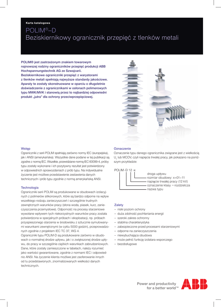 Karta katalogowa POLIM®–D Beziskiernikowy ogranicznik przepięć z tlenków metali POLIM® jest zastrzeżonym znakiem towarowym najnowszej rodziny ograniczników przepięć produkcji ABB Hochspannungstechnik AG ze Szwajcarii. Beziskiernikowe ograniczniki przepięć z warystorami z tlenków metali spełniają najwyższe standardy jakościowe. Aparaty te zostały skonstruowane w oparciu o długoletnie doświadczenie z ogranicznikami w osłonach polimerowych typu MWK/MVK i stanowią przez to najbardziej odpowiedni produkt „jutra” dla ochrony przeciwprzepięciowej. Wstęp Ograniczniki z serii POLIM spełniają zarówno normy IEC (europejska), jak i ANSI (amerykańska). Wszystkie dane podane w tej publikacji są zgodne z normą IEC. Wszelkie, przewidziane normą IEC 60099-4, próby typu zostały wykonane i ich pozytywny rezultat jest potwierdzony w odpowiednich sprawozdaniach z prób typu. Na indywidualne życzenie jest możliwe przedstawienie zestawienia danych technicznych i prób typu zgodnie z normą amerykańską ANSI. Technologia Ograniczniki serii POLIM są produkowane w obudowach izolacyjnych z polimerów silikonowych, które są bardzo odporne na wpływ wszelkiego rodzaju zanieczyszczeń i szczególnie trudnych zewnętrznych warunków pracy (słona woda, piasek, kurz, zanieczyszczenia przemysłowe). Odporność na procesy starzeniowe wywołane wpływem tych niekorzystnych warunków pracy została potwierdzona w specjalnych próbach i eksploatacji, np. próbach przyspieszonego starzenia w środowisku z sztucznie symulowanymi warunkami zewnętrznymi (w cyklu 5000 godzin), przeprowadzonych zgodnie z projektem IEC TC 37, WG 4. Ograniczniki typu POLIM-D są produkowane zarówno w obudowach o normalnej drodze upływu, jak i o zwiększonej drodze upływu, do pracy w szczególnie ciężkich warunkach zabrudzeniowych. Dane, które zostały zamieszczone w tabelach, należy rozumieć jako wartości gwarantowane, zgodnie z normami IEC i odpowiednio ANSI. Na życzenie klienta możliwe jest zaoferowanie innych od tu przedstawionych, znormalizowanych wielkości danych technicznych. Oznaczenie Oznaczenie typu danego ogranicznika związane jest z wielkością Uc lub MCOV, czyli napięcia trwałej pracy, jak pokazano na poniższym przykładzie: d ro g a u p y w u rozmiar obudowy: x=01÷11 napi cie trwa ej pracy (12 kV) oznaczenie kl asy rozdzi el cza n a z wa t y p u Zalety – niski poziom ochrony – duża zdolność pochłaniania energii – szeroki zakres ochronny – stabilna charakterystyka – zabezpieczone przed procesami starzeniowymi – odporne na zanieczyszczenia – niewybuchająca obudowa – może pełnić funkcję izolatara wsporczego – bezobsługowe POLIM®–D Beziskiernikowy ogranicznik przepięć z tlenków metali Główne dane techniczne Dla napięć sieci do ....................................................................... 36 kV Napięcia trwałej pracy do ............................................................. 36 kV Znamionowy prąd wyładowczy (wartość szczytowa) 8/20 μs ...................................................... 10 kA Graniczny prąd wyładowczy (wartość szczytowa) 4/10 μs ....................................................100 kA Wytrzymałość na udar prądowy długotrwały (wartość szczytowa) . ................................................. 250 A, 2000 μs Częstotliwość . ........................................................................ do 62 Hz Klasa rozładowania linii zgodnie z PN-EN 60099-4 ..........................1 Typ zgodnie z IEEE (ANSI) C 62.11............................ Rozdzielczy, dużej trwałości Zdolność pochłaniania energii w próbie działania przy granicznym prądzie wyładowczym ...................................................... 3,6 kJ/kV Uc Wytrzymałość zwarciowa .................................................. 20 kA/0,2 s Obciążenia mechaniczne moment zginający MPSL ......................................................... 200 Nm moment skręcający .................................................................... 50 Nm siła zrywająca . ............................................................................. 625 N Zastosowanie Ochrona sieci SN zarówno przed przepięciami atmosferycznymi, jak i łączeniowymi. Właściwe do ochrony transformatorów rozdzielczych i kabli SN. Do stosowania napowietrznego i wnętrzowego. Budowa Warystory (z tlenków metali) mają bardzo nieliniową charakterystykę napięciowo-prądową. Przy roboczym napięciu płynie w przeważającej mierze pojemnościowy prąd o wartości poniżej jednego miliampera. Każdy wzrost napięcia prowadzi do natychmiastowego i silnego wzrostu prądu w warystorze, przez co zostaje natychmiast ograniczony dalszy wzrost napięcia na ograniczniku. Gdy przepięcie zanika ogranicznik wraca bezzwłocznie do jego zasadniczo nieprzewodzącego stanu. Obudowa Zewnętrzna powłoka ograniczników typu POLIM-D wykonana jest z polimerów silikonowych, które są połączone bezpośrednio z aktywnymi elementami, tak jak w przypadku dobrze sprawdzonych ograniczników typu MVK/MWK. To rozwiązanie stanowi zabezpieczenie przed niekorzystnym wpływem wszelkich warunków zewnętrznych. Plastyczna obudowa nie może pęknąć przy przeciążeniu. Stopa łuku utrzymuje się na izolacyjnej obudowie i doświadczalnie stwierdzono, że eksplozja dla tych konstrukcji jest niemożliwa. Definicje – Napięcie trwałej pracy ogranicznika (MCOV) Uc Jest to najwyższe, wyrażone jako wartość skuteczna, napięcie o częstotliwości sieciowej, które może występować trwale między zaciskami ogranicznika. Dopuszczalny poziom T przepięć przemija2 POLIM-D – Beziskiernikowy ogranicznik przepięć z tlenków metali jących (przepięć dorywczych krzywa TOV). Współczynnik wytrzymałości na przepięcia przemijające „T” jest określony jako chwilowy wzrost napięcia o częstotliwości sieciowej, które ogranicznik może wytrzymać prz