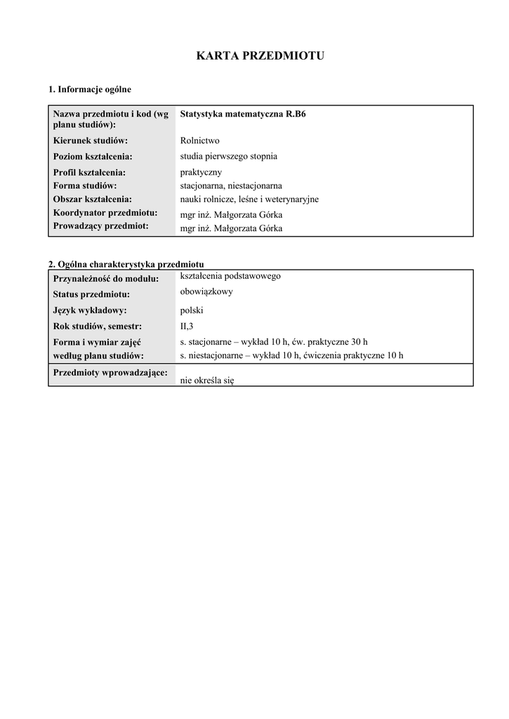 KARTA PRZEDMIOTU 1. Informacje ogólne Nazwa przedmiotu i kod (wg planu studiów): Statystyka matematyczna R.B6 Kierunek studiów: Rolnictwo Poziom kształcenia: studia pierwszego stopnia Profil kształcenia: Forma studiów: Obszar kształcenia: Koordynator przedmiotu: Prowadzący przedmiot: praktyczny stacjonarna, niestacjonarna nauki rolnicze, leśne i weterynaryjne mgr inż. Małgorzata Górka mgr inż. Małgorzata Górka 2. Ogólna charakterystyka przedmiotu kształcenia podstawowego Przynależność do modułu: Status przedmiotu: obowiązkowy Język wykładowy: polski Rok studiów, semestr: II,3 Forma i wymiar zajęć według planu studiów: s. stacjonarne – wykład 10 h, ćw. praktyczne 30 h s. niestacjonarne – wykład 10 h, ćwiczenia praktyczne 10 h Przedmioty wprowadzające: nie określa się B. Poszczególne typy zadań do samokształcenia studenta (niewymagających bezpośredniego udziału nauczyciela) wraz z planowaną średnią liczbą godzin na każde i sumaryczną liczbą ECTS: C. Liczba godzin praktycznych/laboratoryjnych w ramach przedmiotu oraz związana z tym liczba punktów ECTS: niestacjonarne A. Liczba godzin wymagających bezpośredniego udziału nauczyciela z podziałem na typy zajęć oraz całkowita liczba punktów ECTS osiąganych na tych zajęciach: 3 stacjonarne 3. Bilans punktów ECTS Całkowita liczba punktów ECTS: Wykład Ćwiczenia praktyczne Konsultacje 10 30 5 10 10 5 W sumie: ECTS Przygotowanie do ćwiczeń praktycznych Przygotowanie do kolokwium 45 1,5 30 15 25 0,8 35 30 W sumie: ECTS 45 1,5 65 2,2 ćwiczenia praktyczne przygotowanie do ćwiczeń praktycznych 30 15 10 35 W sumie: ECTS 45 1,5 45 1,5 4. Opis przedmiotu Cel przedmiotu: Celem przedmiotu jest zapoznanie studentów z podstawowymi pojęciami, metodami i kryteriami statystyki matematycznej, metodologią wnioskowania statystycznego oraz zdobycie umiejętności stosowania metod statystyki matematycznej do opisu zagadnień rolniczych. Metody dydaktyczne: wykład, ćwiczenia praktyczne, rozwiązywanie zadań, dyskusja Treści kształcenia: Wykłady: 1.Statystyka matematyczna - podstawowe pojęcia (populacja, próba losowa, szeregi statystyczne). 2. Metody statystyki opisowej. 3. Teoria estymacji. Estymacja punktowa i przedziałowa parametrów populacji generalnej. 4. Wprowadzenie do wnioskowania statystycznego. Weryfikacja hipotez statystycznych.. – hipoteza zerowa, alternatywna. Testy parametryczne i nieparametryczne. 5. Wykorzystanie metod statystyki matematycznej w doświadczalnictwie rolniczym. Ćwiczenia praktyczne: 1.Analiza rachunku prawdopodobieństwa – podstawowe rozkłady prawdopodobieństwa. Zmienna losowa ciągła, dystrybuanta. 2. Obliczanie miar tendencji centralnej – średnia arytmetyczna, mediana, modalna. 3. Obliczanie miar zmienności - wariancja, odchylenie standardowe, współczynnik zmienności. 4. Szacowanie parametrów populacji generalnej. 5. Analiza wariancji. Korelacja i regresja. 6. Formułowanie i weryfikacja hipotez statystycznych. Test hipotetycznej średniej populacji generalnej. Test istotności współczynnika korelacji 5. Efekty kształcenia i sposoby weryfikacji Efekty kształcenia: Efekt przedmiotu R.B6_K_W01 R.B6_K_W02 R.B6_K_W03 R.B6_K_U01 R.B6_K_U02 R.B6_K_U03 R.B6_K_K01 R.B6_K_K02 Student, który zaliczył przedmiot Efekt kierunkowy Wiedza: 1.Definiuje podstawowe pojęcia i metody statystyki matematycznej. 2.Zna elementy statystyki opisowej oraz teorii estymacji. 3.Wyjaśnia wnioskowanie statystyczne i wskazuje testy parametryczne i nieparametryczne dostosowane do rolnictwa. Umiejętności 1. Oblicza, analizuje i interpretuje podstawowe dane i modele statystyczne. 2. Szacuje miary tendencji centralnej oraz miary zmienności. 3.Formułuje i weryfikuje hipotezy statystyczne. Kompetencje społeczne 1.Potrafi dokonać analizy problemu, dokonać wyboru właściwych narzędzi i przedstawić uzyskane wyniki. 2. Potrafi uczestniczyć w przygotowaniach projektów gospodarczych uwzględniających aspekty ekonomiczne stosując narzędzi i metody statystyczne. Sposoby weryfikacji efektów kształcenia: Lp. Efekt Sposób weryfikacji przedmiotu 1 R.B6_K_W01 kolokwium zaliczeniowe 2 R.B6_K_W02 kolokwium zaliczeniowe 3 R.B6_K_W03 kolokwium zaliczeniowe 4 R.B6_K_U01 kolokwium z ćwiczeń praktycznych 5 R.B6_K_U02 kolokwium z ćwiczeń praktycznych 6 R.B6_K_U03 kolokwium z ćwiczeń praktycznych 7 R.B6_K_K01 ocena prezentacji ustnej 8 R.B6_K_K02 obserwacja Ocena formująca K_W02 K_W05 InzP_W03 InzP_W05 K_U03 K_U04 InzP_U01 InzP_U02 K_K02 K_K05 Ocena końcowa cząstkowa ocena końcowa – sprawdzian wiedzy cząstkowa ocena końcowa – sprawdzian wiedzy cząstkowa ocena końcowa – sprawdzian wiedzy sprawdzian umiejętności: wykonanie zadania obliczeniowego sprawdzian umiejętności: wykonanie zadania obliczeniowego sprawdzian umiejętności: wykonanie zadania obliczeniowego umiejętność wypowiedzi ustnej ocena zaangażowania w pracę grupy kolokwium końcowe ocena umiejętności/rozwiązanie zadania problemowego ocena zaangażowania w dyskusji ocena zaangażowania w pracę grupy Kryteria oceny w zakresie wiedzy Na ocenę 3,0 Na ocenę 5,0 Na ocenę 3,0 Na ocenę 5,0 Student uzyskał od 50 % do 65 % punktów z kolokwium Student uzyskał powyżej 95% punktów z kolokwium Student uzyskał od 50 % do 65 % punktów z kolokwium Student uzyskał powyżej 95% punktów z kolokwium Efekt kształcenia końcowego R.B6_K_W01 końcowego końcowego R.B6_K_W02 końcowego Na ocenę 3,0 Student uzyskał od 50 % do 65 % punktów z końcowego kolokwium R.B6_K_W03 Student uzyskał powyżej 95% punktów z końcowego kolokwium w zakresie umiejętności Na ocenę 5,0 Na ocenę 3,0 Na ocenę 5,0 Oblicza podstawowe dane i modele statystyczne Interpretuje i graficznie przedstawia podstawowe dane i R.B6_K_U01 modele statystyczne Oblicza podstawowe miary tendencji centralnej oraz miary zmienności R.B6_K_U02 Oblicza, graficznie przedstawia i interpretuje miary tendencji centralnej oraz mi