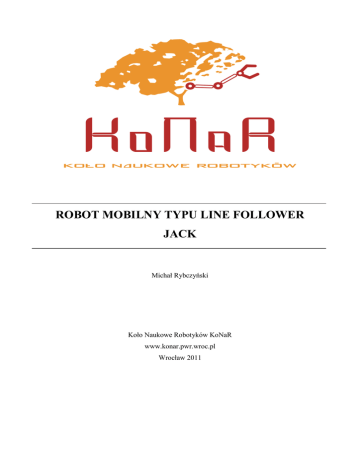 ROBOT MOBILNY TYPU LINE FOLLOWER JACK Michał Rybczyński Koło Naukowe Robotyków KoNaR www.konar.pwr.wroc.pl Wrocław 2011 Spis treści 1. Wstęp...................................................................................................................................... 3 2. Konstrukcja mechaniczna ...................................................................................................... 4 3. Zasilanie ................................................................................................................................. 5 4. Napęd ..................................................................................................................................... 6 5. Elektronika ............................................................................................................................. 7 6. Program .................................................................................................................................. 9 7. Testy i modyfikacje.............................................................................................................. 10 8. Wnioski ................................................................................................................................ 11 9. Podsumowanie ..................................................................................................................... 12 2 1. Wstęp Niniejsza publikacja ma na celu przedstawienie konstrukcji robota typu Line Follower Jack (fot. 1) stworzonego w ramach rekrutacji do Koła Naukowego Robotyków KoNaR. Zostaną zaprezentowane główne założenia, schematy ideowe, zastosowane rozwiązania oraz problemy napotkane w trakcie budowy. W przypadku jakichkolwiek pytań, komentarzy, wątpliwości – proszę kierować je na adres mailowy [email protected]. Robot wziął udział w zawodach Robomaticon 2011 w Warszawie zajmując 10. miejsce spośród 31 startujących. Fotografia 1: Robot Jack 3 2. Konstrukcja mechaniczna Podczas projektowania przyjęte zostały następujące założenia: • możliwie niewielka masa, • możliwie niskie położenie środka masy, • zgodność z regulaminem zawodów. Konstrukcję oparto na dwóch płytach laminatu – płycie głównej oraz płycie z czujnikami, połączonych ze sobą śrubami M3. Wymiary robota to 170x200 mm. W celu obniżenia środka ciężkości wykonano kieszeń na akumulator, będący najcięższym pojedynczym elementem, umiejscowioną kilka milimetrów przed osią kół w kierunku czujników pod płytą główną. Kieszeń zrealizowano przy użyciu płyty laminatu dociętej na wymiar akumulatora, połączonej z płytą główną słupkami dystansowymi o długości 10 mm (fot 2.) Fotografia 2: Kieszeń z zamontowanym akumulatorem Tak utworzona kieszeń umożliwia sztywne zamontowanie akumulatora pod płytą główną. 4 3. Zasilanie Robot zasilany jest akumulatorem litowo – polimerowym KOKAM o napięciu znamionowym 7,4V, pojemności 620mAh i prądzie rozładowania 15C. Jest on idealny do wymagań i potrzeb robota tej klasy – jego mała waga i wymiary umożliwiają korzystne zamontowanie na płycie głównej, a pojemność jest wystarczająca do przeprowadzenia serii testów, choć mniejsze pojemności również będą odpowiednie. Maksymalna wartość napięcia wynosi 8,4V i jest optymalna dla zastosowanych silników, które są zasilane bezpośrednio z akumulatora (uwzględniając spadek napięcia na użytym mostku H). Bateria posiada wtyczkę BEC, uniemożliwiającą odwrotne podłączenie do układu. W robocie zastosowano układ stabilizatora napięcia L4940-V5 LDO w typowej aplikacji (rys. 1). Służy on do zasilania układów scalonych, wymagających napięcia zasilającego 5V, a także płyty z czujnikami. Rysunek 1: Układ stabilizatora 5 4. Napęd Układ napędowy z założenia tworzą dwa silniki Pololu HP z przekładnią 30:1 i obrotami biegu jałowego przy napięciu 6V 1000 obr/min, połączone z kołami Pololu 60x8 mm. Jako trzeci punkt podparcia użyto plastikową kulkę podporową Pololu Ball Caster o średnicy 3/8”, zamontowaną w miejscu łączenia płyty głównej i płyty z czujnikami (fot.3). Silniki pozwalają na uzyskanie bardzo dużych prędkości (ponad 1m/s), są bardzo popularne w najszybszych konstrukcjach w Polsce i Europie. Fotografia 3: Widok od spodu 6 5. Elektronika Robot sterowany jest mikrokontrolerem AVR ATmega88 firmy Atmel, taktowanym wewnętrznym generatorem o częstotliwości 8MHz. Schemat ideowy (rys. 2 i rys. 3) oraz projekt płyt PCB wykonano przy użyciu programu EAGLE. Rysunek 2: Schemat ideowy płyty głównej (bez mostka H) Rysunek 3: Schemat ideowy płyty z czujnikami 7 Obie płyty połączone są taśmą ze złączami typu goldpin. Wyjścia z czujników podpięte są bezpośrednio pod port obsługujący przetwornik analogowo – cyfrowy. Ostatnia linia przetwornika ADC wykorzystywana jest do pomiaru napięcia na akumulatorze. Dzielnik napięciowy zbudowany z dwóch rezystorów 47k powoduje, że maksymalne napięcie podawane na pin mikrokontrolera nie przekracza wartości dozwolonej 5V. Przetwornik jako napięcie referencyjne wykorzystuje AVCC filtrowane zgodnie z notą katalogową (filtr LC dla AVCC oraz pin AREF połączony przez kondensator 100n do masy). Na płycie głównej znajdują się dwie diody elektroluminescencyjne umożliwiające sygnalizowanie poprawnego działania układu, a także niski poziom baterii. Ponadto występują dwa przyciski, służące do włączania i wyłączania programu głównego. Płyta z czujnikami posiada 5 czujników koloru CNY70 ułożonych w linii a także rezystory ograniczające prąd diody podczerwonej oraz rezystory podciągające kolektor fototranzystora do VCC o wartości 47kΩ, dobranej na podstawie publikacji Roberta Budzińskiego o robocie Bizonek. Odległość między czujnikami wynosi 15 mm, co przy standardowej szerokości linii (19 mm) umożliwia dokładniejsze ustalenie położ