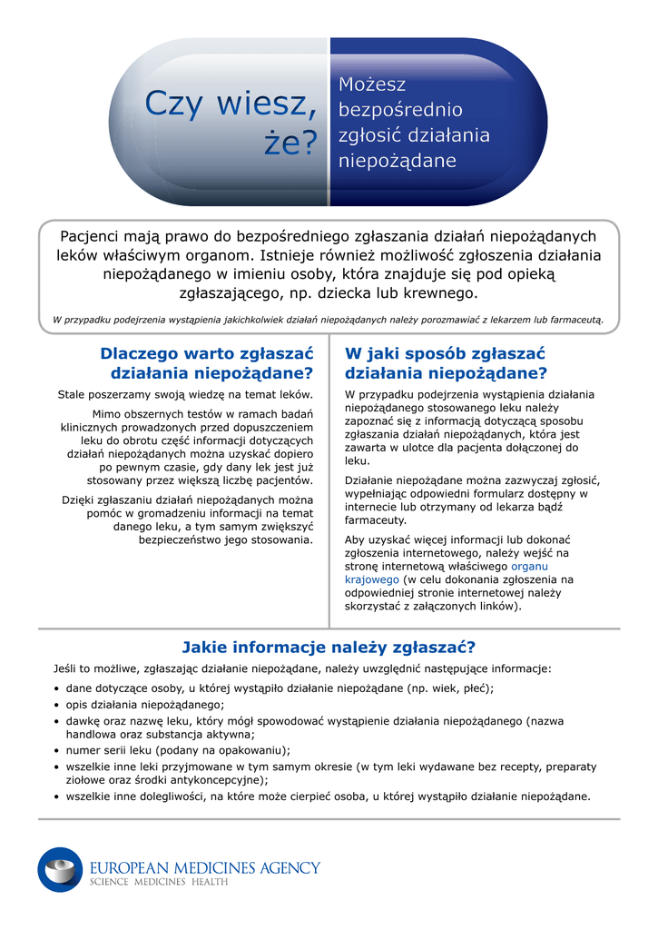 Czy wiesz, że? Możesz bezpośrednio zgłosić działania niepożądane Pacjenci mają prawo do bezpośredniego zgłaszania działań niepożądanych leków właściwym organom. Istnieje również możliwość zgłoszenia działania niepożądanego w imieniu osoby, która znajduje się pod opieką zgłaszającego, np. dziecka lub krewnego. W przypadku podejrzenia wystąpienia jakichkolwiek działań niepożądanych należy porozmawiać z lekarzem lub farmaceutą. Dlaczego warto zgłaszać działania niepożądane? Stale poszerzamy swoją wiedzę na temat leków. Mimo obszernych testów w ramach badań klinicznych prowadzonych przed dopuszczeniem leku do obrotu część informacji dotyczących działań niepożądanych można uzyskać dopiero po pewnym czasie, gdy dany lek jest już stosowany przez większą liczbę pacjentów. Dzięki zgłaszaniu działań niepożądanych można pomóc w gromadzeniu informacji na temat danego leku, a tym samym zwiększyć bezpieczeństwo jego stosowania. W jaki sposób zgłaszać działania niepożądane? W przypadku podejrzenia wystąpienia działania niepożądanego stosowanego leku należy zapoznać się z informacją dotyczącą sposobu zgłaszania działań niepożądanych, która jest zawarta w ulotce dla pacjenta dołączonej do leku. Działanie niepożądane można zazwyczaj zgłosić, wypełniając odpowiedni formularz dostępny w internecie lub otrzymany od lekarza bądź farmaceuty. Aby uzyskać więcej informacji lub dokonać zgłoszenia internetowego, należy wejść na stronę internetową właściwego organu krajowego (w celu dokonania zgłoszenia na odpowiedniej stronie internetowej należy skorzystać z załączonych linków). Jakie informacje należy zgłaszać? Jeśli to możliwe, zgłaszając działanie niepożądane, należy uwzględnić następujące informacje: • dane dotyczące osoby, u której wystąpiło działanie niepożądane (np. wiek, płeć); • opis działania niepożądanego; • dawkę oraz nazwę leku, który mógł spowodować wystąpienie działania niepożądanego (nazwa handlowa oraz substancja aktywna; • numer serii leku (podany na opakowaniu); • wszelkie inne leki przyjmowane w tym samym okresie (w tym leki wydawane bez recepty, preparaty ziołowe oraz środki antykoncepcyjne); • wszelkie inne dolegliwości, na które może cierpieć osoba, u której wystąpiło działanie niepożądane. Najczęściej zadawane pytania Jak rozpoznać działanie niepożądane? Działanie niepożądane (nazywane również reakcją niepożądaną) to niekorzystny objaw lub efekt wywołany przyjmowaniem leku. Nie zawsze można mieć pewność, że występujące działanie niepożądane zostało wywołane przyjmowaniem danego leku, jednak dzięki zgłaszaniu takich działań odpowiednie organy mogą prowadzić badania, które zwiększą bezpieczeństwo stosowania leków. Co się dzieje z przesłanym zgłoszeniem? Przesłane zgłoszenia dotyczące leku zostaną sprawdzone pod kątem nowych informacji (znanych jako „sygnały dotyczące bezpieczeństwa”) przez specjalistów do spraw bezpieczeństwa lekow. Po dokonaniu oceny sygnału dotyczące bezpieczeństwa, jak również innych istotnych danych, organy nadzorujące leki mogą wydać nowe ostrzeżenia lub zalecenia dotyczące stosowania danego leku, a nawet wycofać go z obrotu. Czy można uzyskać pomoc w zgłaszaniu działań niepożądanych? Tak. W wypełnieniu zgłoszenia może pomóc lekarz lub farmaceuta. Mogą oni również wysłać wypełnione zgłoszenie w imieniu zgłaszającego. Pomocy udzielają także krajowe organizacje pacjentów. Na ulotce dla pacjenta znajduje się symbol w postaci czarnego trójkąta. Co to oznacza? Odwrócony czarny trójkąt „▼” służy jako przypomnienie, aby zgłaszać wszelkie podejrzewane działania niepożądane, gdyż lek jest nowy lub istnieje szczególna potrzeba dokładniejszej oceny bezpieczeństwa długotrwałego stosowania leku. Symbol ten nie oznacza, że lek jest niebezpieczny. Czy moje dane osobowe są chronione? Przetwarzanie wszelkich danych osobowych związanych ze zgłoszonym działaniem niepożądanym odbywa się zgodnie z prawodawstwem UE w zakresie ochrony danych. Zgłoszenia działań niepożądanych są wykorzystywane wyłącznie do naukowej oceny leku. Gdzie można znaleźć informacje dotyczące zgłoszonych działań niepożądanych leku? Informacje te znajdują się w ulotce dla pacjenta dołączonej do leku. W celu uzyskania dodatkowych informacji można również zajrzeć do europejskiej bazy danych (www.adrreports.eu) lub skontaktować się z krajowym urzędem ds. leków. W przypadku podejrzenia wystąpienia jakichkolwiek działań niepożądanych przyjmowanego leku należy porozmawiać z lekarzem lub farmaceutą. Należy dokonać tego niezwłocznie w razie wystąpienia działania niepożądanego, które pacjent uzna za ciężkie lub które zostało określone jako ciężkie w ulotce dla pacjenta dołączonej do leku.