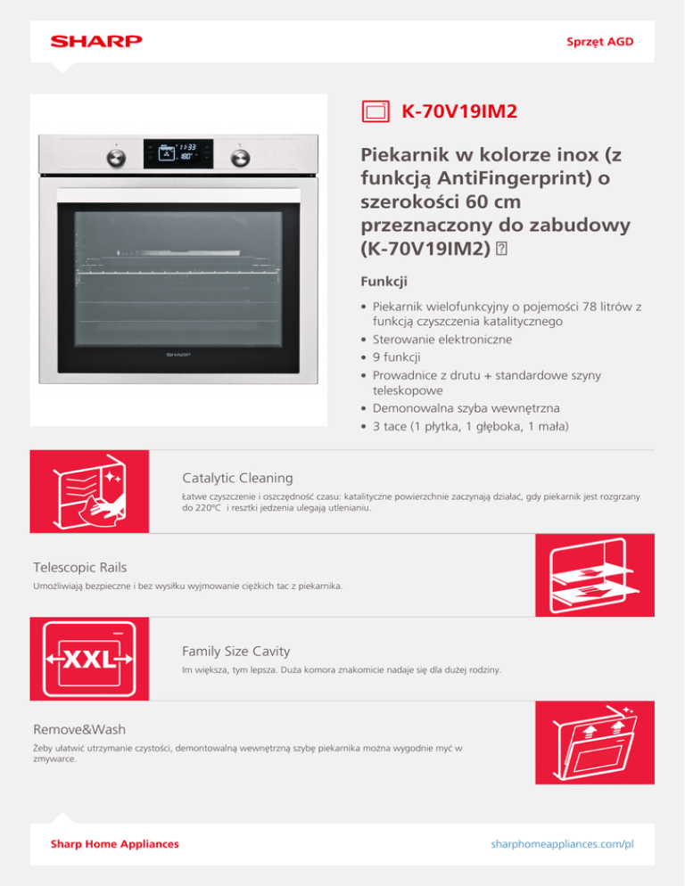 Sprzęt AGD K-70V19IM2 Piekarnik w kolorze inox (z funkcją AntiFingerprint) o szerokości 60 cm przeznaczony do zabudowy (K-70V19IM2) Funkcji Piekarnik wielofunkcyjny o pojemości 78 litrów z funkcją czyszczenia katalitycznego Sterowanie elektroniczne 9 funkcji Prowadnice z drutu + standardowe szyny teleskopowe Demonowalna szyba wewnętrzna 3 tace (1 płytka, 1 głęboka, 1 mała) Catalytic Cleaning Łatwe czyszczenie i oszczędność czasu: katalityczne powierzchnie zaczynają działać, gdy piekarnik jest rozgrzany do 220ºC i resztki jedzenia ulegają utlenianiu. Telescopic Rails Umożliwiają bezpieczne i bez wysiłku wyjmowanie ciężkich tac z piekarnika. Family Size Cavity Im większa, tym lepsza. Duża komora znakomicie nadaje się dla dużej rodziny. Remove&Wash Żeby ułatwić utrzymanie czystości, demontowalną wewnętrzną szybę piekarnika można wygodnie myć w zmywarce. Sharp Home Appliances sharphomeappliances.com/pl Sprzęt AGD Kluczowe cechy Sposób czyszczenia Katalityczny Sposób grzania Wielofunkcyjny Typ konstrukcji Typ pokrywy (liczba szklanych pokryw) Całkowicie szklana pokrywa (3) Do zabudowy Demontowalna wewnętrzna szyba pokrywy Tak Kolor Inox (AntiFingerprint) Typ prowadnic Prowadnice z drutu Szerokość (cm) 60cm Liczba poziomów ułożenia blach 5 Klasa efektywności energetycznej A Uchwyt Inox Typ sterowania Elektroniczny Materiał, z którego wykonane jest wnętrze kuchenki Szara emalia + katalityczny panel tylny Kolorowy wyświetlacz LCD Nie Gwarancja (w latach) Dwa lata na części i robociznę Pokrywa piekarnika Pokrywa odchylana do dołu Functions Liczba funkcji 9 System VapClean Nie PowerBoost Nie Tryby pracy Oświetlenie, rozmrażanie, grzanie od góry i od dołu, grzanie od góry + od dołu + termoobieg, grzanie od dołu+termoobieg, grill, podwójny grill, podwójny grill+termoobieg, termoobieg + termoobieg obwodowy Programy automatyczne (liczba) – Zakres regulacji temperatury (°C) 50-270 Sharp Home Appliances sharphomeappliances.com/pl Sprzęt AGD Mocy, zużycia i napięcia Moc (W) 3100 Górny element grzejny (W) 1200 Dolny element grzejny (W) Zużycie energii - tryb statyczny (kWh/cykl) 0.99 1100 Zużycie energii - obieg wymuszony (kWh/cykl) 0.93 Grill (W) 1400 Napięcie (V) / częstotliwość (Hz) 220-240V / 50Hz Podwójny grill (W) 1400-2600 Bezpiecznik źródła zasilania/wyłącznik obwodu (A) 13.5 Wentylator (W) 23 Wentylator z pierścieniem (W) 2000 Masa, kg (netto) 36 Masa, kg (brutto) 38.7 Pojemność komory (w litrach) 78 Blokada pokrywy Nie Przełącznik pokrywy Nie Zestaw do pizzy Tak (opcjonalny) Wymiary i waga Wymiary piekarnika, sz. x w. x g. (cm) 595 x 595 x 575 Wymiary opakowania (sz. x w. x g.) mm 680 x 640 x 630 Wymiary komory (sz.) x (wys.) x (gł.) mm 450 x 413 x 392 Wymiary otworu montażowego, sz. x w. x g. (mm) 580 x 590 x 555 Safety Wentylator chłodzący Tak Technologia ActiveCool Nie Wyposażenie Podświetlenie piekarnika Tak (na górze) Łagodne zamykanie drzwi (SoftClosingDoor) Nie Ruszt (liczba) 1 Prowadnice teleskopowe 1 zestaw standardowych prowadnic teleskopowych Blachy (liczba) 3 (1 płytka, 1 głęboka, 1 mała) Sonda do mięsa RoastPro Nie Przewód zasilający (m) Tak (1,6 m) Rożen RoastPro Nie Sharp Home Appliances sharphomeappliances.com/pl Sprzęt AGD European article number Kod EAN Sharp Home Appliances Powered by TCPDF (www.tcpdf.org) 4974019880556 sharphomeappliances.com/pl
