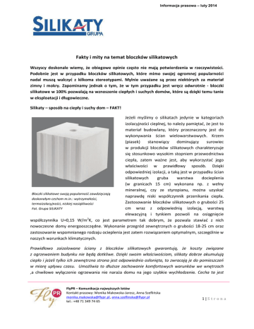 Informacja prasowa – luty 2014 Fakty i mity na temat bloczków silikatowych Wszyscy doskonale wiemy, że obiegowe opinie często nie mają potwierdzenia w rzeczywistości. Podobnie jest w przypadku bloczków silikatowych, które mimo swojej ogromnej popularności nadal muszą walczyć z kilkoma stereotypami. Mylnie uważane są przez niektórych za materiał zimny i mokry. Zapominamy jednak o tym, że w tym przypadku jest wręcz odwrotnie - bloczki silikatowe w 100% pozwalają na wznoszenie ciepłych i suchych domów, które są dzięki temu tanie w eksploatacji i długowieczne. Silikaty – sposób na ciepły i suchy dom – FAKT! Jeżeli myślimy o silikatach jedynie w kategoriach izolacyjności cieplnej, to należy pamiętać, że jest to materiał budowlany, który przeznaczony jest do wykonywania ścian wielowarstwowych. Krzem (piasek) stanowiący dominujący surowiec w produkcji bloczków silikatowych charakteryzuje się stosunkowo wysokim stopniem przewodnictwa ciepła, zatem ważne jest, aby wykorzystać jego właściwości w prawidłowy sposób. Dzięki odpowiedniej izolacji, a taką jest w przypadku ścian silikatowych gruba warstwa docieplenia (w granicach 15 cm) wykonana np. z wełny mineralnej, czy ze styropianu, można uzyskać Bloczki silikatowe swoją popularność zawdzięczają naprawdę niski współczynnik przenikania ciepła. doskonałym cechom m.in.: wytrzymałości, Zastosowanie bloczków silikatowych o grubości 25 termoizolacyjności, niskiej nasiąkliwości cm wraz z odpowiednią izolacją, warstwą Fot. Grupa SILIKATY elewacyjną i tynkiem pozwoli na osiągnięcie 2 współczynnika U=0,15 W/m K, co jest parametrem tak dobrym, że pozwala stawiać z nich nowoczesne domy energooszczędne. Wykonanie przegród zewnętrznych o grubości 18-25 cm oraz zastosowanie wspomnianego rodzaju ocieplenia jest zatem rozwiązaniem optymalnym, szczególnie w naszych warunkach klimatycznych. Prawidłowo zaizolowane ściany z bloczków silikatowych gwarantują, że koszty związane z ogrzewaniem budynku nie będą dotkliwe. Dzięki swoim właściwościom, silikaty dobrze akumulują ciepło i jeżeli tylko ich zewnętrzna strona jest odpowiednio osłonięta, to zwracają je do pomieszczeń w miarę upływu czasu. Umożliwia to dłuższe zachowanie komfortowych warunków we wnętrzach ,a chwilowe wyłączenie ogrzewania nie naraża domu na jego szybkie wychłodzenie. Cecha ta jest FlyPR – Komunikacja najwyższych lotów Kontakt prasowy: Monika Makowska-Jarosz, Anna Szeflińska [email protected], [email protected] tel.: +48 71 349 74 65 1|S t r o n a Informacja prasowa – luty 2014 wynikiem dużej gęstości bloczków silikatowych, która wynosi od 1400 do 2000 kg na metr sześcienny – mówi Joanna Nowaczyk, Doradca Techniczny Grupy SILIKATY. Często spotykamy się również z obiegową opinią, że silikaty są to materiały mokre, mocno nasiąkliwe – szybko chłonące wodę i wymagające specjalnych hydroizolacji. Nic bardziej mylnego, bowiem silikaty charakteryzują się najniższą nasiąkliwością, od 10 do 16 %, a to w porównaniu z innymi materiałami dostępnymi na rynku, daje im najlepszy wynik. Ściany zewnętrzne z silikatów można więc bez obaw pozostawić jako nieotynkowane. Nie ulegną one bowiem degradacji pod wpływem czynników atmosferycznych i będą również odporne na zamarzanie. Ciężkie i wytrzymałe – FAKT! Jeżeli ściany z bloczków silikatowych zostaną prawidłowo ocieplone, to tak naprawdę trudno znaleźć więcej problematycznych kwestii. Niektórzy zwracają jednak uwagę na to, że silikaty są materiałem stosunkowo ciężkim i kruchym. Nie sposób nie zgodzić się z tymi twierdzeniami, jednakże cechy te stanowią jednocześnie ich atuty. Kruchość silikatów jest efektem wykorzystywania do ich produkcji jedynie naturalnych surowców – 90% to piasek, 7% wapno i 3% wody. Uzyskany w ten sposób Bloczki silikatowe są materiałem, który nie wymaga produkt to swego rodzaju „sztuczny kamień”, otynkowania Fot. Grupa Silikaty który dzięki temu jest jednocześnie całkowicie ekologiczny, nie emituje żadnych szkodliwych związków, a jego promieniotwórczość jest tak niewielka, że zalicza go do najbezpieczniejszych i najzdrowszych materiałów budowlanych dostępnych na rynku. Duża masa silikatów w połączeniu z właściwościami krzemu sprawia , że wykonane z nich bloczki są wyjątkowo wytrzymałe na ściskanie, co ma znaczący wpływ na bezpieczeństwo wznoszonych przy ich wykorzystaniu budynków. Ma ona również znaczenie w kwestii izolacyjności akustycznej. Silikaty bowiem najskuteczniej chronią przed nadmiernym hałasem, który dochodzi z zewnątrz budynku. Potrafią także bardzo dobrze wyciszyć nieprzyjemne szumy wydobywające się z wewnętrznych instalacji bądź pomieszczeń technicznych – podsumowuje Joanna Nowaczyk. Do zdecydowanych zalet bloczków silikatowych zalicza się także ich bezpieczeństwo pożarowe. Są one bowiem materiałem niepalnym o najwyższej klasie odporności na ogień – EUROKLASA A1. Nawet stosunkowo cienka, bo zaledwie 18-centymetrowa ściana wykonana z silikatów pozwala na bezpośrednie oddziaływanie ognia nawet do 4 godzin bez zagrożenia dla całej konstrukcji. Umożliwia to zatem sprawną akcję ewakuacyjną oraz gaśniczą. FlyPR – Komunikacja najwyższych lotów Kontakt prasowy: Monika Makowska-Jarosz, Anna Szeflińska [email protected], [email protected] tel.: +48 71 349 74 65 2|S t r o n a Informacja prasowa – luty 2014 Silikaty są materiałem budowlanym coraz częściej docenianym przez specjalistów z dziedziny budownictwa (architektów, inwestorów, czy wykonawców), który jak każdy inny, potrzebuje prawidłowego zastosowania oraz umiejętnego obchodzenia się z nim. Jego wykorzystanie w świadomym, nowoczesnym budownictwie pozwala na wykonywanie obiektów nie tylko efektywnych energetycznie, ale również trwałych i bezpiecznych. ----------------------------