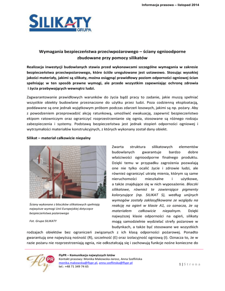 Informacja prasowa – listopad 2014 Wymagania bezpieczeństwa przeciwpożarowego – ściany ognioodporne zbudowane przy pomocy silikatów Realizacja inwestycji budowlanych stawia przed wykonawcami szczególne wymagania w zakresie bezpieczeństwa przeciwpożarowego, które ściśle uregulowane jest ustawowo. Stosując wysokiej jakości materiały, jakimi są silikaty, można osiągnąć prawidłowy poziom odporności ogniowej ścian spełniając w ten sposób prawne wymogi, ale przede wszystkim zapewniając ochronę zdrowia i życia przebywających wewnątrz ludzi. Zagwarantowanie prawidłowych warunków do życia bądź pracy to zadanie, jakie muszą spełniać wszystkie obiekty budowlane przeznaczone do użytku przez ludzi. Poza codzienną eksploatacją, poddawane są one jednak wyjątkowym próbom podczas zdarzeń losowych, jakimi są np. pożary. Aby z powodzeniem przeprowadzić akcję ratunkową, umożliwić ewakuację, zapewnić bezpieczeństwo ekipom ratowniczym oraz ograniczyć rozprzestrzenianie się ognia, stosowane są różnego rodzaju zabezpieczenia i systemy. Podstawą bezpieczeństwa jest jednak stopień odporności ogniowej i wytrzymałości materiałów konstrukcyjnych, z których wykonany został dany obiekt. Silikat – materiał całkowicie niepalny Zwarta struktura silikatowych elementów budowlanych gwarantuje bardzo dobre właściwości ognioodporne finalnego produktu. Dzięki temu w przypadku zagrożenia pozwalają one nie tylko ocalić życie i zdrowie ludzi, ale również ograniczyć utratę mienia, którym są same nieruchomości mieszkalne i użytkowe, a także znajdujące się w nich wyposażenie. Bloczki silikatowe, również te zawierające pigmenty koloryzujące (np. SILIKAT S), według unijnych wymogów zostały zaklasyfikowane ze względu na Ściany wykonane z bloczków silikatowych spełniają reakcję na ogień w klasie A1, co oznacza, że są najwyższe wymogi Unii Europejskiej dotyczące materiałem całkowicie niepalnym. Dzięki bezpieczeństwa pożarowego najwyższej klasie odporności na ogień, silikaty Fot. Grupa SILIKATY mogą samodzielnie wydzielać strefy pożarowe w budynkach, a także być stosowane we wszystkich rodzajach obiektów bez ograniczeń związanych z ich klasą odporności pożarowej. Ponadto gwarantują one najwyższą nośność (R), szczelność (E) oraz izolacyjność ogniową (I). Oznacza to, że w razie pożaru nie rozprzestrzeniają ognia, nie odkształcają się i zachowują funkcje nośne konieczne do FlyPR – Komunikacja najwyższych lotów Kontakt prasowy: Monika Makowska-Jarosz, Anna Szeflińska [email protected], [email protected] tel.: +48 71 349 74 65 1|S t r o n a Informacja prasowa – listopad 2014 zachowania stabilności konstrukcji, przez określony czas eliminując w ten sposób ryzyko zawalenia ściany pod wpływem trudnych do przewidzenia przyrostów obciążeń. Zabezpieczają przed przenikaniem płomieni oraz gorących gazów, a także izolują pomieszczenia nie pozwalając na znaczny wzrost temperatury. Tym samym umożliwiają nie tylko przeprowadzenie sprawnej ewakuacji, ale również gwarantują bezpieczeństwo ekip strażackich, które ponadto mają ułatwione zadanie w gaszeniu pożarów. Bezpieczeństwo przeciwpożarowe zgodne z normami Zgodnie z wytycznymi zawartymi w normie PN-EN1996-1-2 określającej klasyfikację ogniową wyrobów budowlanych i elementów budynków, bloczki silikatowe mają zdecydowaną przewagę nad innymi materiałami murowymi. Już dla ściany grubości 12 cm z wyrobów pełnych można wykonać ścianę ogniową o klasie odporności ogniowej REI 120 – podkreśla Joanna Nowaczyk. Przegrody wykonane z silikatów nie tracą swoich właściwości nawet w trakcie długotrwałego oddziaływania ognia. W przypadku ścian nośnych oddzielających Budynki wznoszone przy pomocy silikatów są znacznie (kryteria REI) z uwagi na odporność ogniową odporniejsze na uszkodzenia niż te wykonane z zgodnie z EC6-PN-EN 1996-1-2, minimalna grubość pustaków, co przekłada się na zwiększone ściany dla uzyskania klasy odporności ogniowej w bezpieczeństwo w obiektach modernizowanych zakresie od 30 do 60 min. wynosi 90 mm. A zatem Fot. Grupa SILIKATY już najcieńsze przegrody wykonane z bloczków silikatowych gwarantują spełnienie wymogów przeciwpożarowych. Ściany nienośne oddzielające, które muszą spełniać jedynie kryteria E oraz I (szczelność oraz izolacyjność) już przy grubości 70 mm uzyskują klasę odporności ogniowej 30. Biorąc pod uwagę, że zarówno przegrody nośne, jak i zwykłe ścianki działowe zazwyczaj budowane są o grubości od 100 mm, dzięki zastosowaniu silikatów mocno zwiększa się bezpieczeństwo wykonanych przy ich użyciu budynków – podsumowuje Joanna Nowaczyk. ------------------------------------------------------------------------------------------------------------------------------------------------------------------„Grupa SILIKATY” Sp. z o.o. to jeden z czołowych w Polsce producentów wyrobów silikatowych do wznoszenia ścian zewnętrznych, konstrukcyjnych, działowych, fundamentowych, ogniowych i piwnicznych. Grupa powstała w 2004 roku z połączenia krajowych producentów, z których każdy posiadał kilkudziesięcioletnie doświadczenie w produkcji SILIKATÓW. Obecnie Grupa SILIKATY skupia 7 zakładów produkcyjnych zlokalizowanych na terenie całej Polski (w Krukach k/Ostrołęki, Piszu, Przysieczynie, Ludyni, Leżajsku, Kluczach, Jedlance i dostarcza na rynek ponad 30% wszystkich sprzedawanych w kraju wyrobów wapienno-piaskowych. Poprzez swoich przedstawicieli firma aktywnie uczestniczy w pracach komitetu technicznego Europejskiego Stowarzyszenia Producentów Silikatów. Grupa SILIKATY jest także członkiem polskiego FlyPR – Komunikacja najwyższych lotów Kontakt prasowy: Monika Makowska-Jarosz, Anna Szeflińska [email protected], [email protected] tel.: +48 71 349 74 65 2|S t r o n a Informacja prasowa – listo