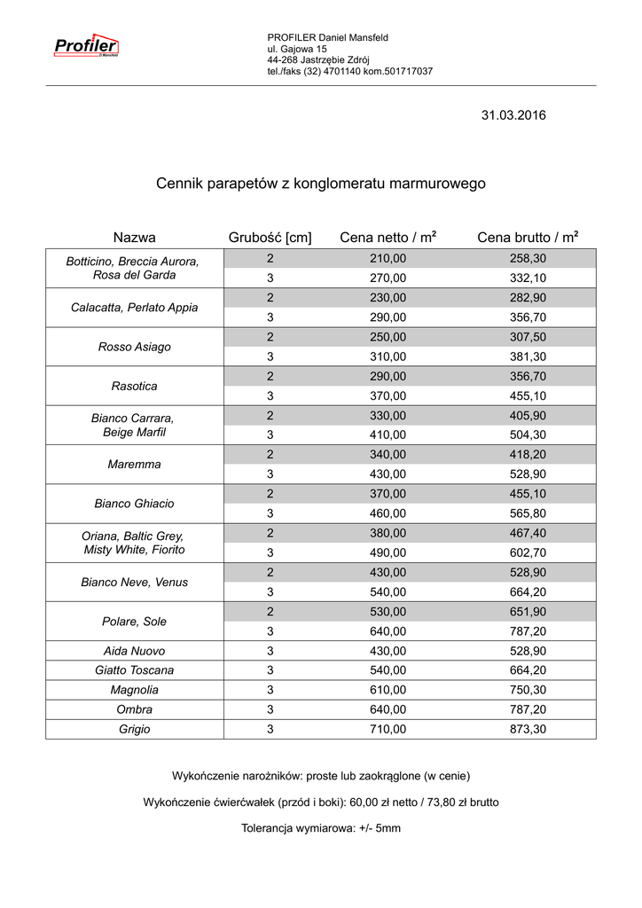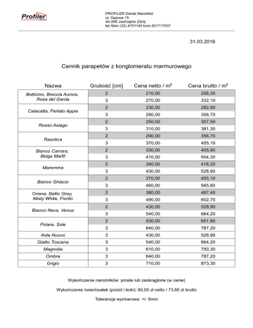 PROFILER Daniel Mansfeld ul. Gajowa 15 44-268 Jastrzębie Zdrój tel./faks (32) 4701140 kom.501717037 31.03.2016 Cennik parapetów z konglomeratu marmurowego Nazwa Grubość [cm] Cena netto / m2 Cena brutto / m2 Botticino, Breccia Aurora, Rosa del Garda 2 210,00 258,30 3 270,00 332,10 2 230,00 282,90 3 290,00 356,70 2 250,00 307,50 3 310,00 381,30 2 290,00 356,70 3 370,00 455,10 2 330,00 405,90 3 410,00 504,30 2 340,00 418,20 3 430,00 528,90 2 370,00 455,10 3 460,00 565,80 2 380,00 467,40 3 490,00 602,70 2 430,00 528,90 3 540,00 664,20 2 530,00 651,90 3 640,00 787,20 Aida Nuovo 3 430,00 528,90 Giatto Toscana 3 540,00 664,20 Magnolia 3 610,00 750,30 Ombra 3 640,00 787,20 Grigio 3 710,00 873,30 Calacatta, Perlato Appia Rosso Asiago Rasotica Bianco Carrara, Beige Marfil Maremma Bianco Ghiacio Oriana, Baltic Grey, Misty White, Fiorito Bianco Neve, Venus Polare, Sole Wykończenie narożników: proste lub zaokrąglone (w cenie) Wykończenie ćwierćwałek (przód i boki): 60,00 zł netto / 73,80 zł brutto Tolerancja wymiarowa: +/- 5mm