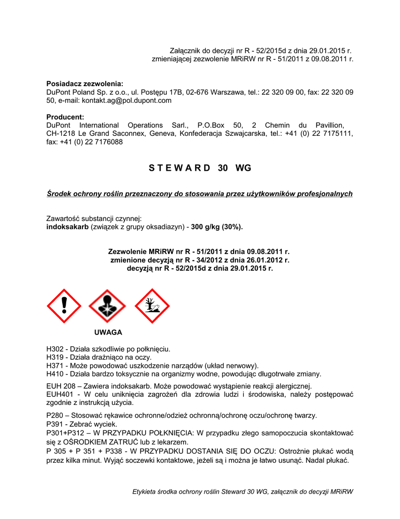 Załącznik do decyzji nr R - 52/2015d z dnia 29.01.2015 r. zmieniającej zezwolenie MRiRW nr R - 51/2011 z 09.08.2011 r. Posiadacz zezwolenia: DuPont Poland Sp. z o.o., ul. Postępu 17B, 02-676 Warszawa, tel.: 22 320 09 00, fax: 22 320 09 50, e-mail: [email protected] Producent: DuPont International Operations Sarl., P.O.Box 50, 2 Chemin du Pavillion, CH-1218 Le Grand Saconnex, Geneva, Konfederacja Szwajcarska, tel.: +41 (0) 22 7175111, fax: +41 (0) 22 7176088 S T E W A R D 30 WG Środek ochrony roślin przeznaczony do stosowania przez użytkowników profesjonalnych Zawartość substancji czynnej: indoksakarb (związek z grupy oksadiazyn) - 300 g/kg (30%). Zezwolenie MRiRW nr R - 51/2011 z dnia 09.08.2011 r. zmienione decyzją nr R - 34/2012 z dnia 26.01.2012 r. decyzją nr R - 52/2015d z dnia 29.01.2015 r. UWAGA H302 - Działa szkodliwie po połknięciu. H319 - Działa drażniąco na oczy. H371 - Może powodować uszkodzenie narządów (układ nerwowy). H410 - Działa bardzo toksycznie na organizmy wodne, powodując długotrwałe zmiany. EUH 208 – Zawiera indoksakarb. Może powodować wystąpienie reakcji alergicznej. EUH401 - W celu uniknięcia zagrożeń dla zdrowia ludzi i środowiska, należy postępować zgodnie z instrukcją użycia. P280 – Stosować rękawice ochronne/odzież ochronną/ochronę oczu/ochronę twarzy. P391 - Zebrać wyciek. P301+P312 – W PRZYPADKU POŁKNIĘCIA: W przypadku złego samopoczucia skontaktować się z OŚRODKIEM ZATRUĆ lub z lekarzem. P 305 + P 351 + P338 - W PRZYPADKU DOSTANIA SIĘ DO OCZU: Ostrożnie płukać wodą przez kilka minut. Wyjąć soczewki kontaktowe, jeżeli są i można je łatwo usunąć. Nadal płukać. Etykieta środka ochrony roślin Steward 30 WG, załącznik do decyzji MRiRW P309 + P311 - W przypadku narażenia lub złego samopoczucia: Skontaktować się z OŚRODKIEM ZATRUĆ lub lekarzem. OPIS DZIAŁANIA Środek owadobójczy w formie granul do sporządzania zawiesiny wodnej, o działaniu kontaktowym i żołądkowym, przeznaczony do zwalczania jaj oraz larw szkodliwych owadów zjadających liście w uprawie jabłoni, porzeczki czarnej, porzeczki czerwonej, winorośli, kapusty głowiastej białej i kukurydzy. Na roślinie środek działa powierzchniowo. Środek działa na komórki nerwowe owada, co prowadzi do paraliżu, a następnie do śmierci szkodnika w czasie 24-60 godzin od pobrania środka wraz z pokarmem. Szkodnik przestaje żerować po 2-8 godzinach od zabiegu. Środek przeznaczony do stosowania przy użyciu opryskiwaczy polowych oraz sadowniczych. STOSOWANIE ŚRODKA ROŚLINY SADOWNICZE Jabłoń Owocówka jabłkóweczka Maksymalna dawka dla jednorazowego zastosowania: 0,2 kg/ha. Zalecana dawka dla jednorazowego stosowania: 0,17 – 0,2 kg/ha. Termin stosowania: Opryskiwać w okresie intensywnego lotu motyli i składnia jaj (na kilka dni przed rozpoczęciem wylęgu gąsienic) od początku fazy rozwoju owoców do fazy, gdy owoc osiąga 70% typowej wielkości (BBC 71-77). Zwójki liściowe Zalecana dawka dla jednorazowego stosowania: 0,17 kg/ha. Termin stosowania: Opryskiwać latem w okresie wylęgania się gąsienic od początku fazy rozwoju owoców do fazy, gdy owoc osiąga 70% typowej wielkości (BBC 71-77). Zalecana ilość wody: 500 - 900 l/ha. Zalecane opryskiwanie: drobnokropliste. Maksymalna liczba zabiegów w sezonie wegetacyjnym 3. Odstęp między zabiegami co najmniej 10 dni. ROŚLINY WARZYWNE Kapusta głowiasta biała Bielinek kapustnik Maksymalna dawka dla jednorazowego stosowania: 0,12 kg/ha. Zalecana dawka dla jednorazowego stosowania: 0,1 – 0,12 kg/ha. Termin stosowania: Opryskiwać w okresie masowego wylęgania się gąsienic od początku fazy kwitnienia do końca fazy dojrzewania owoców i nasion (BBCH 61-89). Bielinek rzepnik, tantniś krzyżowiaczek Zalecana dawka dla jednorazowego stosowania: 0,1 kg/ha. Termin stosowania: Opryskiwać w okresie masowego wylęgania się gąsienic. Zalecana ilość wody: 500 - 600 l/ha. Etykieta środka ochrony roślin Steward 30 WG, załącznik do decyzji MRiRW Zalecane opryskiwanie: drobnokropliste. Maksymalna liczba zabiegów w sezonie wegetacyjnym 3. Odstęp między zabiegami: co najmniej 10 dni. ROŚLINY ROLNICZE Kukurydza Omacnica prosowianka Maksymalna dawka dla jednorazowego stosowania: 0,15 kg/ha. Zalecana dawka dla jednorazowego stosowania: 0,125– 0,15 kg/ha. Zalecany jest dodatek adiuwanta Trend 90 EC w ilości 0,1% (100 ml na 100 l). Wyższą dawkę stosować w przypadku dużej liczebności szkodnika lub starszych roślin kukurydzy. Liczba zabiegów: 2. Odstęp między zabiegami: co najmniej 10 dni. Termin stosowania: Opryskiwać od początku masowego wylotu motyli do momentu wylęgu pierwszych larw nie wcześniej niż od fazy czwartego kolanka i nie później niż do fazy pełnej dojrzałości mlecznej ziarniaków (BBCH 34-77). Zastosowanie środka zapewnia średni poziom zwalczania szkodnika. Zalecana ilość wody: 300 - 400 l/ha. Zalecane opryskiwanie: drobnokropliste. Zachodnia kukurydziana stonka korzeniowa Maksymalna dawka dla jednorazowego stosowania: 0,15 kg/ha. Zalecana dawka dla jednorazowego stosowania: 0,125 – 0,15 kg/ha. Zalecany jest dodatek adiuwanta Trend 90 EC w ilości 0,1% (100 ml na 100 l). Liczba zabiegów: 1. Termin stosowania: Opryskiwać od fazy kwitnienia (początek pylenia) do początku fazy dojrzałości woskowej (BBCH 63-83). Zalecana ilość wody: 200 - 400 l/ha. Zalecane opryskiwanie: drobnokropliste. Maksymalna liczba zabiegów w sezonie wegetacyjnym: 2. Stosowanie środka ochrony roślin w uprawach i zastosowaniach małoobszarowych Odpowiedzialność za skuteczność działania i fitotoksyczność środka ochrony roślin stosowanego w uprawach małoobszarowych ponosi wyłącznie jego użytkownik. ROŚLINY SADOWNICZE Porzeczka czarna, porzeczka czerwona Zwójki liściowe Maksymalna dawka dla jednorazowego zastosowania: 0,17 kg/ha. Etykieta środka ochrony roślin Steward 30 WG, załącznik do decyzji MRiRW Zalecana dawka 