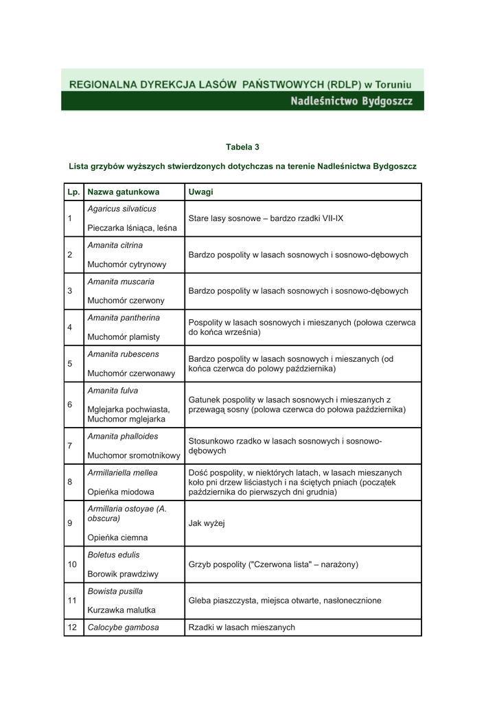 Tabela 3 Lista grzybów wyższych stwierdzonych dotychczas na