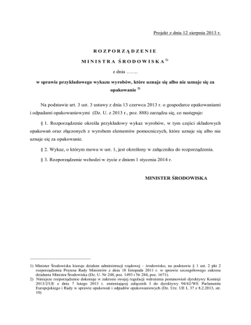 Projekt z dnia 12 sierpnia 2013 r. ROZPORZĄDZENIE M I N I S T R A Ś R O D O W I S K A 1) z dnia ……. w sprawie przykładowego wykazu wyrobów, które uznaje się albo nie uznaje się za opakowanie 2) Na podstawie art. 3 ust. 3 ustawy z dnia 13 czerwca 2013 r. o gospodarce opakowaniami i odpadami opakowaniowymi (Dz. U. z 2013 r., poz. 888) zarządza się, co następuje: § 1. Rozporządzenie określa przykładowy wykaz wyrobów, w tym części składowych opakowań oraz złączonych z wyrobem elementów pomocniczych, które uznaje się albo nie uznaje się za opakowanie. § 2. Wykaz, o którym mowa w ust. 1, jest określony w załączniku do rozporządzenia. § 3. Rozporządzenie wchodzi w życie z dniem 1 stycznia 2014 r. MINISTER ŚRODOWISKA 1) Minister Środowiska kieruje działem administracji rządowej – środowisko, na podstawie § 1 ust. 2 pkt 2 rozporządzenia Prezesa Rady Ministrów z dnia 18 listopada 2011 r. w sprawie szczegółowego zakresu działania Ministra Środowiska (Dz. U. Nr 248, poz. 1493 i Nr 284, poz. 1671). 2) Niniejsze rozporządzenie dokonuje w zakresie swojej regulacji wdrożenia postanowień dyrektywy Komisji 2013/2/UE z dnia 7 lutego 2013 r. zmieniającej załącznik I do dyrektywy 94/62/WE Parlamentu Europejskiego i Rady w sprawie opakowań i odpadów opakowaniowych (Dz. Urz. UE L 37 z 8.2.2013, str. 10) –2– Załącznik do rozporządzenia Ministra Środowiska z dnia … PRZYKŁADOWY WYKAZ WYROBÓW, W TYM CZĘŚCI SKŁADOWYCH OPAKOWAŃ ORAZ ZŁĄCZONYCH Z WYROBEM ELEMENTÓW POMOCNICZYCH, KTÓRE UZNAJE SIĘ ALBO NIE UZNAJE SIĘ ZA OPAKOWANIE 1. Przykłady wyrobów stanowiących integralną część produktu oraz niezbędnych do przechowywania, utrzymywania lub zabezpieczania produktu przez cały cykl i okres jego funkcjonowania: 1) opakowania: a) pudełka po słodyczach, b) folia pokrywająca opakowania płyt CD, c) torebki do wysyłania pocztą katalogów i czasopism (z zawartością), d) ozdobne podkładki pod ciasta sprzedawane z ciastem, e) rolki, tuby oraz cylindry, wokół których nawijany jest giętki materiał (np. folia z tworzywa sztucznego, aluminium, papier) z wyjątkiem rolek, tub i cylindrów będących częścią urządzeń produkcyjnych i nieużywanych do prezentacji produktów w opakowaniach detalicznych, f) doniczki kwiatowe przeznaczone wyłącznie do sprzedaży i transportu roślin, a nie do uprawy roślin, g) szklane butelki do roztworów do iniekcji, h) szpule na płyty CD (sprzedawane z płytami CD, nieprzeznaczone do wykorzystywania do przechowywania płyt), i) wieszaki na ubrania (sprzedawane z ubraniami), j) pudełka od zapałek, k) opakowania zapewniające sterylność (torby, tacki i materiały niezbędne do zachowania sterylności produktu), l) kapsułki do urządzeń do przygotowywania napojów (np. z kawą, kakao, mlekiem), które są puste po użyciu, –3– m) stalowe butle wielokrotnego użytku używane do różnych rodzajów gazu, z wyłączeniem gaśnic; 2) wyroby nie będące opakowaniami: a) doniczki kwiatowe stałe, b) pudełka na narzędzia, c) torebki herbaty, d) warstwy wosku pokrywające ser, e) skóry kiełbas, f) wieszaki na ubrania (sprzedawane oddzielnie), g) kapsułki z kawą do ekspresów kapsułkowych, foliowe opakowania po kawie oraz papierowe saszetki z kawą wyrzucane razem ze zużytą kawą, h) wkłady atramentowe do drukarek, i) opakowania na płyty CD, DVD i kasety wideo (sprzedawane razem z płytami CD, DVD lub kasetami wideo), j) szpule na płyty CD (sprzedawane puste, przeznaczone do wykorzystywania do przechowywania płyt), k) rozpuszczalne torebki na detergenty, l) znicze nagrobne (pojemniki na świeczki), m) ręczny młynek (stanowiący część pojemnika wielokrotnego użytku, np. młynek do pieprzu do wielokrotnego napełniania). 2. Przykłady wyrobów wytworzonych i przeznaczonych do wypełniania w punkcie sprzedaży oraz wyrobów jednorazowego użytku – sprzedanych, wypełnionych, wytworzonych lub przeznaczonych do wypełniania w punkcie sprzedaży: 1) opakowania: a) papierowe i wykonane z tworzywa sztucznego torby na zakupy, b) jednorazowe talerze i kubki, c) folia spożywcza, d) torebki na kanapki, e) folia aluminiowa, f) folia plastikowa na ubrania wyczyszczone w pralniach; 2) wyroby nie będące opakowaniami: a) mieszadła, b) jednorazowe sztućce, –4– c) papier do pakowania (sprzedawany oddzielnie), d) papierowe formy do ciasta (sprzedawane puste), e) ozdobne podkładki pod ciasta sprzedawane oddzielnie. 3. Wyroby oraz części składowe opakowań oraz złączonych z opakowaniem elementów pomocniczych, spełniających funkcje opakowań: 1) opakowania: a) etykiety powiązane bezpośrednio lub dołączone do produktu; 2) elementy opakowań: a) szczoteczka do nakładania tuszu do rzęs stanowiąca część zamknięcia opakowania, b) przylepne etykiety przyczepione do innego wyrobu opakowaniowego, c) zszywki, d) koszulki foliowe, e) miarka, stanowiąca element zamknięcia pojemnika dla detergentów, f) ręczny młynek (stanowiący część pojemnika jednorazowego użytku wypełnionego produktem, np. młynek do pieprzu wypełniony pieprzem); 3) wyroby niebędące opakowaniami: a) identyfikatory RFID. –5– UZASADNIENIE Projekt rozporządzenia Ministra Środowiska w sprawie przykładowego wykazu wyrobów, w tym części składowych opakowań oraz złączonych z wyrobem elementów pomocniczych, które uznaje się albo nie uznaje się za opakowanie stanowi wykonanie upoważnienia zwartego w art. 3 ust. 3 ustawy z dnia 13 czerwca 2013 r. o gospodarce opakowaniami i odpadami opakowaniowymi (Dz. U. z 2013 r., poz. 888). Celem projektu rozporządzenia jest wskazanie wprowadzającym do obrotu produkty w opakowaniach przykładów wyrobów ilustrujących definicje opakowania zawartą w przepisach ustawy o gospodarce opakowaniami i odpadami opakowaniowymi. Załącznik do rozporządzenia został opracowany na podstawie załącznika nr 1 do dyrektywy 94/62/WE Parlamentu Europejskiego i R