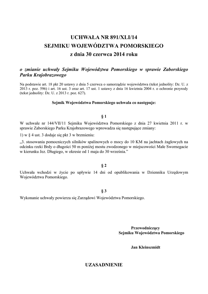 UCHWAŁA NR 891/XLI/14 SEJMIKU WOJEWÓDZTWA POMORSKIEGO z dnia 30 czerwca 2014 roku o zmianie uchwały Sejmiku Województwa Pomorskiego w sprawie Zaborskiego Parku Krajobrazowego Na podstawie art. 18 pkt 20 ustawy z dnia 5 czerwca o samorządzie województwa (tekst jednolity: Dz. U. z 2013 r. poz. 596) i art. 16 ust. 3 oraz art. 17 ust. 1 ustawy z dnia 16 kwietnia 2004 r. o ochronie przyrody (tekst jednolity: Dz. U. z 2013 r. poz. 627). Sejmik Województwa Pomorskiego uchwala co następuje: §1 W uchwale nr 144/VII/11 Sejmiku Województwa Pomorskiego z dnia 27 kwietnia 2011 r. w sprawie Zaborskiego Parku Krajobrazowego wprowadza się następujące zmiany: 1) w § 4 ust. 3 dodaje się pkt 3 w brzmieniu: „3. stosowania pomocniczych silników spalinowych o mocy do 10 KM na jachtach żaglowych na odcinku rzeki Brdy o długości 50 m poniżej mostu zwodzonego w miejscowości Małe Swornegacie w kierunku Jez. Długiego, w okresie od 1 maja do 30 września.” §2 Uchwała wchodzi w życie po upływie 14 dni od opublikowania w Dzienniku Urzędowym Województwa Pomorskiego. §3 Wykonanie uchwały powierza się Zarządowi Województwa Pomorskiego. Przewodniczący Sejmiku Województwa Pomorskiego Jan Kleinszmidt UZASADNIENIE Zgodnie z art. 18 pkt 20 ustawy z dnia 5 czerwca 1998 r. o samorządzie województwa (tekst jednolity: Dz. U. z 2013 r. poz. 596) i art. 16 ust. 3 oraz art. 17 ust. 1 ustawy z dnia 16 kwietnia 2004 r. o ochronie przyrody (tekst jednolity: Dz. U. z 2013 r. poz. 627) Sejmik Województwa określa w drodze uchwały zakazy właściwe dla danego parku krajobrazowego wynikające z potrzeb jego ochrony. W związku z kompetencjami Sejmiku Województwa, Starosta Chojnicki przekazał wniosek Chojnickiego Klubu Żeglarskiego o zmianę uchwały nr 144/VII/11 Sejmiku Województwa Pomorskiego z dnia 27 kwietnia 2011 r. w sprawie Zaborskiego Parku Krajobrazowego poprzez dopuszczenie stosowania pomocniczych silników spalinowych na jachtach żaglowych na odcinku rzeki Brdy w Małych Swornychgaciach. Powiat Chojnicki w ramach Regionalnego Programu Operacyjnego dla Województwa Pomorskiego na lata 2007-2013 zrealizował projekt pn. „Zwiększenie atrakcyjności turystycznej powiatu chojnickiego poprzez budowę mostu zwodzonego w miejscowości Małe Swornegacie w ramach programu Kaszubska Marszruta”. Celem budowy mostu było ożywienie turystyki żeglarskiej na jeziorze Długim i Karsińskim, poprzez umożliwienie przepłynięcia większych jachtów kabinowych na jezioro Długie i Karsińskie, co dotychczas było niemożliwe ze względu na nisko położony już nieistniejący most w Małych Swornychgaciach. Mała szerokość Brdy na tym odcinku oraz silny nurt rzeki, który nie układa się prostopadle do mostu lecz na skos, w znaczący sposób utrudnia bezpieczne przepłynięcie tego odcinka rzeki. Jachty żaglowe, które sterowane są ręcznie, tracą manewrowość i w konsekwencji mogą uderzać w belki odbojowe, co stanowi poważne zagrożenie dla osób przebywających na pokładzie. W związku z powyższym, możliwość stosowania silników spalinowych na proponowanym odcinku wpłynie znacząco na poprawę bezpieczeństwa oraz spowoduje bezkolizyjne przepłynięcie tego fragmentu rzeki. Zgodnie z art. 16 ust. 3 ustawy o ochronie przyrody, w uchwale sejmiku województwa określa się szczególne cele ochrony parku oraz zakazy właściwe dla danego parku, zawarte w art. 17 ust. 1 ustawy, wynikające z potrzeb jego ochrony. Przepisy art. 17 ust. 1 stanowią wzorzec zakazów, które mogą być wprowadzone na terenie parku krajobrazowego. Ustawodawca dał możliwość dostosowania ograniczeń do lokalnych uwarunkowań, pod warunkiem zapewnienia dalszej ochrony tego obszaru. Po analizie potencjalnego wpływu użycia silników spalinowych o mocy do 10 KM na jachtach żaglowych na przedmiotowym fragmencie rzeki Brdy na szczególne cele ochrony parku stwierdzono, iż odstępstwo to nie wpłynie negatywnie na ochronę obszaru parku krajobrazowego i jego wartości przyrodniczych, historycznych i kulturowych w celu zachowania oraz popularyzacji tych wartości oraz na realizację szczególnych celów ochrony zawartych w uchwale. Odcinek rzeki Brdy, którego dotyczy zmiana uchwały sejmiku, położony jest ponadto na obszarze Natura 2000 Wielki Sandr Brdy PLB 220001. W związku z tym przeanalizowano potencjalny wpływ użycia pomocniczych silników spalinowych o mocy do 10 KM na jachtach żaglowych na cele ochrony obszaru Natura 2000. Przedmiotem ochrony na terenie obszaru Natura 2000 Wielki Sandr Brdy są gatunki ptaków z załącznika I Dyrektywy Ptasiej, tj, kania ruda, łabędź krzykliwy, bielik, żuraw, puchacz, lelek kozodój, zimorodek oraz regularnie występujące ptaki migrujące nie wymienione w Załączniku I Dyrektywy Ptasiej, tj. gągoł, nurogęś i brodziec piskliwy. Zgodnie z mapą rozmieszczenia gatunków ptaków – przedmiotów ochrony obszaru Natura 2000, będącej częścią Projektu Planu Zadań Ochronnych obszaru Natura 2000 Wielki Sandr Brdy PLB 220001 w województwie pomorskim, w sąsiedztwie mostu zwodzonego w miejscowości Małe Swornegacie bytują takie gatunki jak: dzięcioł czarny, gągoł i włochatka. Gągoł jest gatunkiem występującym głównie na Jez. Charzykowskim, choć wielokrotnie przemieszcza się między Jez. Charzykowskim i Długim nad lądem. Gniazduje w lesie lub w zadrzewieniach nadwodnych, obfitujących w dziuple wykute przez dzięcioła czarnego. W obrębie mostu zwodzonego dotychczas nie zaobserwowano gągołów z młodymi. Zabezpieczeniem dla tego gatunku jest obecność szerokiego pasa trzcin na Brdzie i sąsiednich jeziorach, które są dogodnym miejscem schronienia. Dzięcioł czarny oraz włochatka nie są natomiast gatunkami ściśle związanymi ze środowiskiem wodnym, w związku z czym nie będą wykazywały negatywnych reakcji na obecność łodzi żaglowych napędzanych silnikami spalinowymi o mocy do 10 KM. W związku z budową mostu zwod