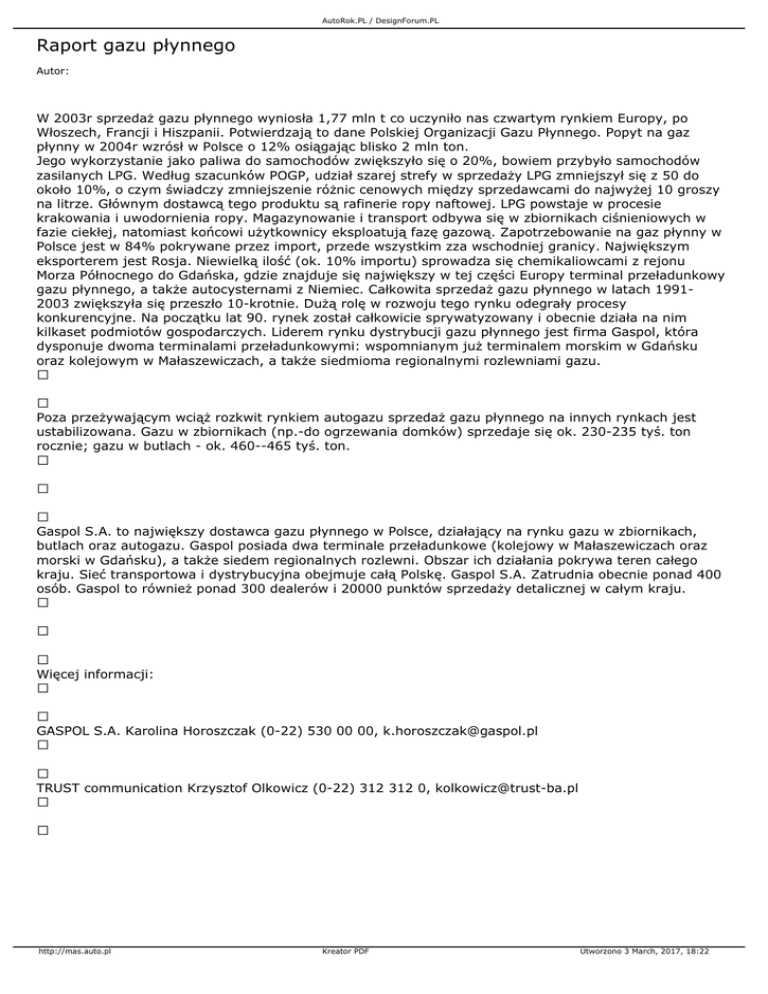 AutoRok.PL / DesignForum.PL Raport gazu płynnego Autor: W 2003r sprzedaż gazu płynnego wyniosła 1,77 mln t co uczyniło nas czwartym rynkiem Europy, po Włoszech, Francji i Hiszpanii. Potwierdzają to dane Polskiej Organizacji Gazu Płynnego. Popyt na gaz płynny w 2004r wzrósł w Polsce o 12% osiągając blisko 2 mln ton. Jego wykorzystanie jako paliwa do samochodów zwiększyło się o 20%, bowiem przybyło samochodów zasilanych LPG. Według szacunków POGP, udział szarej strefy w sprzedaży LPG zmniejszył się z 50 do około 10%, o czym świadczy zmniejszenie różnic cenowych między sprzedawcami do najwyżej 10 groszy na litrze. Głównym dostawcą tego produktu są rafinerie ropy naftowej. LPG powstaje w procesie krakowania i uwodornienia ropy. Magazynowanie i transport odbywa się w zbiornikach ciśnieniowych w fazie ciekłej, natomiast końcowi użytkownicy eksploatują fazę gazową. Zapotrzebowanie na gaz płynny w Polsce jest w 84% pokrywane przez import, przede wszystkim zza wschodniej granicy. Największym eksporterem jest Rosja. Niewielką ilość (ok. 10% importu) sprowadza się chemikaliowcami z rejonu Morza Północnego do Gdańska, gdzie znajduje się największy w tej części Europy terminal przeładunkowy gazu płynnego, a także autocysternami z Niemiec. Całkowita sprzedaż gazu płynnego w latach 19912003 zwiększyła się przeszło 10-krotnie. Dużą rolę w rozwoju tego rynku odegrały procesy konkurencyjne. Na początku lat 90. rynek został całkowicie sprywatyzowany i obecnie działa na nim kilkaset podmiotów gospodarczych. Liderem rynku dystrybucji gazu płynnego jest firma Gaspol, która dysponuje dwoma terminalami przeładunkowymi: wspomnianym już terminalem morskim w Gdańsku oraz kolejowym w Małaszewiczach, a także siedmioma regionalnymi rozlewniami gazu. Poza przeżywającym wciąż rozkwit rynkiem autogazu sprzedaż gazu płynnego na innych rynkach jest ustabilizowana. Gazu w zbiornikach (np.-do ogrzewania domków) sprzedaje się ok. 230-235 tyś. ton rocznie; gazu w butlach - ok. 460--465 tyś. ton. Gaspol S.A. to największy dostawca gazu płynnego w Polsce, działający na rynku gazu w zbiornikach, butlach oraz autogazu. Gaspol posiada dwa terminale przeładunkowe (kolejowy w Małaszewiczach oraz morski w Gdańsku), a także siedem regionalnych rozlewni. Obszar ich działania pokrywa teren całego kraju. Sieć transportowa i dystrybucyjna obejmuje całą Polskę. Gaspol S.A. Zatrudnia obecnie ponad 400 osób. Gaspol to również ponad 300 dealerów i 20000 punktów sprzedaży detalicznej w całym kraju. Więcej informacji: GASPOL S.A. Karolina Horoszczak (0-22) 530 00 00, [email protected] TRUST communication Krzysztof Olkowicz (0-22) 312 312 0, [email protected] http://mas.auto.pl Kreator PDF Utworzono 3 March, 2017, 18:22