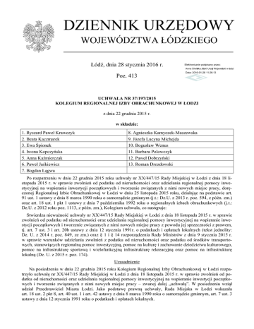 DZIENNIK URZĘDOWY WOJEWÓDZTWA ŁÓDZKIEGO Łódź, dnia 28 stycznia 2016 r. Elektronicznie podpisany przez: Anna Siwińska; Łódzki Urząd Wojewódzki w Łodzi Poz. 413 Data: 2016-01-28 11:26:13 UCHWAŁA NR 37/197/2015 KOLEGIUM REGIONALNEJ IZBY OBRACHUNKOWEJ W ŁODZI z dnia 22 grudnia 2015 r. w składzie: 1. Ryszard Paweł Krawczyk 2. Beata Kaczmarek 3. Ewa Śpionek 4. Iwona Kopczyńska 5. Anna Kaźmierczak 6. Paweł Jaśkiewicz 7. Bogdan Łągwa 8. Agnieszka Kamyczek-Maszewska 9. Józefa Lucyna Michejda 10. Bogusław Wenus 11. Barbara Polowczyk 12. Paweł Dobrzyński 13. Roman Drozdowski Po rozpatrzeniu w dniu 22 grudnia 2015 roku uchwały nr XX/447/15 Rady Miejskiej w Łodzi z dnia 18 listopada 2015 r. w sprawie zwolnień od podatku od nieruchomości oraz udzielania regionalnej pomocy inwestycyjnej na wspieranie inwestycji początkowych i tworzenie związanych z nimi nowych miejsc pracy, doręczonej Regionalnej Izbie Obrachunkowej w Łodzi w dniu 25 listopada 2015 roku, działając na podstawie art. 91 ust. 1 ustawy z dnia 8 marca 1990 roku o samorządzie gminnym (j.t.: Dz.U. z 2013 r. poz. 594, z późn. zm.) oraz art. 18 ust. 1 pkt 1 ustawy z dnia 7 października 1992 roku o regionalnych izbach obrachunkowych (j.t.: Dz.U. z 2012 roku poz. 1113, z późn. zm.), Kolegium uchwala, co następuje: Stwierdza nieważność uchwały nr XX/447/15 Rady Miejskiej w Łodzi z dnia 18 listopada 2015 r. w sprawie zwolnień od podatku od nieruchomości oraz udzielania regionalnej pomocy inwestycyjnej na wspieranie inwestycji początkowych i tworzenie związanych z nimi nowych miejsc pracy z powodu jej sprzeczności z prawem, tj. art. 7 ust. 3 i art. 20b ustawy z dnia 12 stycznia 1991r. o podatkach i opłatach lokalnych (tekst jednolity: Dz. U. z 2014 r. poz. 849, ze zm.) oraz § 1 i § 14 rozporządzenia Rady Ministrów z dnia 9 stycznia 2015 r. w sprawie warunków udzielania zwolnień z podatku od nieruchomości oraz podatku od środków transportowych, stanowiących regionalną pomoc inwestycyjną, pomoc na kulturę i zachowanie dziedzictwa kulturowego, pomoc na infrastrukturę sportową i wielofunkcyjną infrastrukturę rekreacyjną oraz pomoc na infrastrukturę lokalną (Dz. U. z 2015 r. poz. 174). Uzasadnienie Na posiedzeniu w dniu 22 grudnia 2015 roku Kolegium Regionalnej Izby Obrachunkowej w Łodzi rozpatrzyło uchwałę nr XX/447/15 Rady Miejskiej w Łodzi z dnia 18 listopada 2015 r. w sprawie zwolnień od podatku od nieruchomości oraz udzielania regionalnej pomocy inwestycyjnej na wspieranie inwestycji początkowych i tworzenie związanych z nimi nowych miejsc pracy – zwanej dalej „uchwałą”. W posiedzeniu wziął udział Przedstawiciel Miasta Łodzi. Jako podstawę prawną uchwały, Rada Miejska w Łodzi wskazała art. 18 ust. 2 pkt 8, art. 40 ust. 1 i art. 42 ustawy z dnia 8 marca 1990 roku o samorządzie gminnym, art. 7 ust. 3 ustawy z dnia 12 stycznia 1991 roku o podatkach i opłatach lokalnych. Dziennik Urzędowy Województwa Łódzkiego –2– Poz. 413 Zgodnie z treścią art. 18 ust. 2 pkt 8 ustawy o samorządzie gminnym, do wyłącznej właściwości rady gminy należy podejmowanie uchwał w sprawach podatków i opłat lokalnych w granicach określonych w odrębnych ustawach. Stosownie zaś do treści art. 7 ust. 3 ustawy o podatkach i opłatach lokalnych, rada gminy w drodze uchwały, może wprowadzić inne zwolnienia przedmiotowe niż określone ust. 1 oraz w art. 10 ust. 1 ustawy z dnia 2 października 2003 r. o zmianie ustawy o specjalnych strefach ekonomicznych i niektórych ustaw (Dz. U. Nr 188, poz. 1840, ze zm.). W treści § 2 uchwały wskazano, że zwolnienie od podatku od nieruchomości budynków lub ich części oraz budowli lub ich części wpisanych do gminnej ewidencji zabytków miasta Łodzi, w których realizowana jest inwestycja początkowa, stanowi pomoc inwestycyjną i przysługuje na warunkach określonych rozporządzeniem Rady Ministrów z dnia 9 stycznia 2015 roku w sprawie warunków udzielania zwolnień z podatku od nieruchomości oraz podatku od środków transportowych, stanowiących regionalną pomoc inwestycyjną, pomoc na kulturę i zachowanie dziedzictwa kulturowego, pomoc na infrastrukturę sportową i wielofunkcyjną infrastrukturę rekreacyjną oraz pomoc na infrastrukturę lokalną (Dz. U. z 2015 r. poz. 174), zwanego dalej rozporządzeniem Rady Ministrów z dnia 9 stycznia 2015 roku. Zgodnie z treścią art. 20b ustawy o podatkach i opłatach lokalnych, jeżeli uchwała rady gminy przewiduje udzielenie pomocy publicznej, uchwała ta powinna być podjęta z uwzględnieniem przepisów dotyczących pomocy publicznej. Należy podkreślić, że zgodnie z treścią § 1 rozporządzenia Rady Ministrów z dnia 9 stycznia 2015 r. określa ono warunki zwolnień między innymi z podatku od nieruchomości, stanowiących pomoc publiczną, wprowadzonych w drodze uchwał rad gmin na podstawie art. 7 ust. 3 ustawy z dnia 12 stycznia 1991 roku o podatkach i opłatach lokalnych. Rozporządzenie wydane zostało na podstawie art. 20d przywołanej wyżej ustawy, zgodnie z jego treścią Rada Ministrów określiła w drodze rozporządzenia warunki udzielania zwolnień stanowiących pomoc publiczną, o których mowa w art. 7 ust. 3 ustawy o podatkach i opłatach lokalnych - mając na uwadze zapewnienie zgodności udzielania pomocy z warunkami dopuszczalności tej pomocy określonymi w przepisach Unii Europejskiej. Jak wynika z treści § 1 ust. 2 rozporządzenia Rady Ministrów z dnia 9 stycznia 2015 roku, pomoc może być udzielana jako regionalna pomoc inwestycyjna - do której mają zastosowanie przepisy rozporządzenia Komisji (UE) nr 651/2014 z dnia 17 czerwca 2014 r. uznającego niektóre rodzaje pomocy za zgodne z rynkiem wewnętrznym w zastosowaniu art. 107 i 108 Traktatu (Dz. Urz. UE L 187 z 26.06.2014 r., str. 1) zwanego dalej „rozporządzeniem Komisji UE nr 651/2014”. W badanej uchwale, Rada Miejska w § 1 postanowiła o zwolnieniu z podatku od