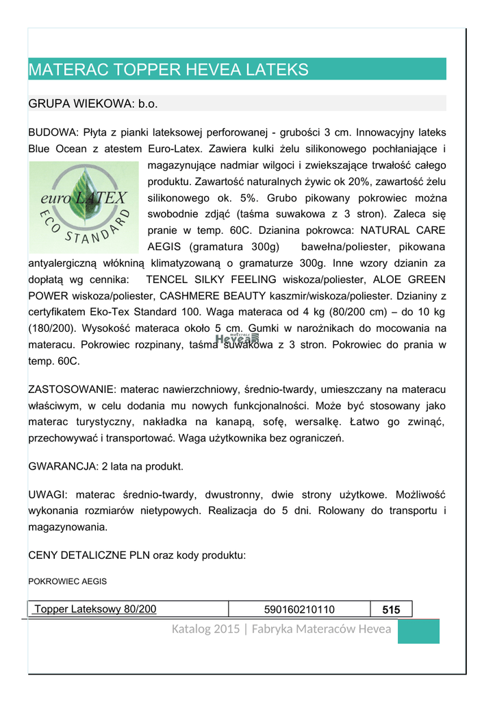 MATERAC TOPPER HEVEA LATEKS GRUPA WIEKOWA: b.o. BUDOWA: Płyta z pianki lateksowej perforowanej - grubości 3 cm. Innowacyjny lateks Blue Ocean z atestem Euro-Latex. Zawiera kulki żelu silikonowego pochłaniające i magazynujące nadmiar wilgoci i zwiekszające trwałość całego produktu. Zawartość naturalnych żywic ok 20%, zawartość żelu silikonowego ok. 5%. Grubo pikowany pokrowiec można swobodnie zdjąć (taśma suwakowa z 3 stron). Zaleca się pranie w temp. 60C. Dzianina pokrowca: NATURAL CARE AEGIS (gramatura 300g) bawełna/poliester, pikowana antyalergiczną włókniną klimatyzowaną o gramaturze 300g. Inne wzory dzianin za dopłatą wg cennika: TENCEL SILKY FEELING wiskoza/poliester, ALOE GREEN POWER wiskoza/poliester, CASHMERE BEAUTY kaszmir/wiskoza/poliester. Dzianiny z certyfikatem Eko-Tex Standard 100. Waga materaca od 4 kg (80/200 cm) – do 10 kg (180/200). Wysokość materaca około 5 cm. Gumki w narożnikach do mocowania na materacu. Pokrowiec rozpinany, taśma suwakowa z 3 stron. Pokrowiec do prania w temp. 60C. ZASTOSOWANIE: materac nawierzchniowy, średnio-twardy, umieszczany na materacu właściwym, w celu dodania mu nowych funkcjonalności. Może być stosowany jako materac turystyczny, nakładka na kanapą, sofę, wersalkę. Łatwo go zwinąć, przechowywać i transportować. Waga użytkownika bez ograniczeń. GWARANCJA: 2 lata na produkt. UWAGI: materac średnio-twardy, dwustronny, dwie strony użytkowe. Możliwość wykonania rozmiarów nietypowych. Realizacja do 5 dni. Rolowany do transportu i magazynowania. CENY DETALICZNE PLN oraz kody produktu: POKROWIEC AEGIS Topper Lateksowy 80/200 590160210110 515 Katalog 2015 | Fabryka Materaców Hevea Topper Lateksowy 90/200 Topper Lateksowy 120/200 Topper Lateksowy 140/200 Topper Lateksowy 160/200 Topper Lateksowy 180/200 590160210111 590160210112 590160210113 590160210114 590160210115 527 616 670 737 774 POKROWCE TENCEL SILKY FEELIN, ALOE GREEN POWER, CASHMERE BEAUTY Topper Lateksowy 80/200 Topper Lateksowy 90/200 Topper Lateksowy 120/200 Topper Lateksowy 140/200 Topper Lateksowy 160/200 Topper Lateksowy 180/200 590160210110 SF/AG/CB 590160210111 SF/AG/CB 590160210112 SF/AG/CB 590160210113 SF/AG/CB 590160210114 SF/AG/CB 590160210115 SF/AG/CB 580 592 706 760 827 864 Katalog 2015 | Fabryka Materaców Hevea Katalog 2015 | Fabryka Materaców Hevea