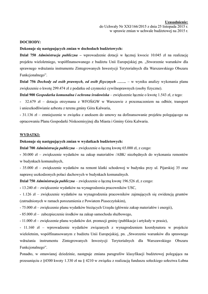 Uzasadnienie: do Uchwały Nr XXI/166/2015 z dnia 25 listopada 2015 r. w sprawie zmian w uchwale budżetowej na 2015 r. DOCHODY: Dokonuje się następujących zmian w dochodach budżetowych: Dział 750 Administracja publiczna – wprowadzenie dotacji w łącznej kwocie 10.045 zł na realizację projektu wieloletniego, współfinansowanego z budżetu Unii Europejskiej pn. „Stworzenie warunków dla sprawnego wdrażania instrumentu Zintegrowanych Inwestycji Terytorialnych dla Warszawskiego Obszaru Funkcjonalnego”. Dział 756 Dochody od osób prawnych, od osób fizycznych ……. – w wyniku analizy wykonania planu zwiększenie o kwotę 299.474 zł z podatku od czynności cywilnoprawnych (osoby fizyczne). Dział 900 Gospodarka komunalna i ochrona środowiska – zwiększenie łącznie o kwotę 1.543 zł, z tego: - 32.679 zł – dotacja otrzymana z WFOŚiGW w Warszawie z przeznaczeniem na odbiór, transport i unieszkodliwianie azbestu z terenu gminy Góra Kalwaria, - 31.136 zł – zmniejszenie w związku z aneksem do umowy na dofinansowanie projektu polegającego na opracowaniu Planu Gospodarki Niskoemisyjnej dla Miasta i Gminy Góra Kalwaria. WYDATKI: Dokonuje się następujących zmian w wydatkach budżetowych: Dział 700 Administracja publiczna – zwiększenie o łączną kwotę 65.000 zł, z czego: - 30.000 zł – zwiększenie wydatków na zakup materiałów /ABK/ niezbędnych do wykonania remontów w budynkach komunalnych, - 35.000 zł – zwiększenie wydatków na remont klatki schodowej w budynku przy ul. Pijarskiej 35 oraz naprawę uszkodzonych połaci dachowych w budynkach komunalnych. Dział 750 Administracja publiczna – zwiększenie o łączną kwotę 196.526 zł, z czego: - 13.240 zł – zwiększenie wydatków na wynagrodzenia pracowników USC, - 1.126 zł – zwiększenie wydatków na wynagrodzenia pracowników zajmujących się ewidencją gruntów (zatrudnionych w ramach porozumienia z Powiatem Piaseczyńskim), - 75.000 zł – zwiększenie planu wydatków bieżących Urzędu (głównie zakup materiałów i energii), - 85.000 zł – zabezpieczenie środków na zakup samochodu służbowego, - 11.000 zł – zwiększenie planu wydatków dot. promocji gminy (publikacje i artykuły w prasie), - 11.160 zł – wprowadzenie wydatków związanych z wynagrodzeniem koordynatora w projekcie wieloletnim, współfinansowanym z budżetu Unii Europejskiej, pn. „Stworzenie warunków dla sprawnego wdrażania instrumentu Zintegrowanych Inwestycji Terytorialnych dla Warszawskiego Obszaru Funkcjonalnego”. Ponadto, w omawianej dziedzinie, następuje zmiana paragrafów klasyfikacji budżetowej polegająca na przesunięciu z §4300 kwoty 1.330 zł na § 4210 w związku z realizacją funduszu sołeckiego sołectwa Łubna (korekta techniczna), jak również zmniejszenie planu wydatków bieżących a zwiększenie planu wydatków majątkowych o kwotę 17.220 zł dot. wykonania tablicy promocyjnej wraz z montażem. Dział 801 Oświata i wychowanie – zmniejszenie wydatków o łączna kwotę 137.360 zł, w tym: - 37.640 zł – zabezpieczenie środków na rozbudowę monitoringu w Zespole Szkół w Coniewie, - 9.500 zł – zabezpieczenie środków na zakup zestawu interaktywnego (dla Zespołu Szkół w Coniewie), - 1.283 zł – zwiększenie dotacji dla przedszkola niepublicznego „Baśniowy Domek” w związku z przyjęciem od listopada dodatkowego dziecka, - 170.000 zł – zwiększenie planu wydatków przeznaczonych na zwrot dotacji gminom, w związku z uczęszczaniem dzieci z terenu naszej gminy do niepublicznych przedszkoli działających na terenie innych gmin, - 400.000 zł – zmniejszenie planu wydatków na zadaniu inwestycyjnym polegającym na rozbudowie przedszkola w Wilczynku – w związku z ujawnieniem się spadkobiercy nieruchomości, w której mieści się przedszkole, nakłady inwestycyjne zostaną odroczone do chwili wyjaśnienia stanu prawnego, - 14.000 zł - zwiększenie planu wydatków przeznaczonych na zwrot dotacji gminom, w związku z uczęszczaniem dzieci z terenu naszej gminy do niepublicznych oddziałów przedszkolnych działających na terenie innych gmin, - 6.000 zł – zabezpieczenie środków na zakup pieca konwekcyjno – parowego dla stołówki w przedszkolu w Wilczynku, - 24.217 zł – zwiększenie planu wydatków bieżących w placówkach oświatowych (analiza wykonania). Dział 854 Edukacyjna opieka wychowawcza – zmniejszenie planu wydatków o łączną kwotę 30.217 zł, z tego: - 9.417 zł – zmniejszenie planu wydatków przeznaczonych na funkcjonowanie świetlic szkolnych (oszczędności w planie), - 20.800 zł – zmniejszenie wydatków przeznaczonych na inne formy wypoczynku dzieci i młodzieży szkolnej (oszczędności w planie). Dział 900 Gospodarka komunalna i ochrona środowiska – zwiększenie planu wydatków o łączną kwotę 181.049 zł, z tego: - 32.679 zł – zwiększenie planu wydatków na odbiór i utylizację azbestu, - 36.630 zł – zmniejszenie planu na realizację projektu polegającego na opracowaniu Planu Gospodarki Niskoemisyjnej dla Miasta i Gminy Góra Kalwaria (w wyniku przeprowadzonego postepowania), - 25.000 zł – zwiększenie planu z przeznaczeniem na utrzymanie bezdomnych zwierząt w schronisku, - 160.000 zł – zwiększenie planu wydatków z przeznaczeniem na zakup energii elektrycznej oświetlenia ulicznego. Dział 921 Kultura i ochrona dziedzictwa narodowego – zwiększenie o łączną kwotę 36.064 zł, z tego: - 10.000 zł – zwiększenie dotacji podmiotowej dla Ośrodka Kultury w Górze Kalwarii, - 12.084 zł - zwiększenie dotacji podmiotowej dla Gminnej Biblioteki Publicznej w Górze Kalwarii, - 5.280 zł – wprowadzenie dotacji celowej dla Gminnej Biblioteki Publicznej w Górze Kalwarii z przeznaczeniem na wkład własny w projekcie pn. „Kraszewski. Komputery dla bibliotek 2015”, - 8.700 zł – wprowadzenie dotacji celowej dla Gminnej Biblioteki Publicznej w Górze Kalwarii z przeznaczeniem na 