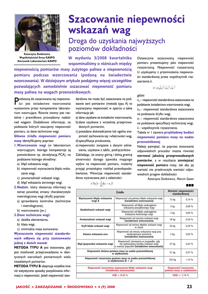 Szacowanie niepewności wskazań wag Droga do uzyskania najwyŜszych poziomów dokładności Katarzyna Dutkiewicz Współwłaściciel firmy KASPO Kierownik Laboratorium KASPO W wydaniu 3/2008 kwartalnika wspominaliśmy o róŜnicach między niepewnością pomiarów masy zuŜytego paliwa a niepewnością pomiaru podczas wzorcowania (podaną na świadectwie wzorcowania). W dzisiejszym artykule podajemy więcej szczegółów pozwalających samodzielnie oszacować niepewność pomiaru masy paliwa na wagach przenośnikowych. Ostatecznie oszacowaną niepewność pomiaru prezentujemy jako niepewność rozszerzoną. Niepewność rozszerzoną U uzyskujemy z przemnoŜenia niepewności standardowej przez współczynnik rozszerzenia k. P uA – niepewność standardowa oszacowana na odstawą do oszacowania tej niepewności jest świadectwo wzorcowania wystawione przez kompetentne laboratorium wzorcujące. Równie istotny jest rzetelnie i prawidłowo prowadzony nadzór nad wagami. Dodatkowe informacje, na podstawie których szacujemy niepewność pomiaru, to dane techniczne wagi. Główne źródła niepewności pomiaru masy identyfikujemy poprzez: 1. Wzorcowanie wagi (w laboratorium wzorcującym, którego kompetencje są potwierdzone np. akredytacją PCA), na podstawie którego określimy: a) błąd wskazania wagi, b) niepewność wyznaczenia błędu wskazania wagi, c) powtarzalność wskazań wagi, d) błąd wskazania zerowego wagi. 2. Nadzór, który dostarcza informacji na temat powolnej zmiany charakterystyki metrologicznej wagi (dryft) poprzez: a) sprawdzenia kontrolne (techniczne i metrologiczne), b) wzorcowanie (jw.). 3. Dane techniczne wagi: a) działka elementarna, b) klasa wagi, c) minimalna masa sumowania. Wyznaczenie niepewności standardowych odbywa się przy zastosowaniu jednej z dwóch metod: METODA TYPU A jest stosowana, gdy jest moŜliwość przeprowadzenia w identycznych warunkach pomiarowych wielu niezaleŜnych pomiarów. METODA TYPU B obejmuje wszelkie inne niŜ statystyczne sposoby pozyskiwania informacji o niepewności. JeŜeli niepewność stanJAKOŚĆ ZARZĄDZANIE dardowa nie moŜe być oszacowana na podstawie serii pomiarów (metoda typu A) to wyznaczamy niepewność w oparciu o takie informacje jak: a) dane uzyskane ze świadectw wzorcowania, b) dane uzyskane z wcześniej przeprowadzonych pomiarów, c) posiadane doświadczenie lub ogólna znajomość zachowania się i właściwości wag, d) specyfikacja producenta, e) niepewności związane z danymi odniesienia, uzyskane z tablic, podręczników. Zakładając, Ŝe znamy górną i dolną granicę zmienności danego zjawiska mającego wpływ na niepewność pomiaru, moŜemy przyjąć prostokątny rozkład prawdopodobieństwa. Wówczas niepewność standardowa wyznaczana jest z zaleŜności: gdzie: podstawie świadectwa wzorcowania wagi, uB – niepewność standardowa oszacowana na podstawie dryftu wagi, uC – niepewność standardowa oszacowana na podstawie specyfikacji technicznej wagi, k – współczynnik rozszerzenia. Tabela nr 1 zawiera przykładowy budŜet niepewności pomiaru masy na wadze przenośnikowej. NaleŜy pamiętać, Ŝe poprzez stosowanie odpowiednich procedur moŜna równieŜ sterować jakością przeprowadzanych pomiarów, a w rezultacie zmniejszać niepewność pomiaru masy, tak aby jej wartość nie przekroczyła wartości odpowiednich progów dokładności. Katarzyna Dutkiewicz, Marcin Sazon Źródło Wyznaczenie błędu wskazania wagi B Wartość niepewności standardowej Niepewność od pomiaru błędu wskazania wagi (świadectwo wzorcowania) 12 kg 0,14 % Niepewność od błędu zaokrąglenia wskazania początkowego wagi 3 kg 0,04 % Niepewność od błędu zaokrąglenia wskazania końcowego wagi 3 kg 0,04 % Powtarzalność wskazań wagi Niepewność od rozrzutu wskazań wagi (świadectwo wzorcowania) 18 kg 0,20 % Dryft błędu wskazań wagi Niepewność od zmiany błędów wskazań wagi w czasie 26 kg 0,29 % Zmiana wskazania zera Niepewność od zmiany wskazania wagi przy nieobciąŜonym pomoście (świadectwo wzorcowania) 2 kg 0,03 % Błąd (poprawka) wskazania wagi Niepewność stosowana w przypadku, gdy nie wykonujemy korekty wskazań wagi o wartość poprawki (świadectwo wzorcowania) 37 kg 0,42 % Niepewność złoŜona pomiaru masy na wadze przenośnikowej w uŜytkowaniu 51 kg 0,57 % Niepewność rozszerzona pomiaru masy na wadze przenośnikowej w uŜytkowaniu (k = 2) 102 kg 1,14 % Rozdzielczość wskazań wagi Niepewność rozszerzona wyznaczenia błędu wskazania wagi (świadectwo wzorcowania) Niepewność rozszerzona pomiaru masy w uŜytkowaniu U(B) = 0,32 % U(W) = 1,14 % ŚRODOWISKO 4 (9) 2008 23